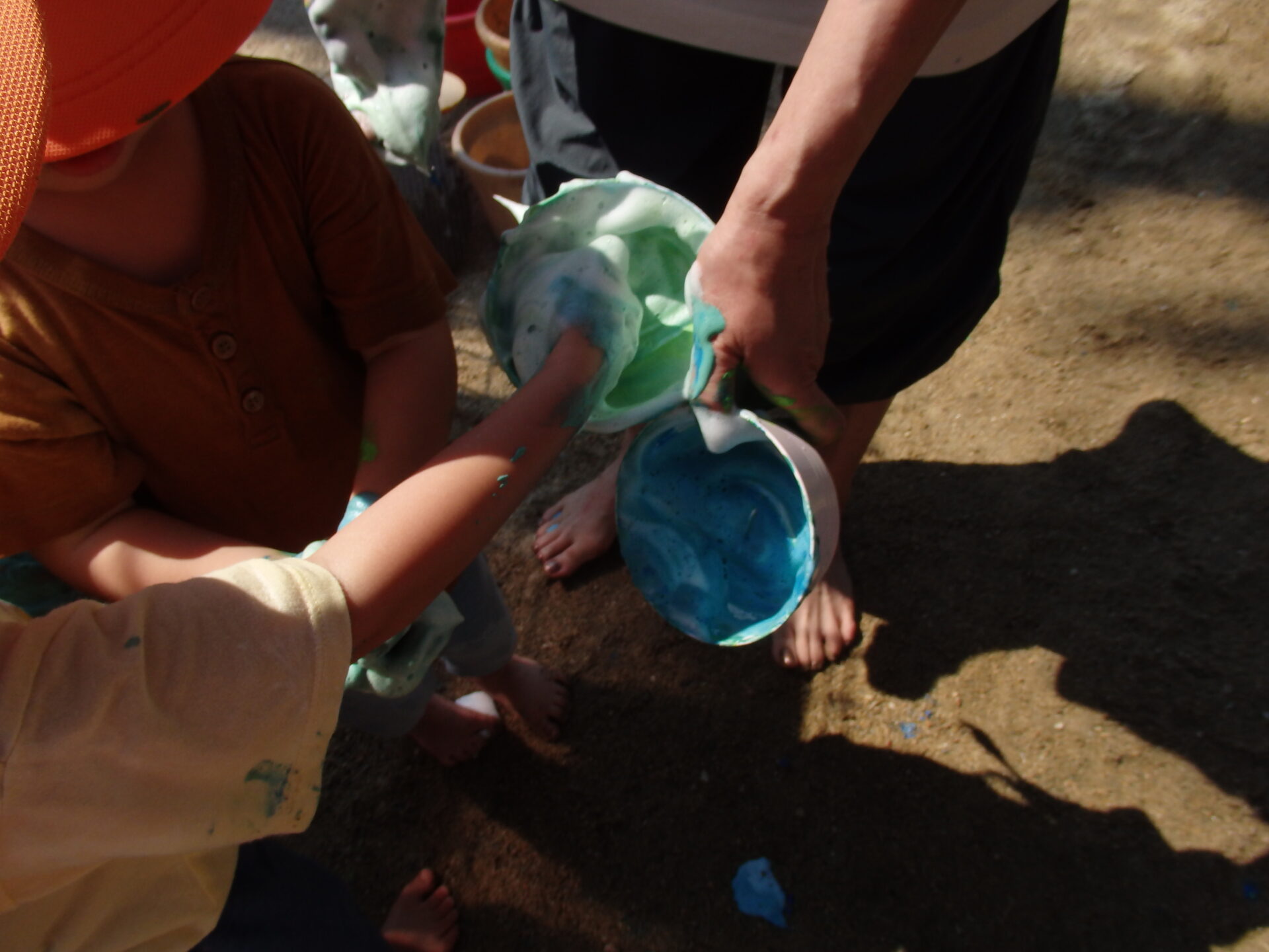 まだまだ遊び足りないあめ組の子供たちに、絵の具と石鹸を混ぜて色付きの泡を見せると、
