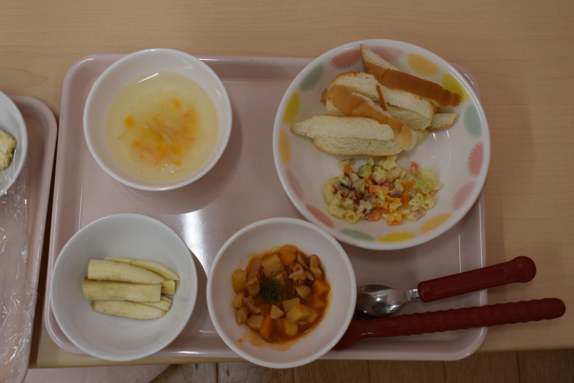 鶏肉と大豆のトマト煮・マカロニサラダ・コンソメスープ・ロールパン・バナナです。