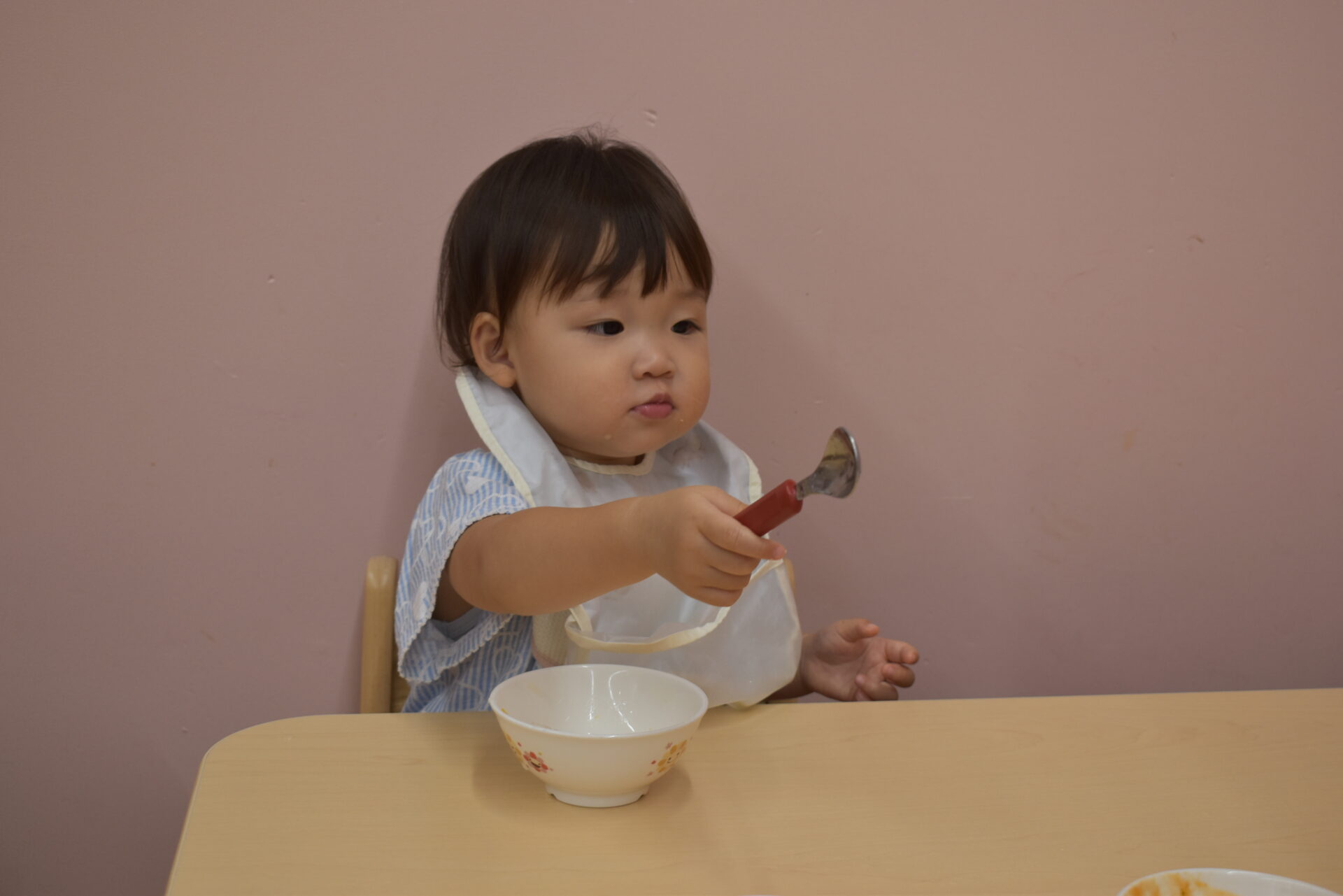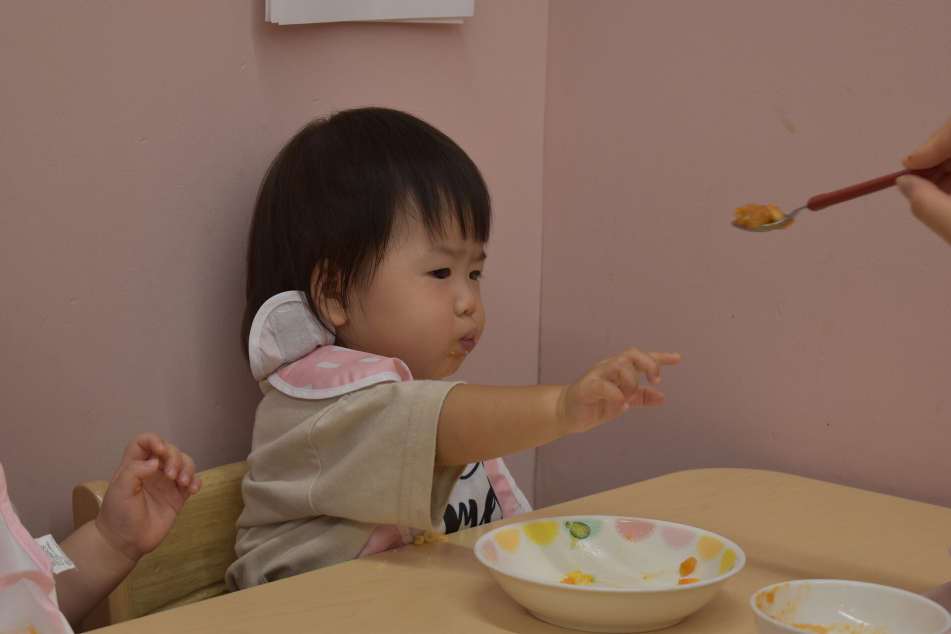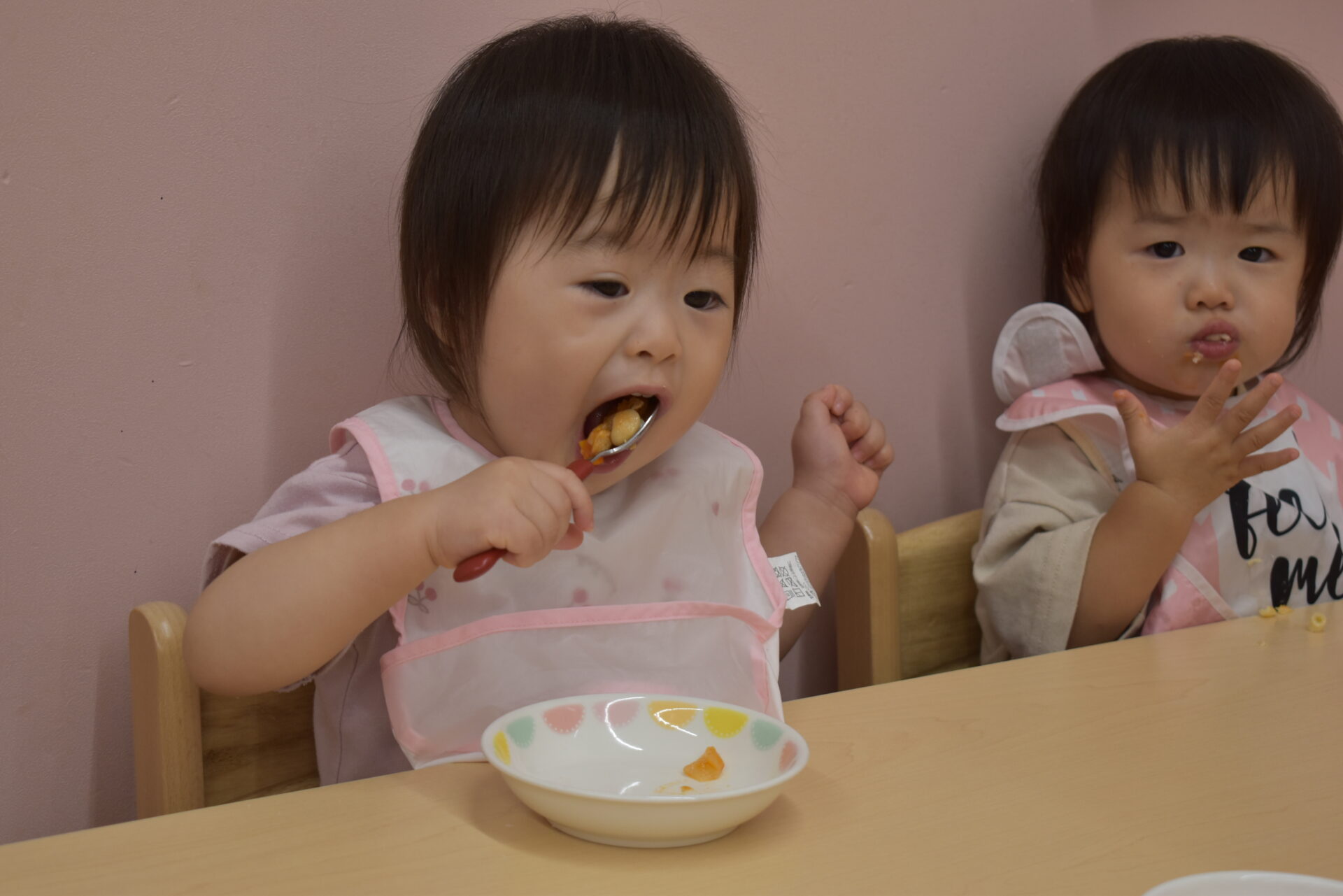 お皿ごとひっくり返してしまったり、口に次々詰め込んでしまう年齢でもあるので、0歳児クラスは小皿に取り分けて自分で食べられるように工夫しています!