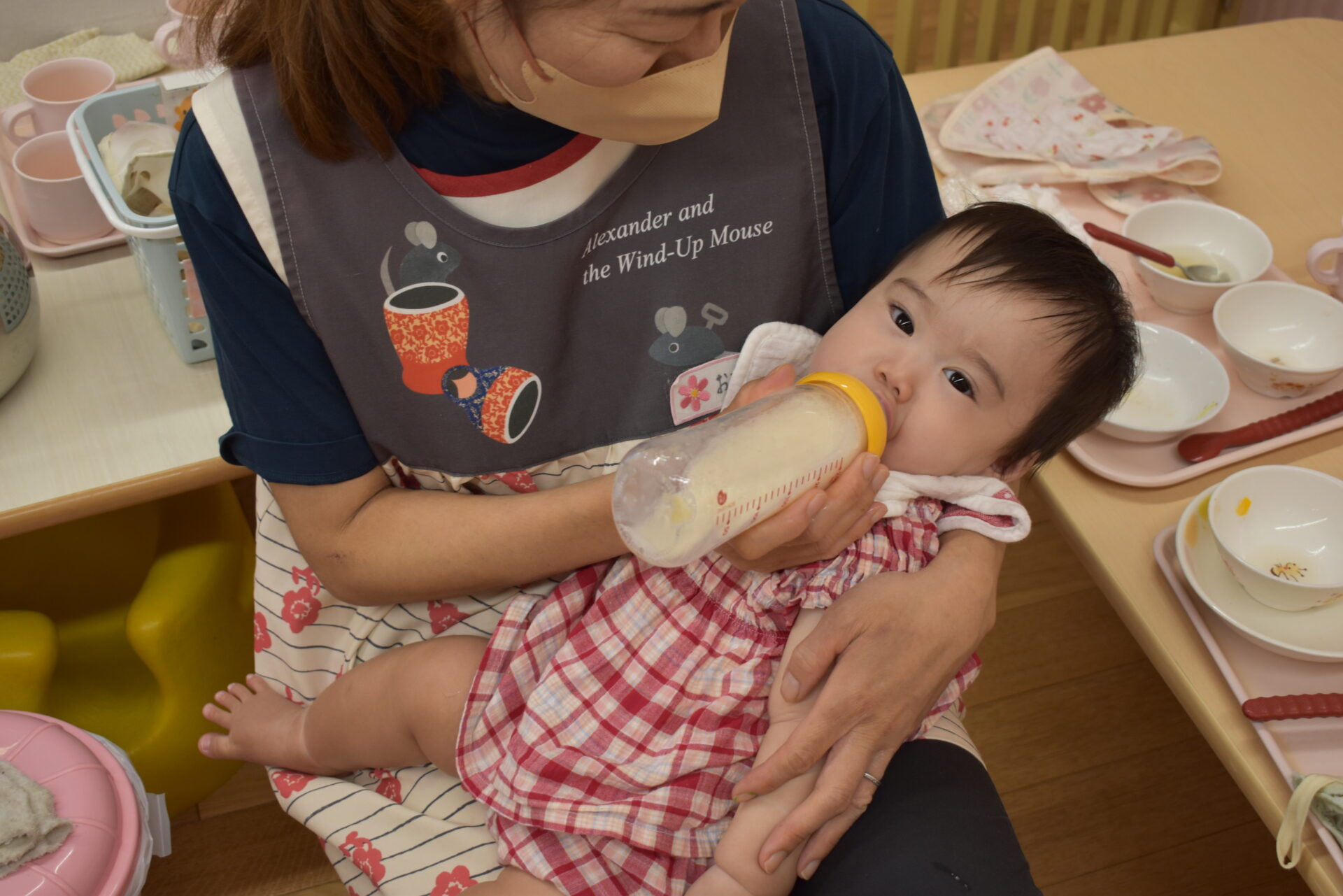 保育士に目と合わせて、安心感の中で飲みます。