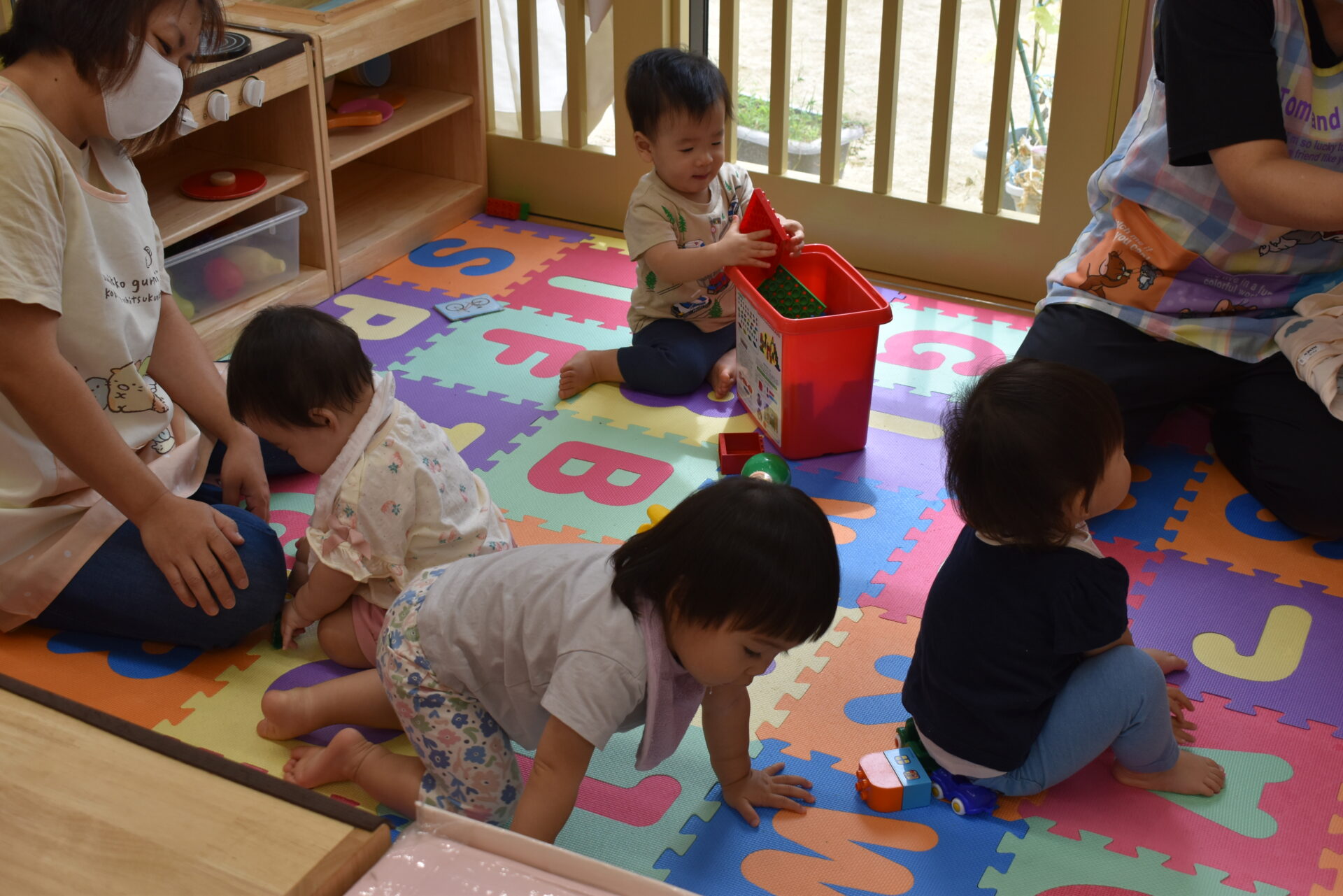 前半食事の子は、食後のお着換えをしたり、保育士と一緒に遊んだり……