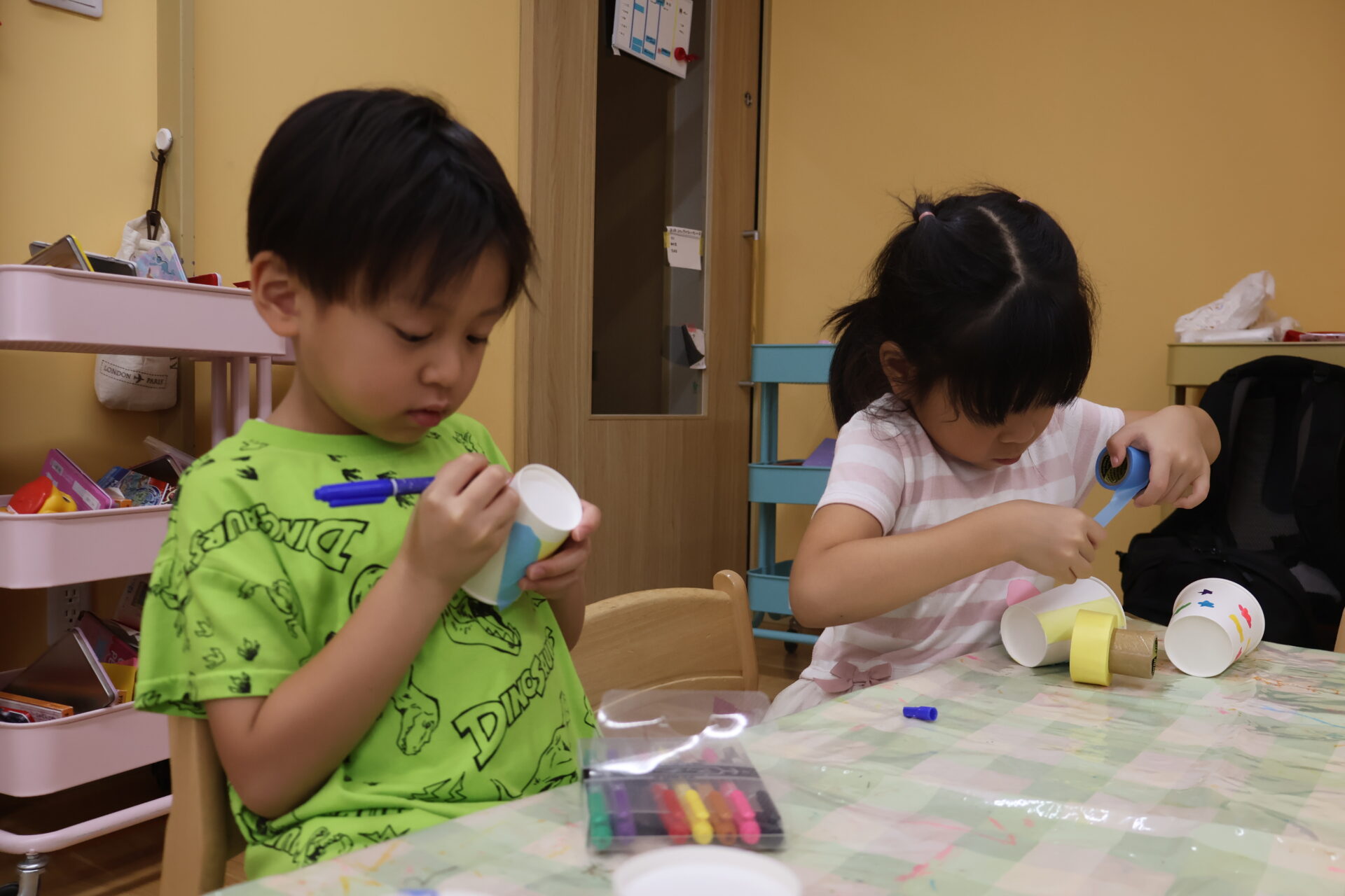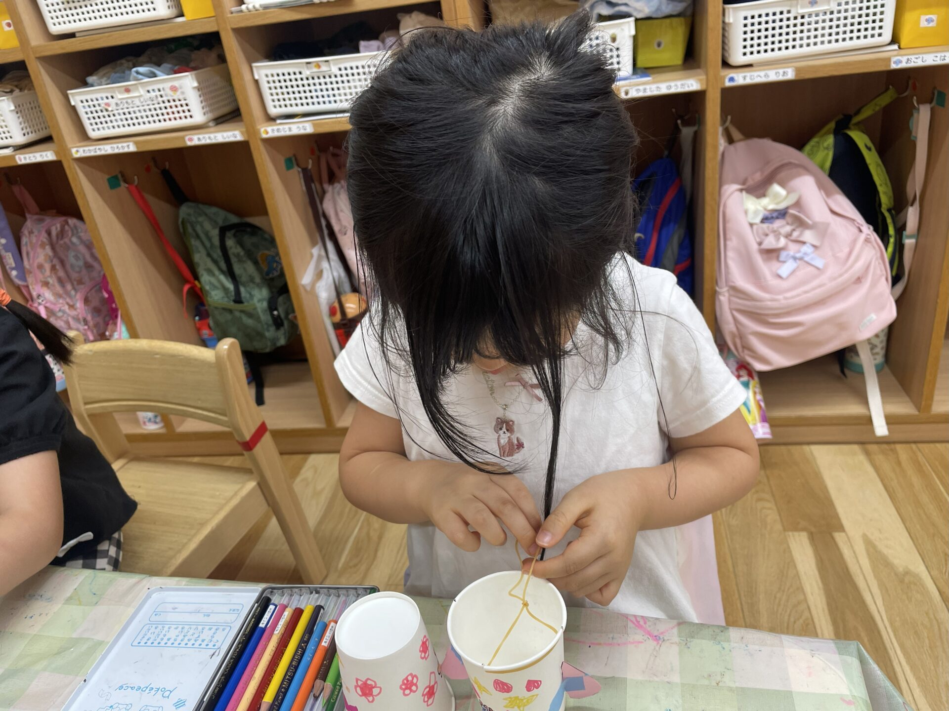紙コップを使って作る事を伝えると、どうやって飛ぶの?と不思議そうな子ども達でしたが、絵本や製作の経験から「輪ゴム使うんでしょ?」と正解を見つける事もできていました👏