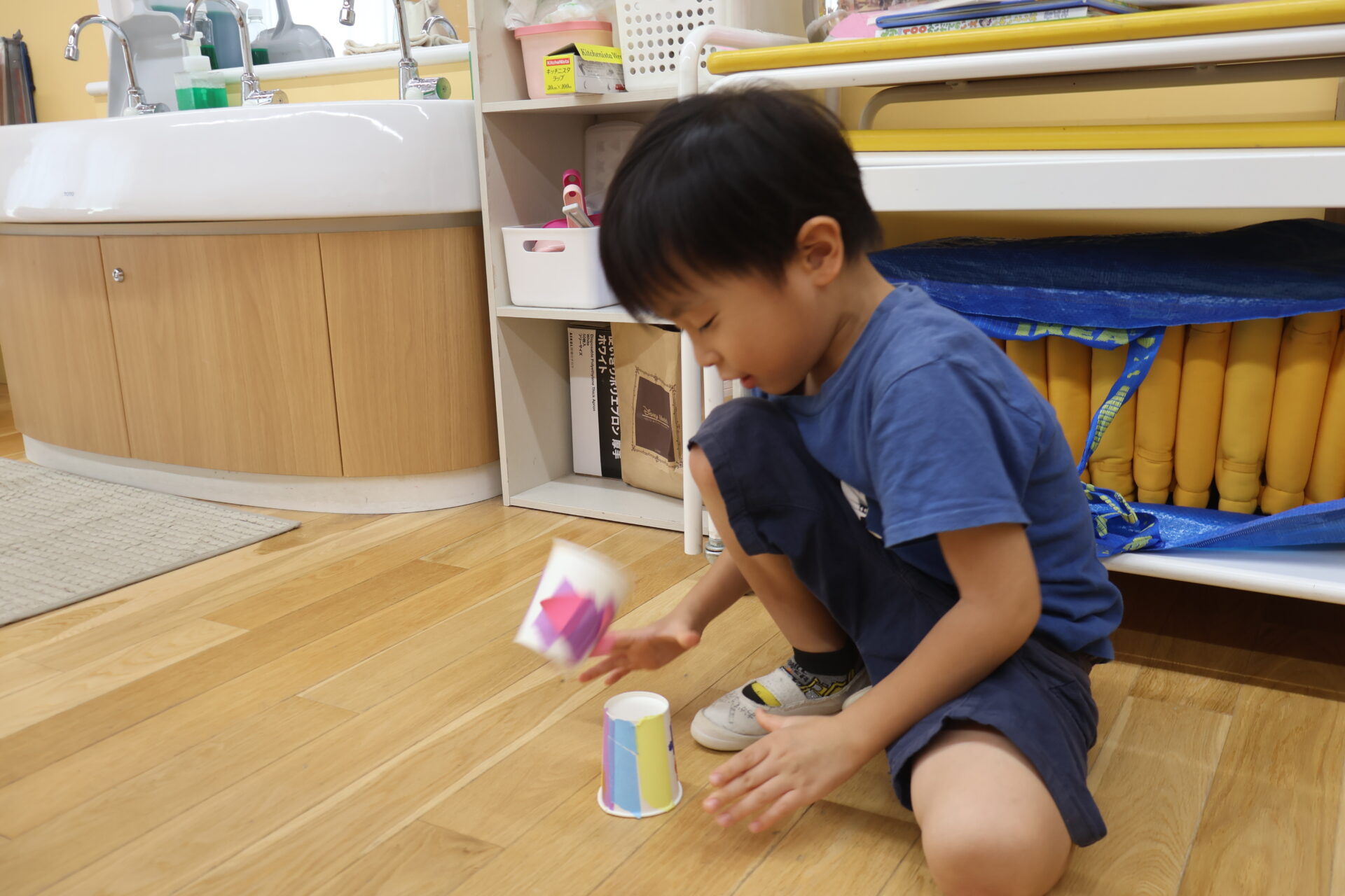 最初は上手く飛ばず、どうしてだろうと考える様子もありましたが、上手に飛ばしている友だちの方法を見て学び、紙コップを持つ位置を変えて無事に成功です!