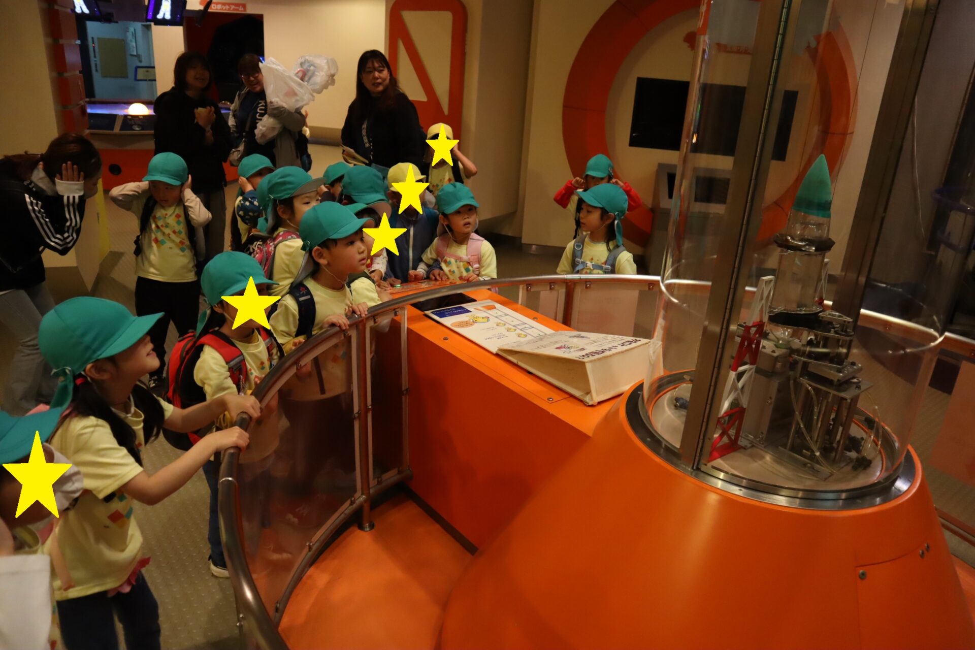 スイッチを押すとロケットが発射される展示があり、みんなでボタンを押して楽しんでいました!