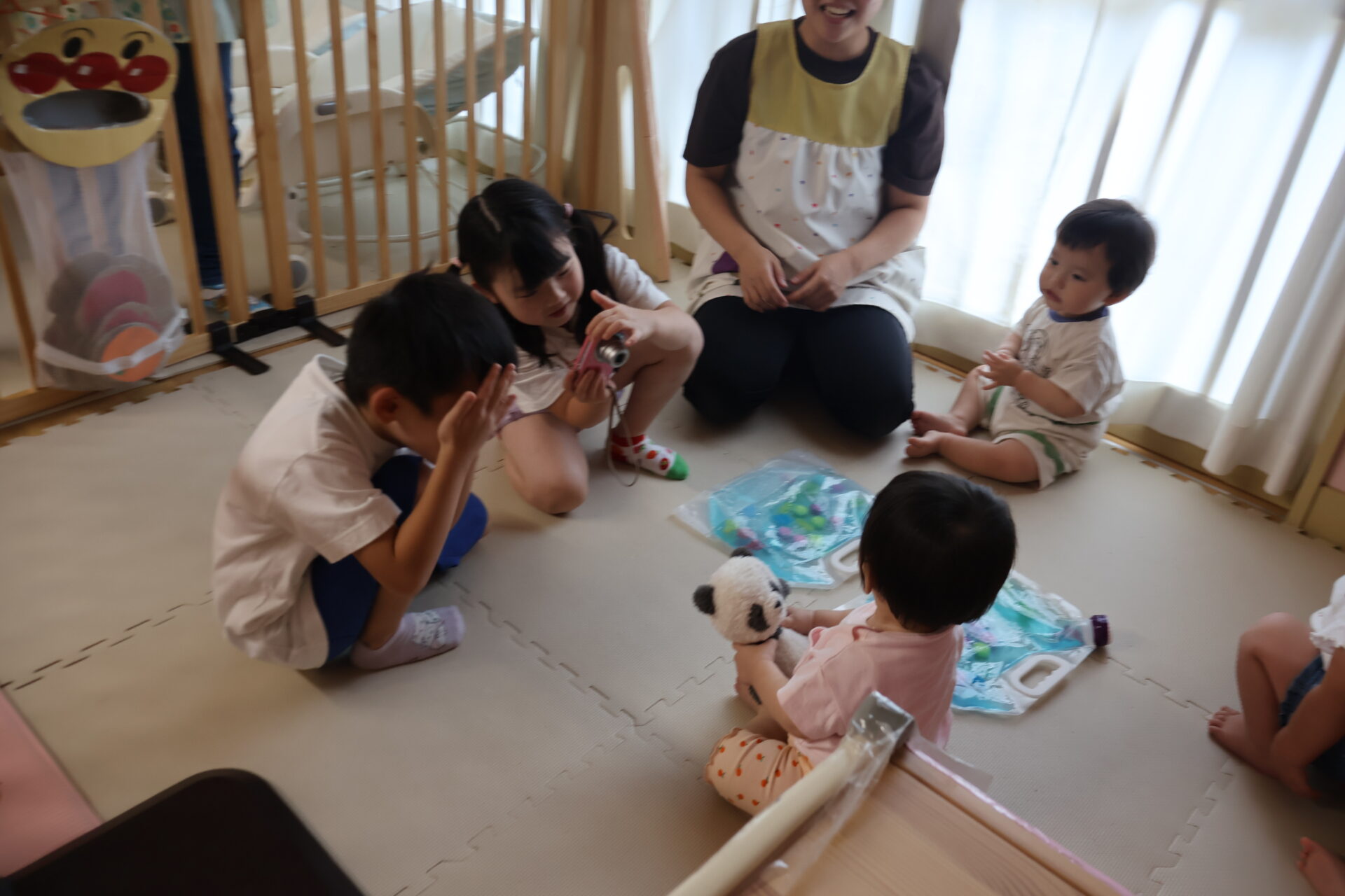 お兄さんお姉さんがお部屋に来ると、少し緊張している様子で見ていて、カメラを向けてみても、「あかちゃん全然笑ってない!どうしたら笑ってくれるん?」と考え始めた子ども達。