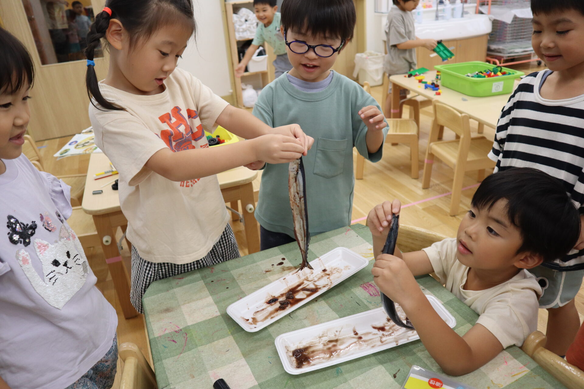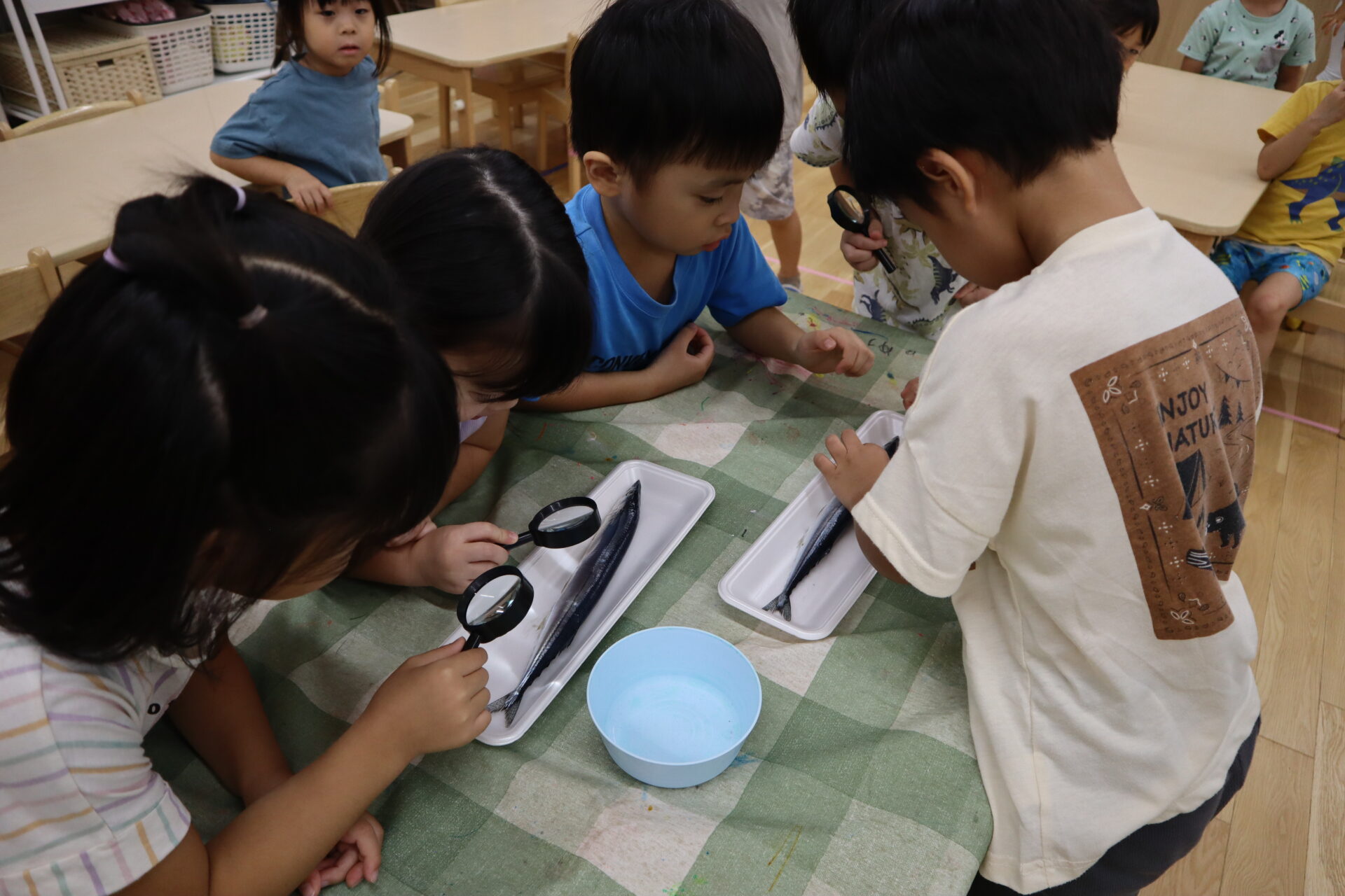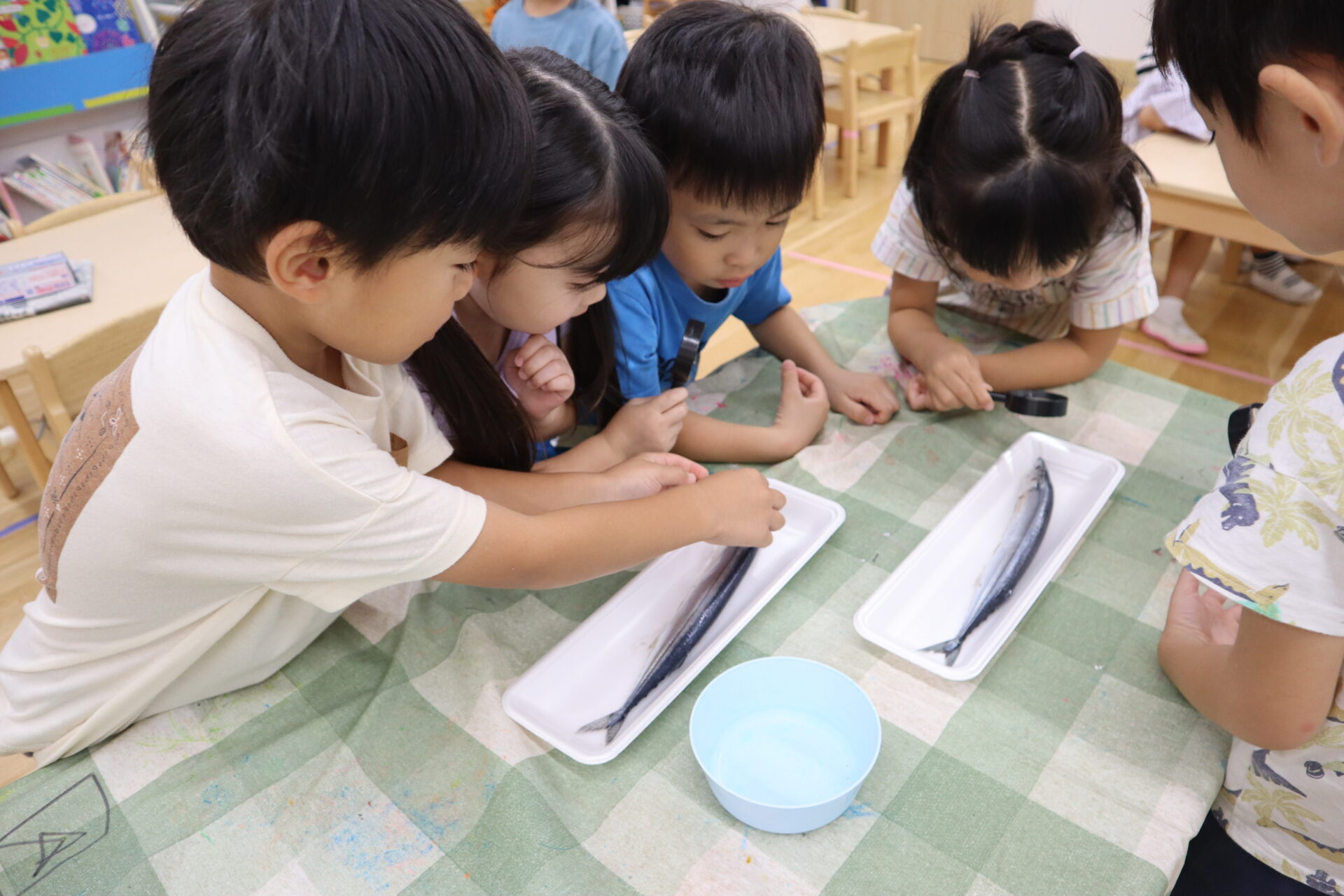 「先生!さんまの口、黄色だよ」と教えてくれたり、「つるつるしてる!」と実際に触って楽しむ子ども達です!