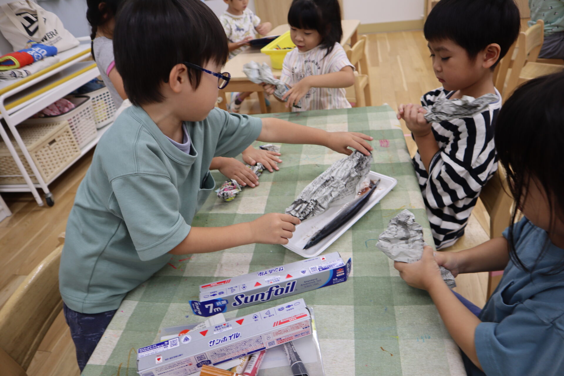 その後は、新聞紙とアルミホイルを使いサンマを作りました。