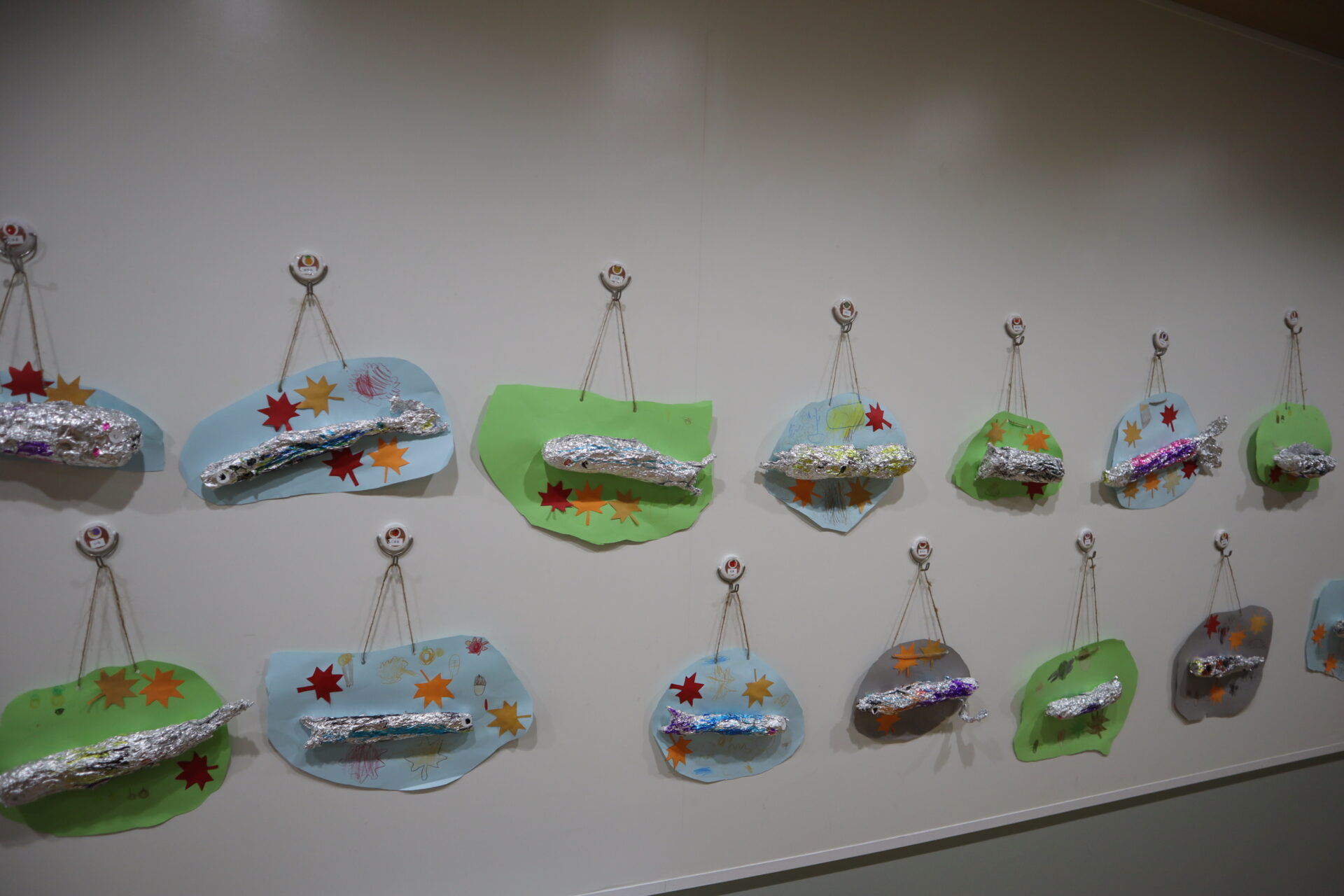 新聞紙で魚を作るのが大変でしたが、本物のさんまを見ながら長さや大きさを自分で調節し、製作を楽しむ子ども達でした。