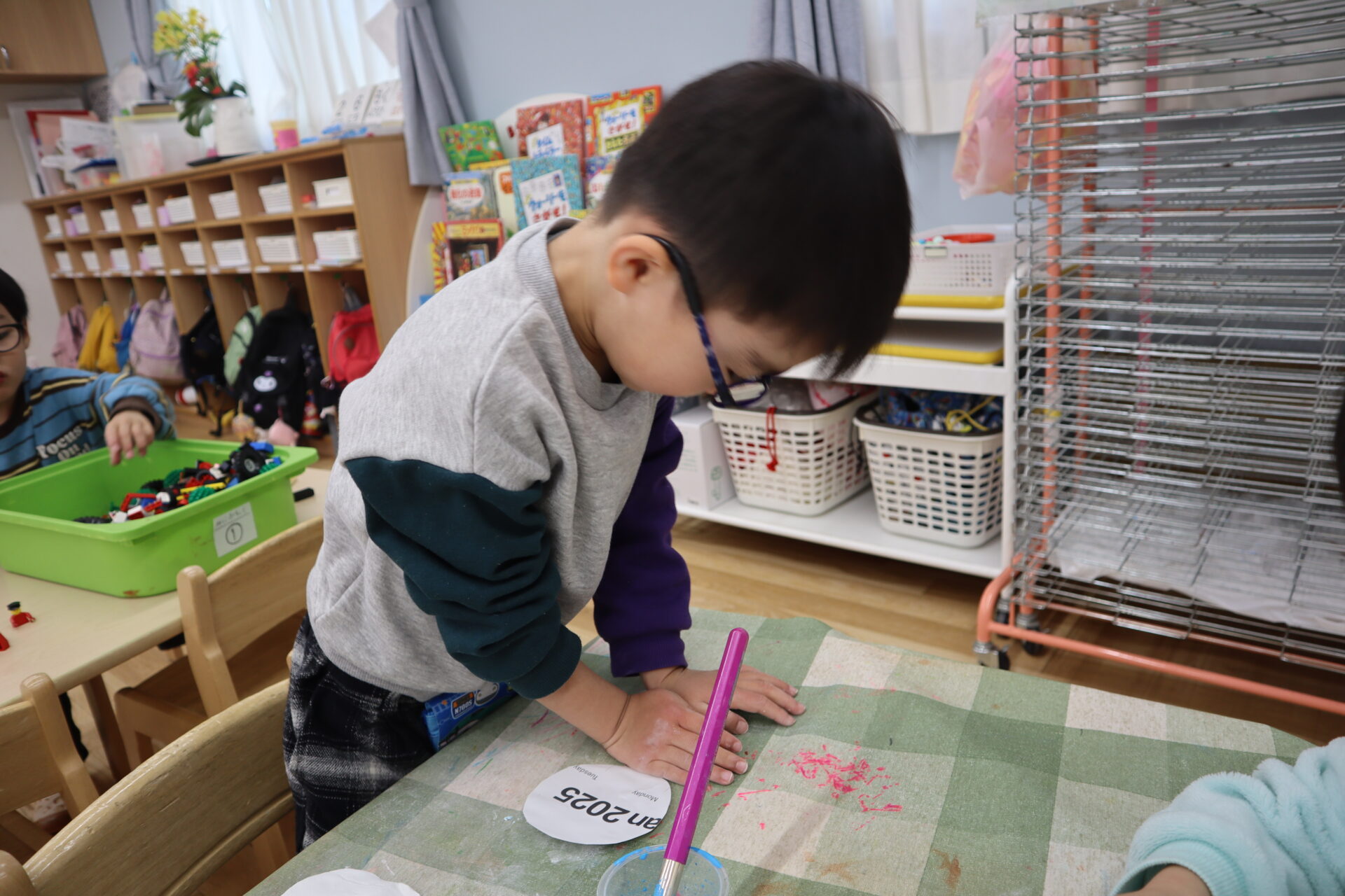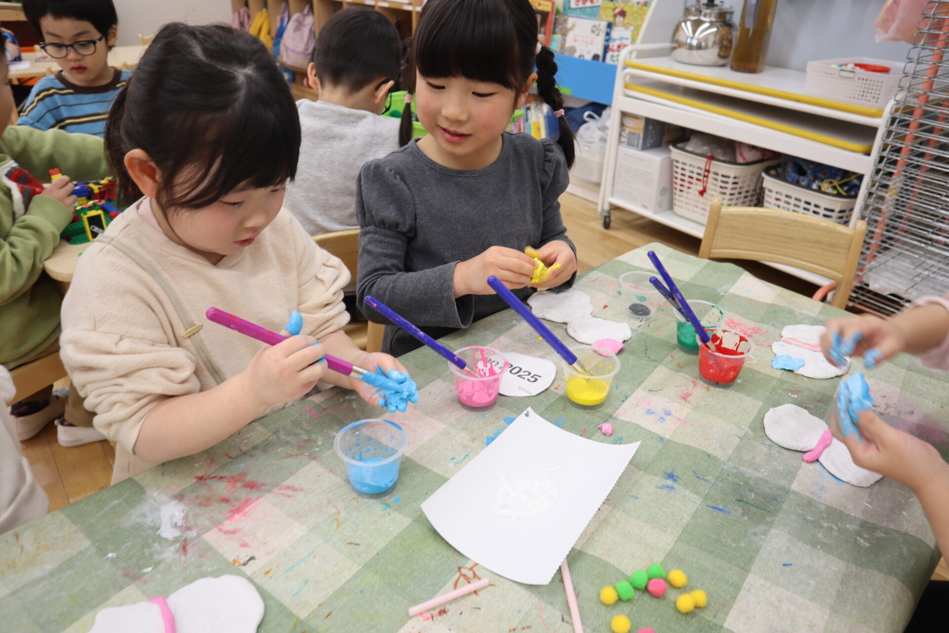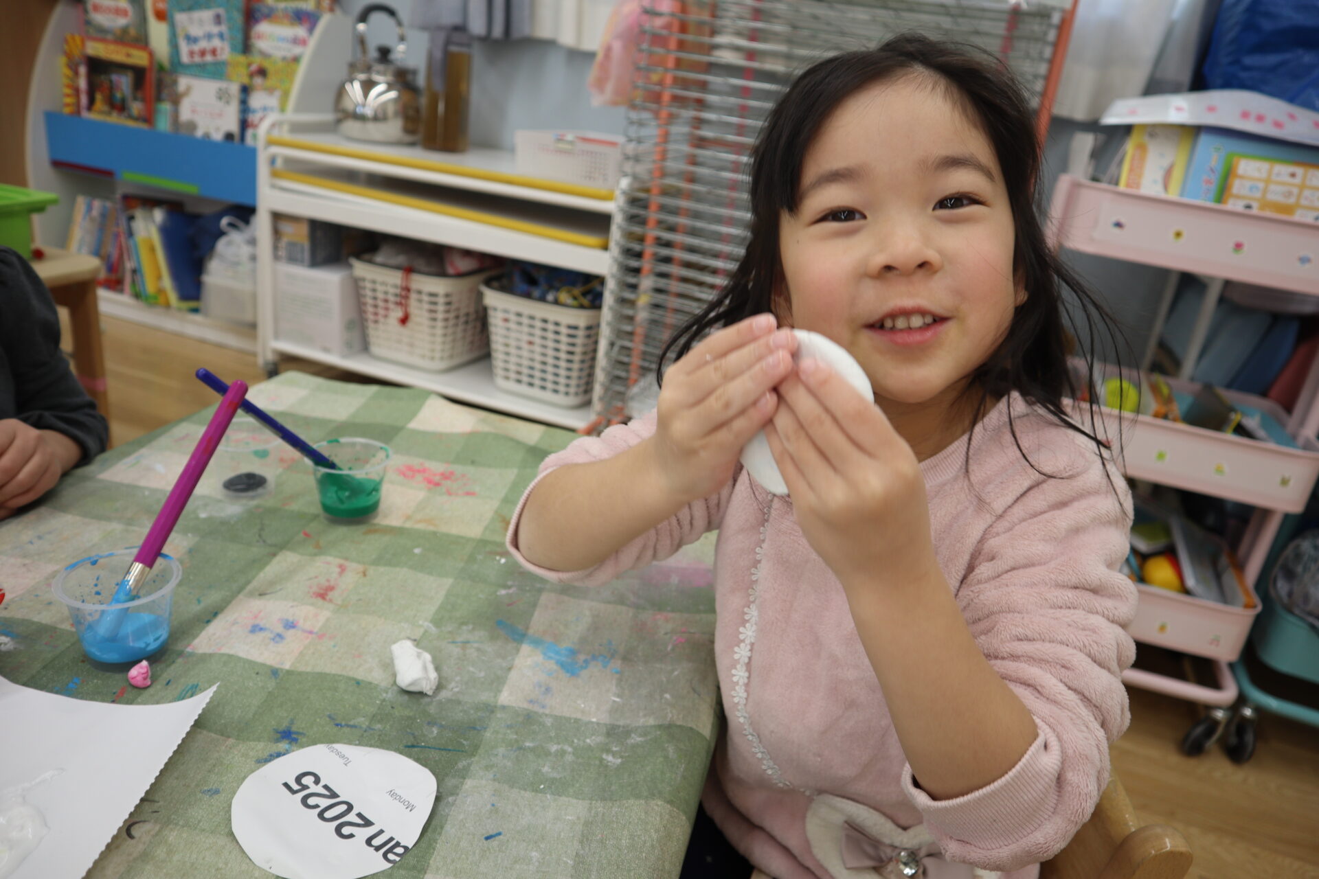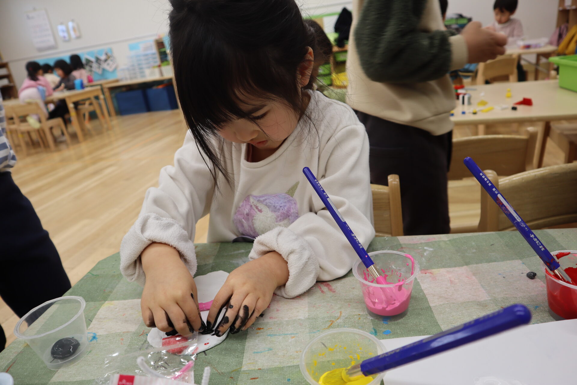 その後、絵の具が付いた手を水で洗うと、石鹸が絵の具の色になり、「先生みて!黄色になった!と大興奮でした!