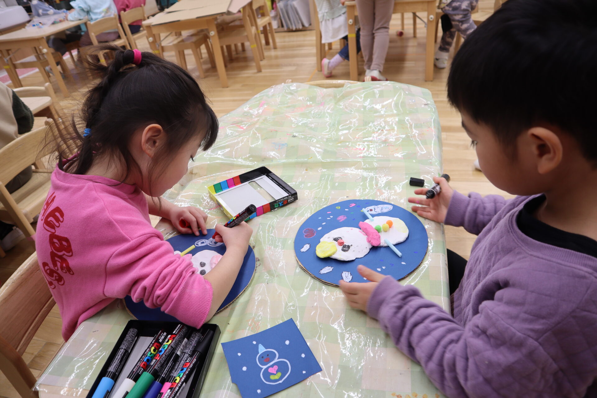 最後はポスカで雪を降らしらり、小さな雪だるまを描いたりとお絵かきを楽しんでいました😊