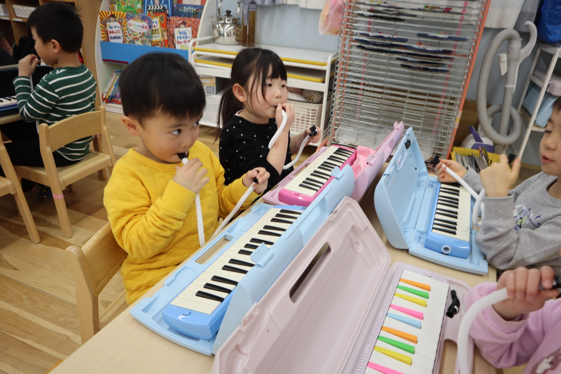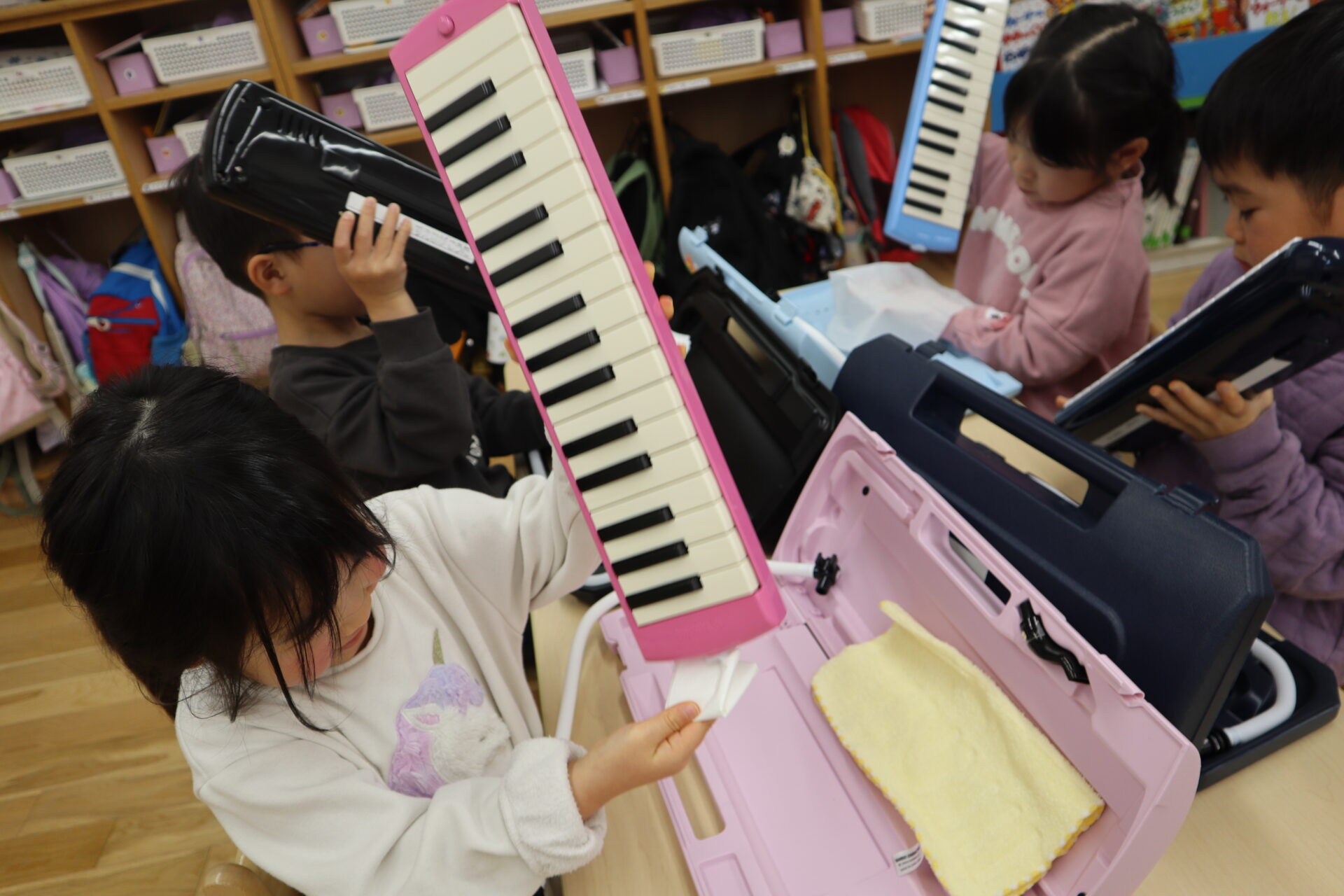 机まで持ってくると友だち同士で自分のピアニカを見せ合ったり、友だちと同じ色のピアニカで喜んでいました。