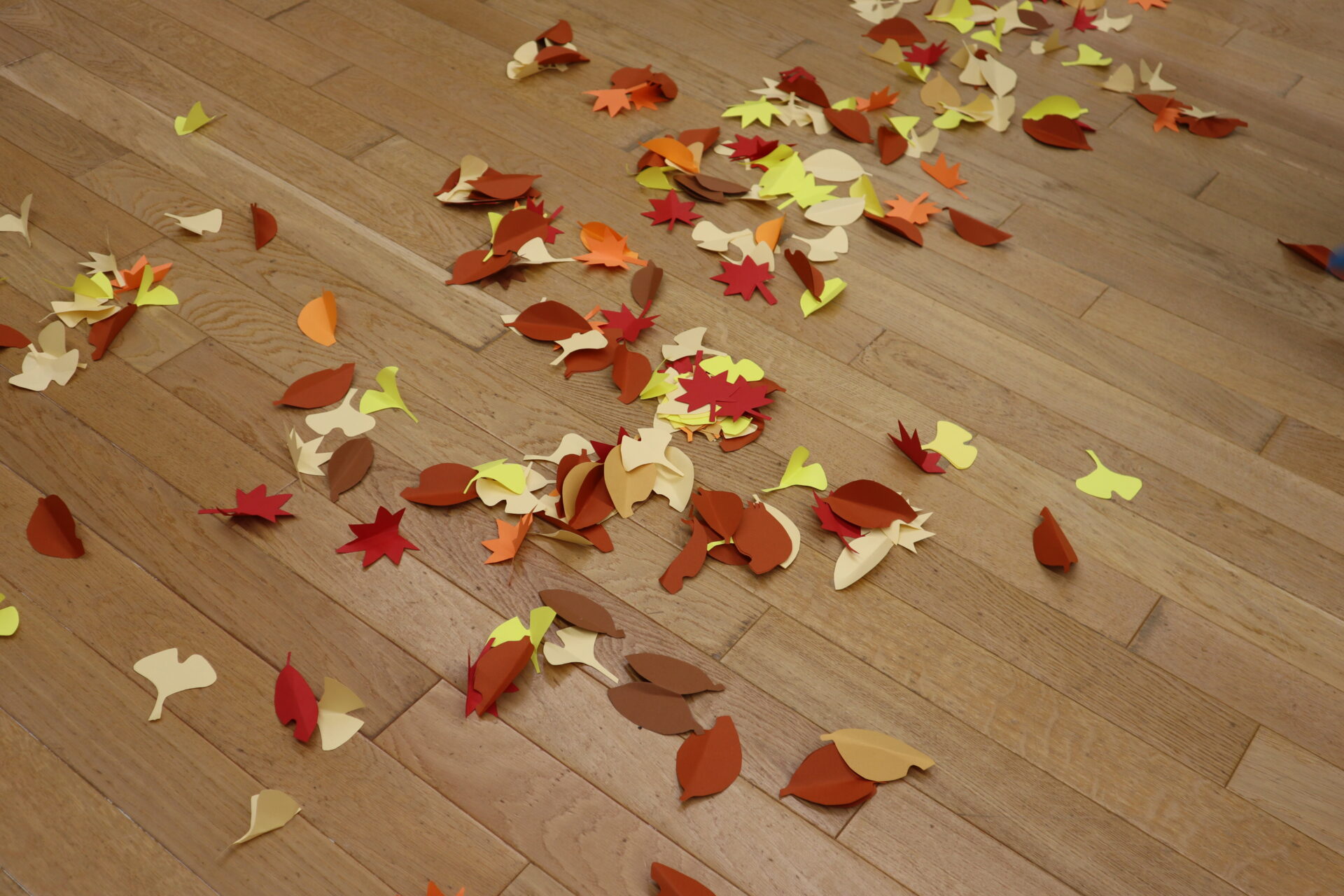 保育室に画用紙で作った落ち葉を散らし、落ち葉を鞄に入れる練習をしました。