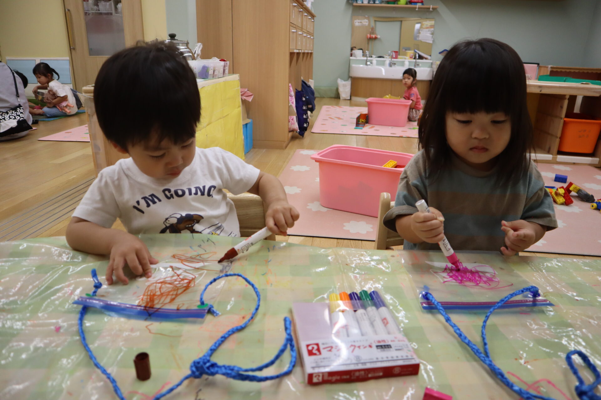 鞄を作る前に鞄の使い道について説明をすると、「葉っぱいっぱい入れる!」「鞄作る!」と楽しみな子ども達です。お絵描きが好きなクラスで、鞄いっぱいにペンを走らせたり色んな色を使いながら絵を書いていました。