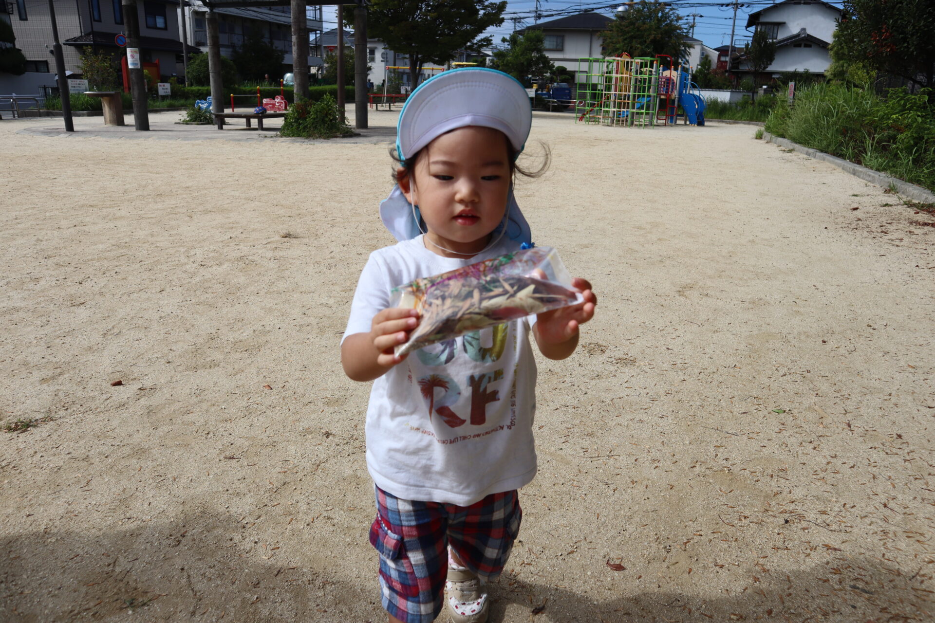保育室で落ち葉を拾う練習を終え、別日に公園に行き落ち葉を拾いました。