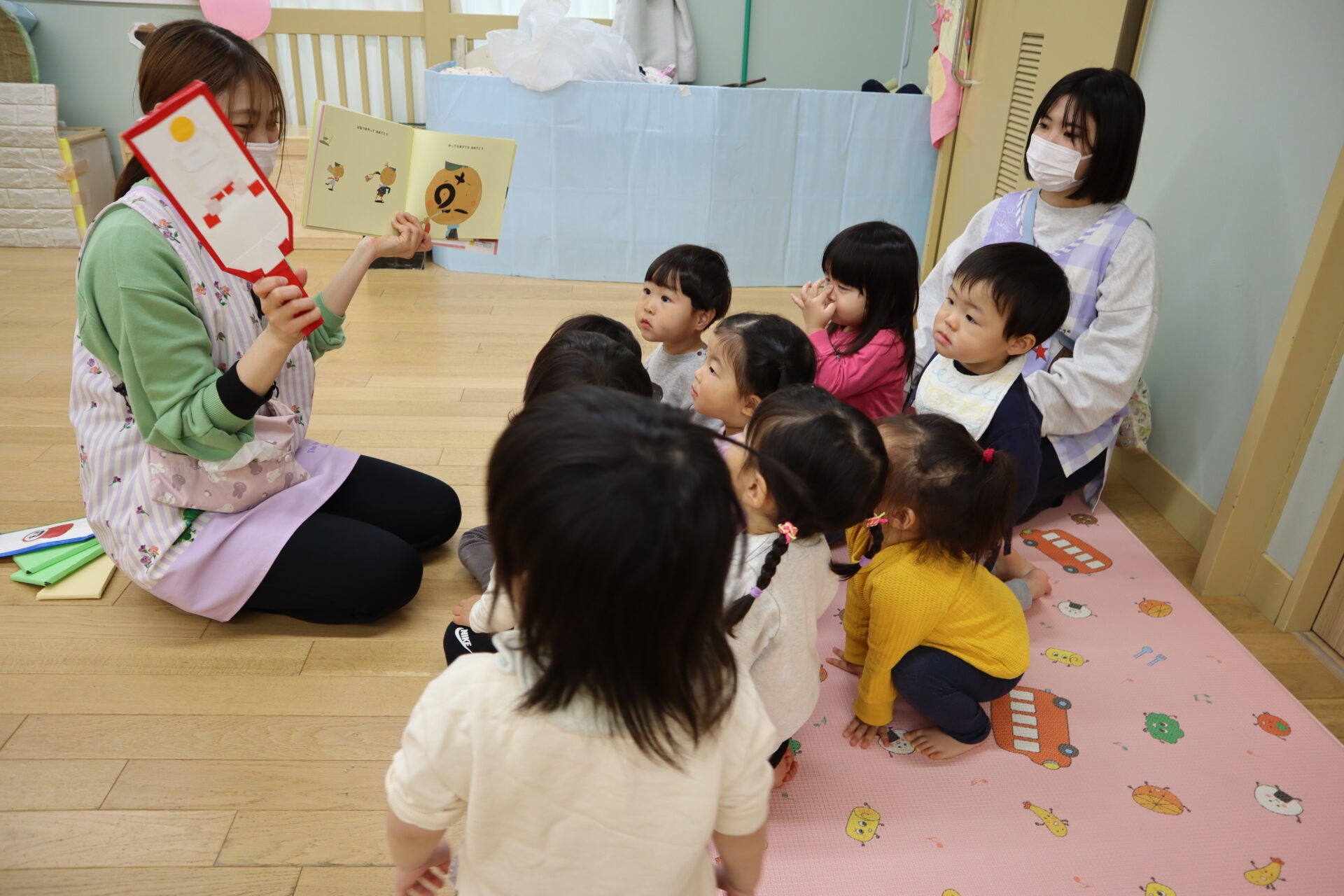 絵本を見ながらお正月遊びに付いてお話をしていると、「これ何?」「風船叩くの?」と質問をする子ども達でした!