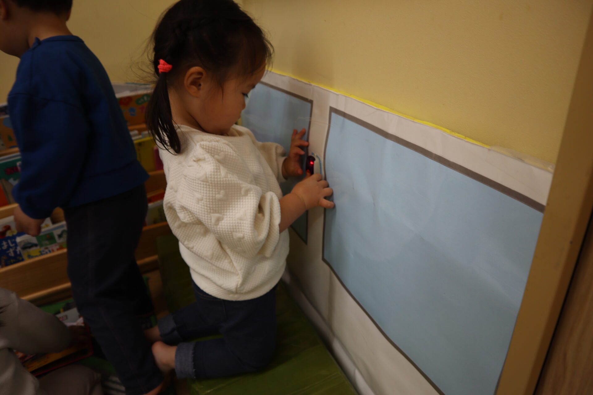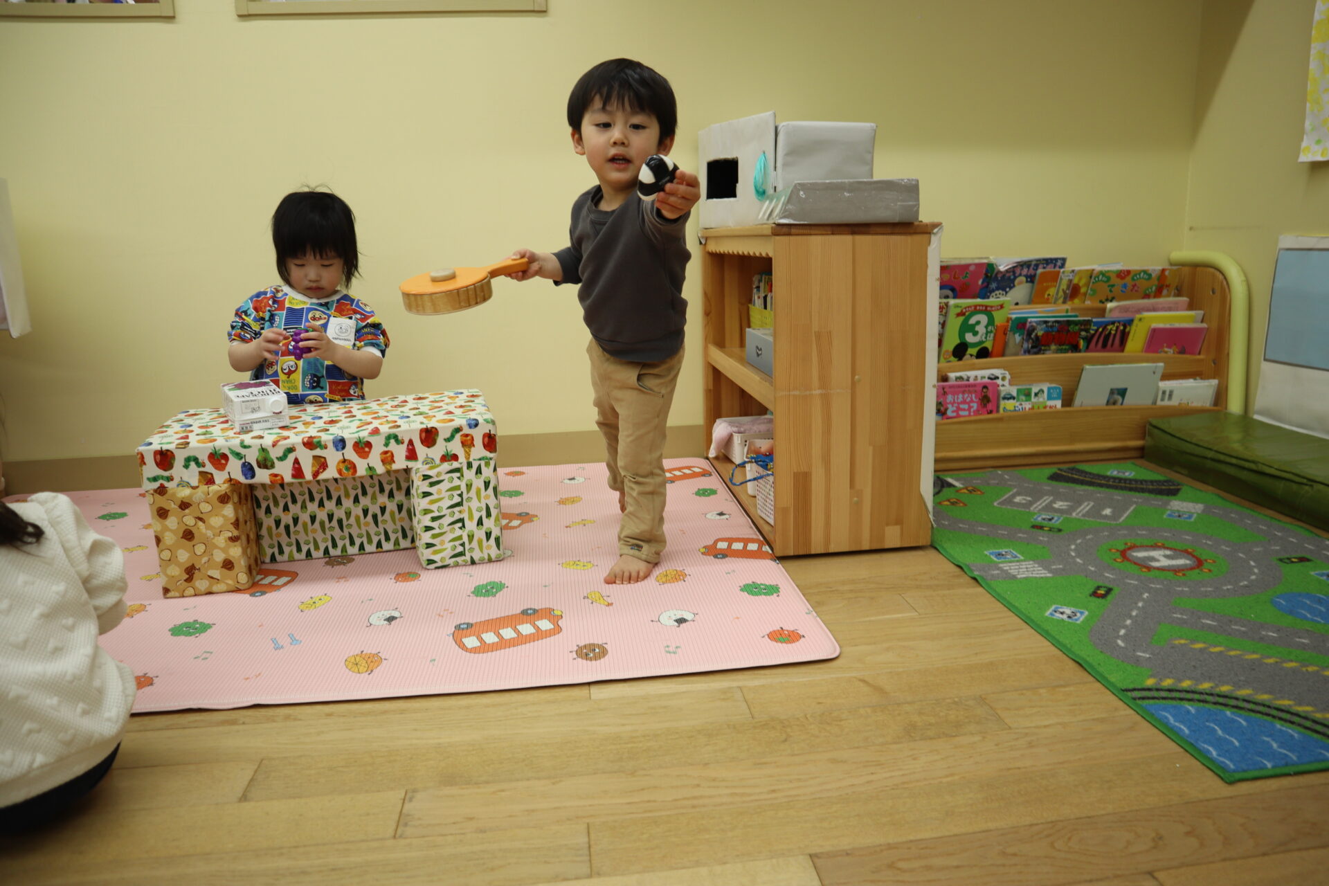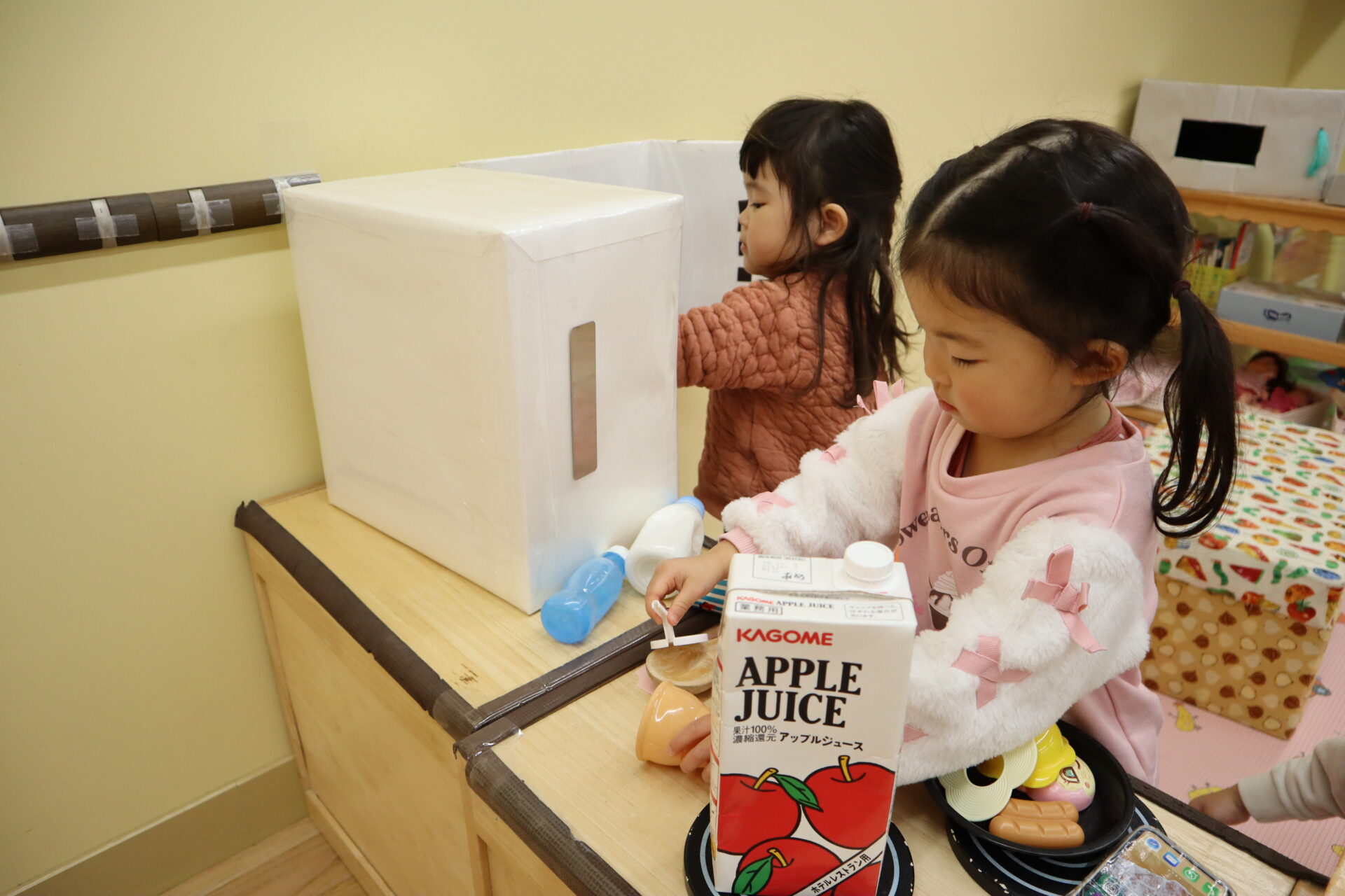 おままごとコーナーでは冷蔵庫に食べ物を入れたり、フライパンを使って料理を楽しんでいました。