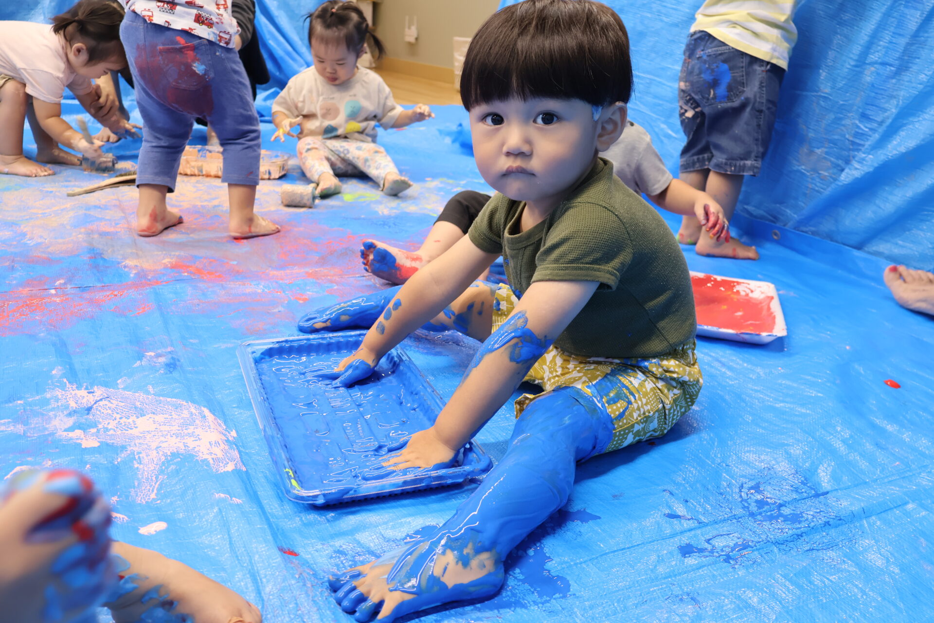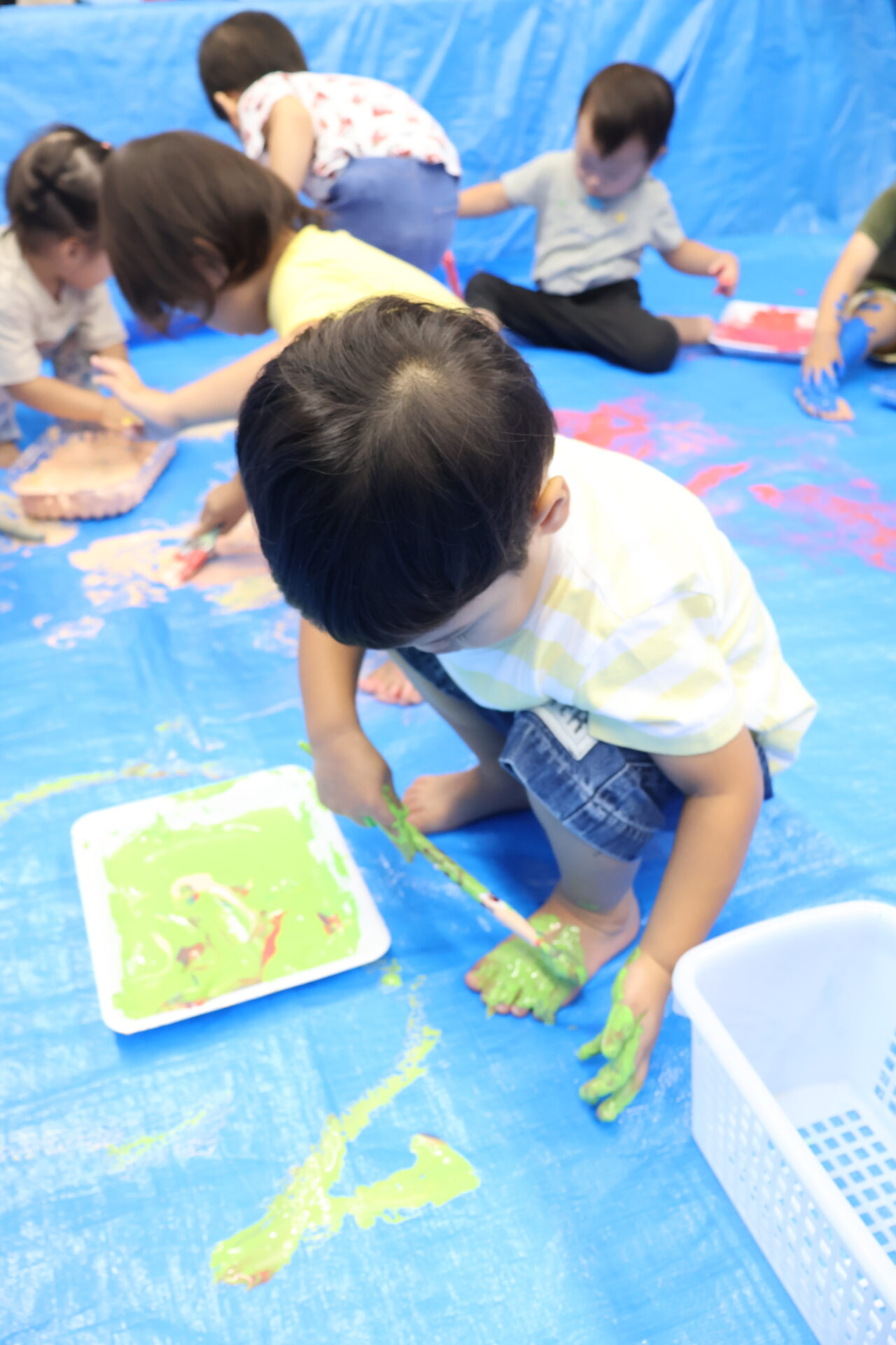 床や壁一面ブルーシートに覆われ、ボディペインティング仕様になった保育室に驚きを隠せない様子でしたが、すぐに「どの色にしようかな~」と、たくさんの色のパレットに興味津々のだいち組の子ども達です。