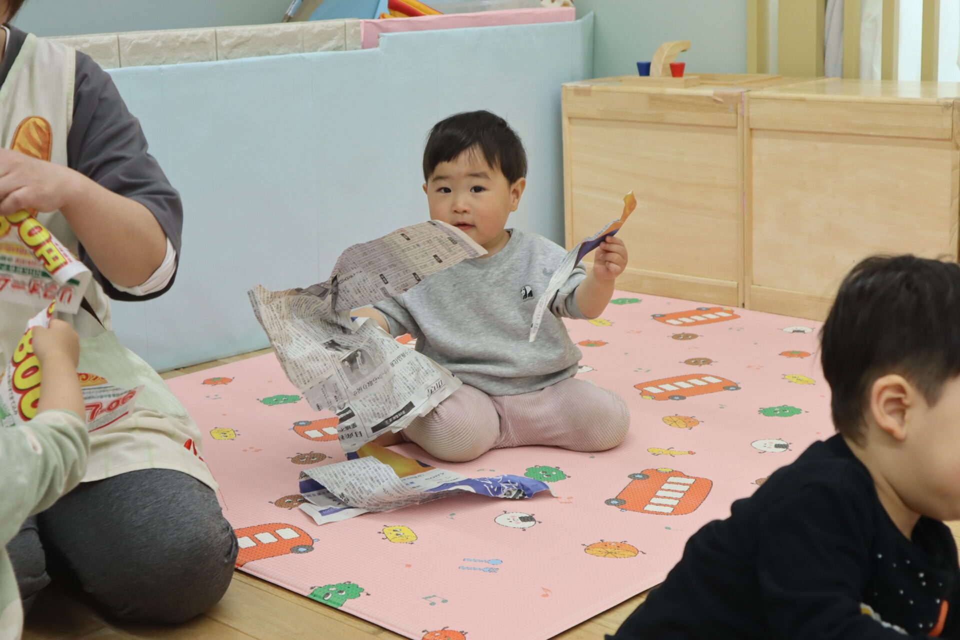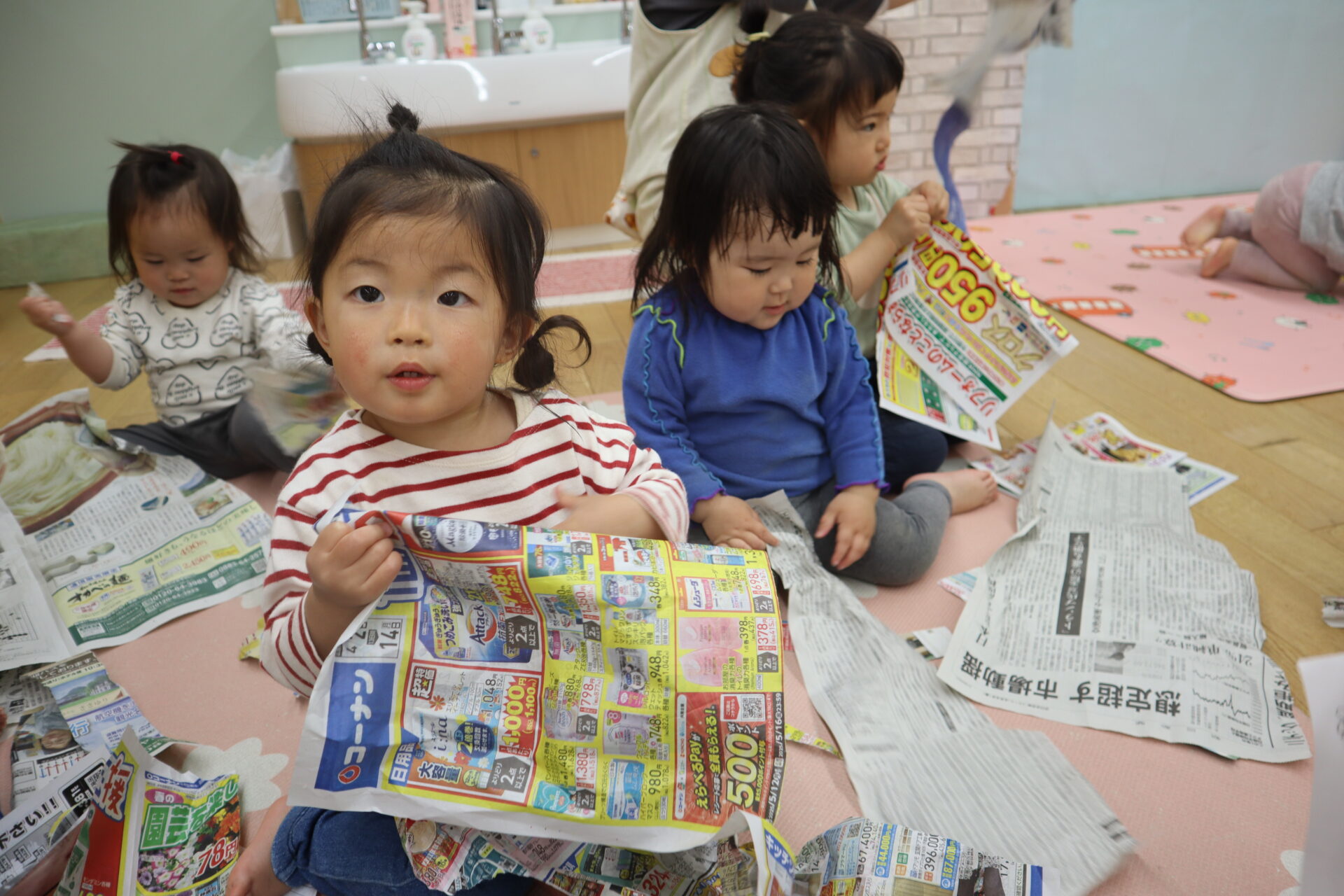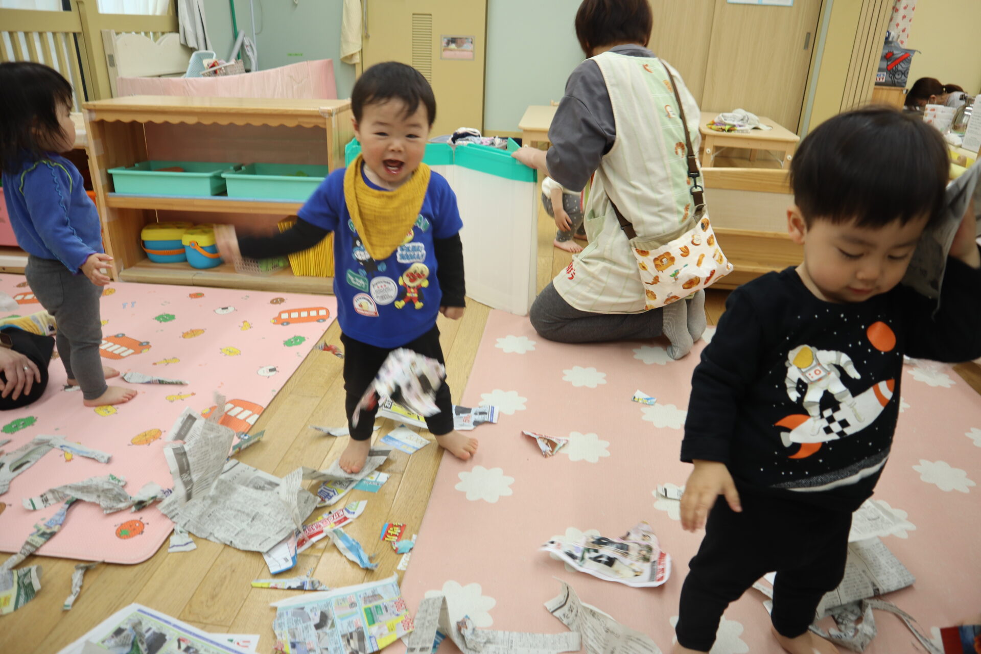 最初に保育者が見本で新聞紙をちぎると、「やりたーい!」と手を伸ばし真似をしてちぎる子ども達!