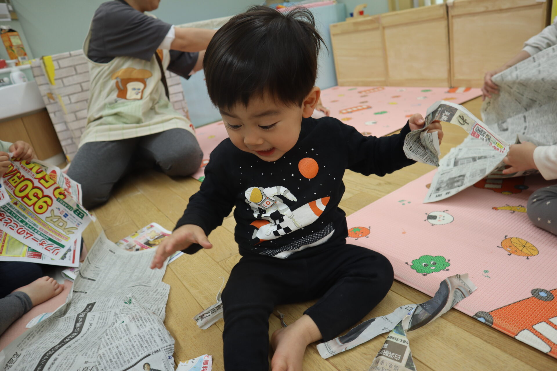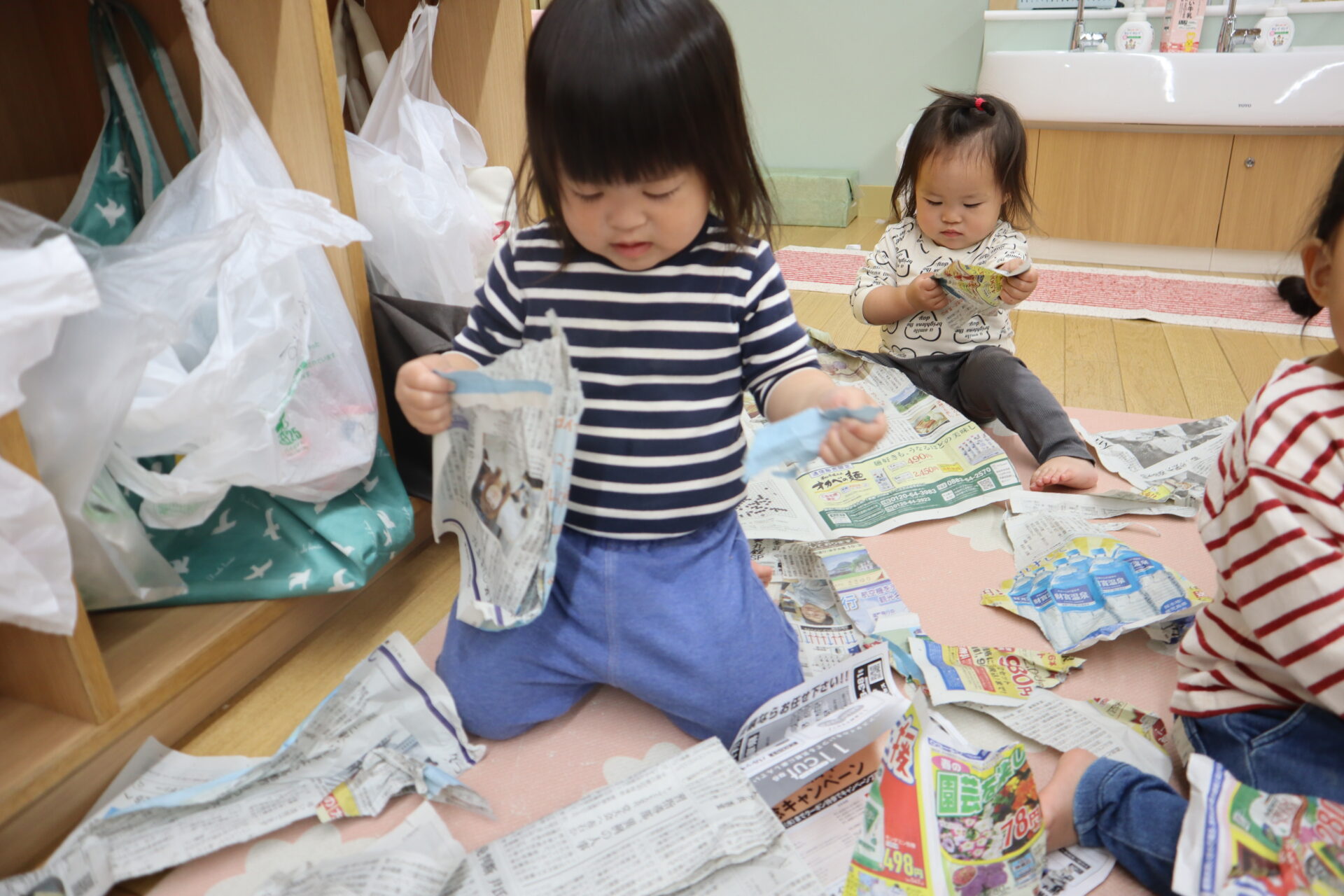 手や指先を使い大きい新聞紙を大胆にちぎったり、小さくなるまでちぎる子もいました。