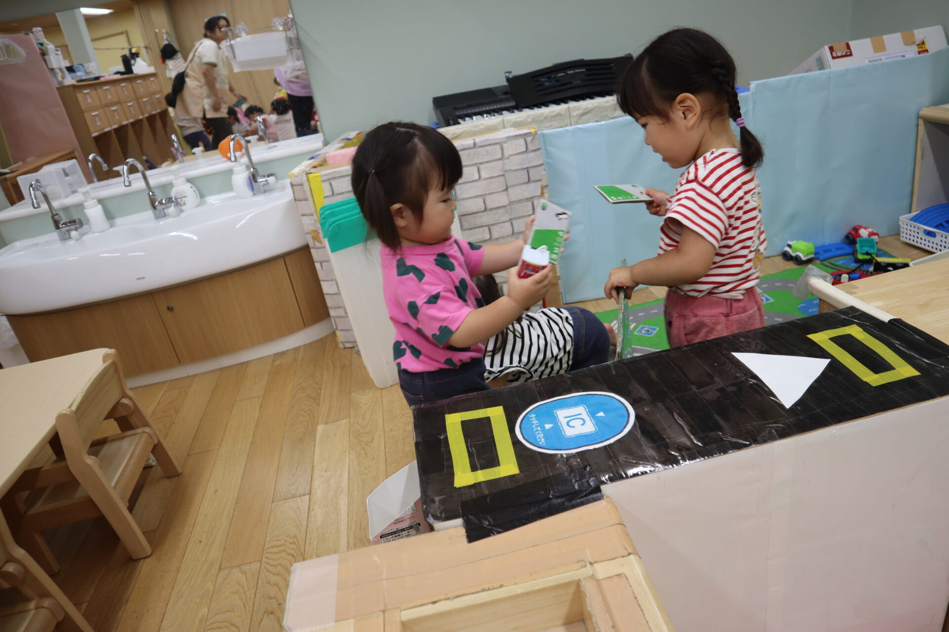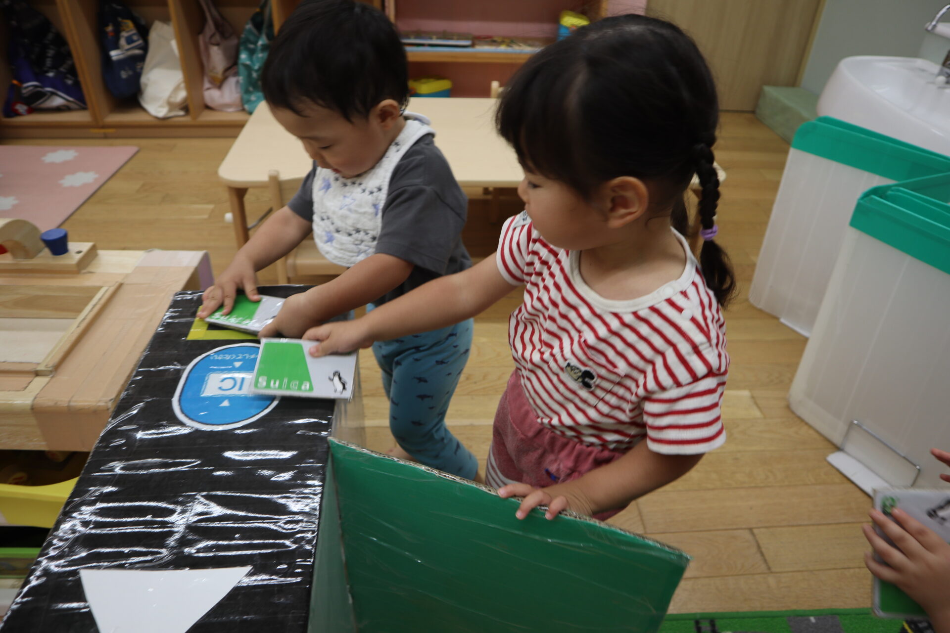 だいち組に大きなダンボールで作った改札機がきました。