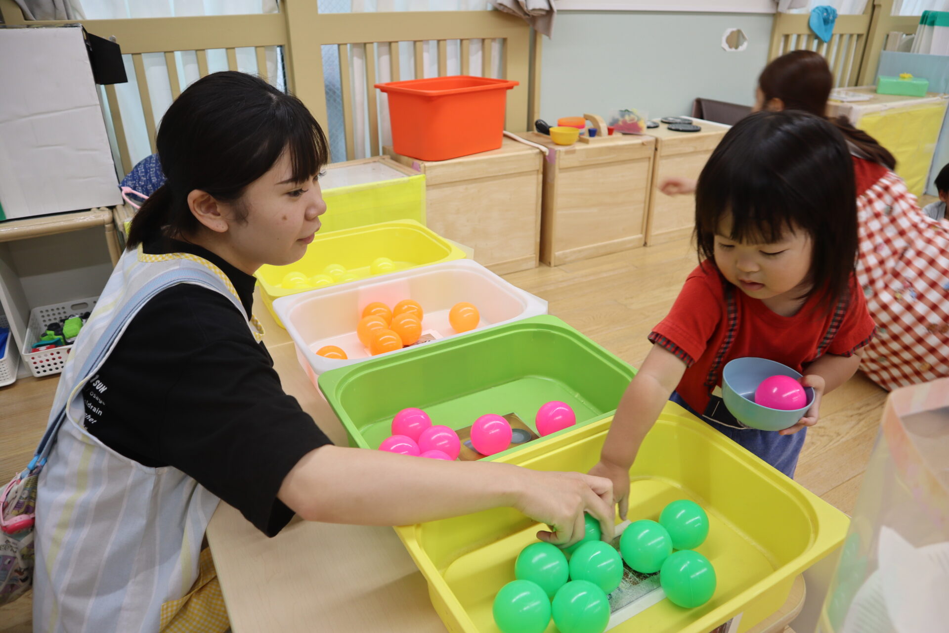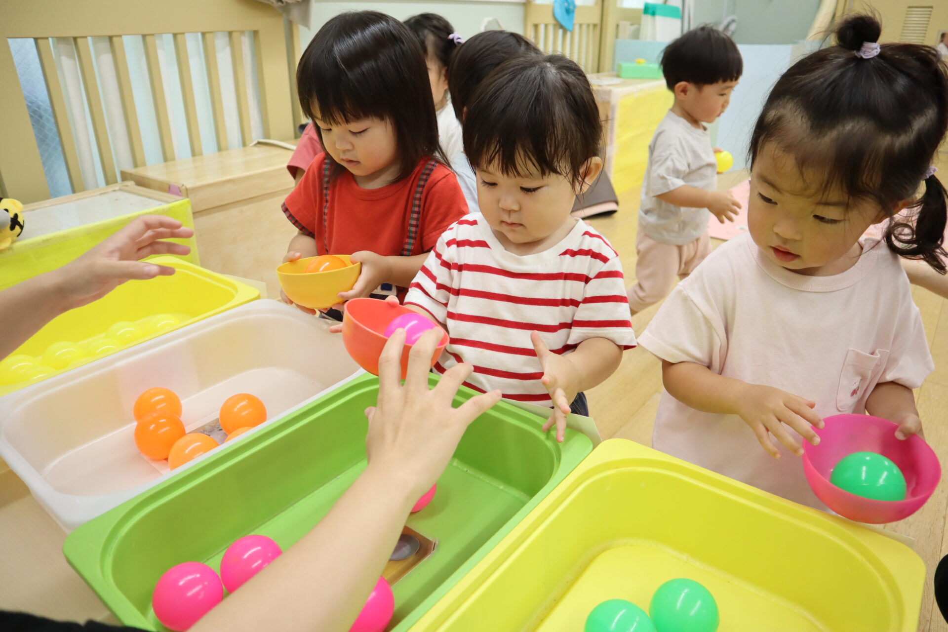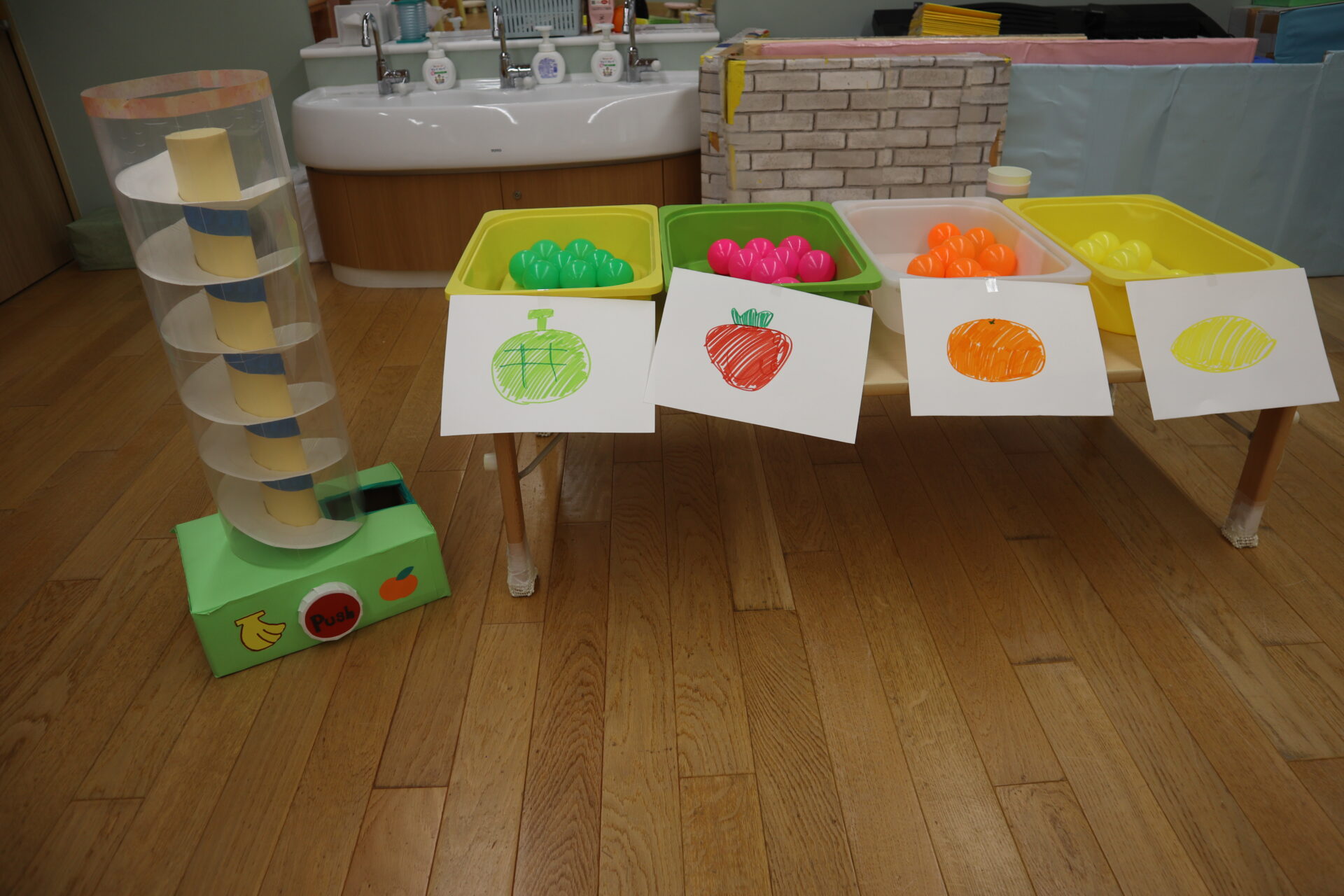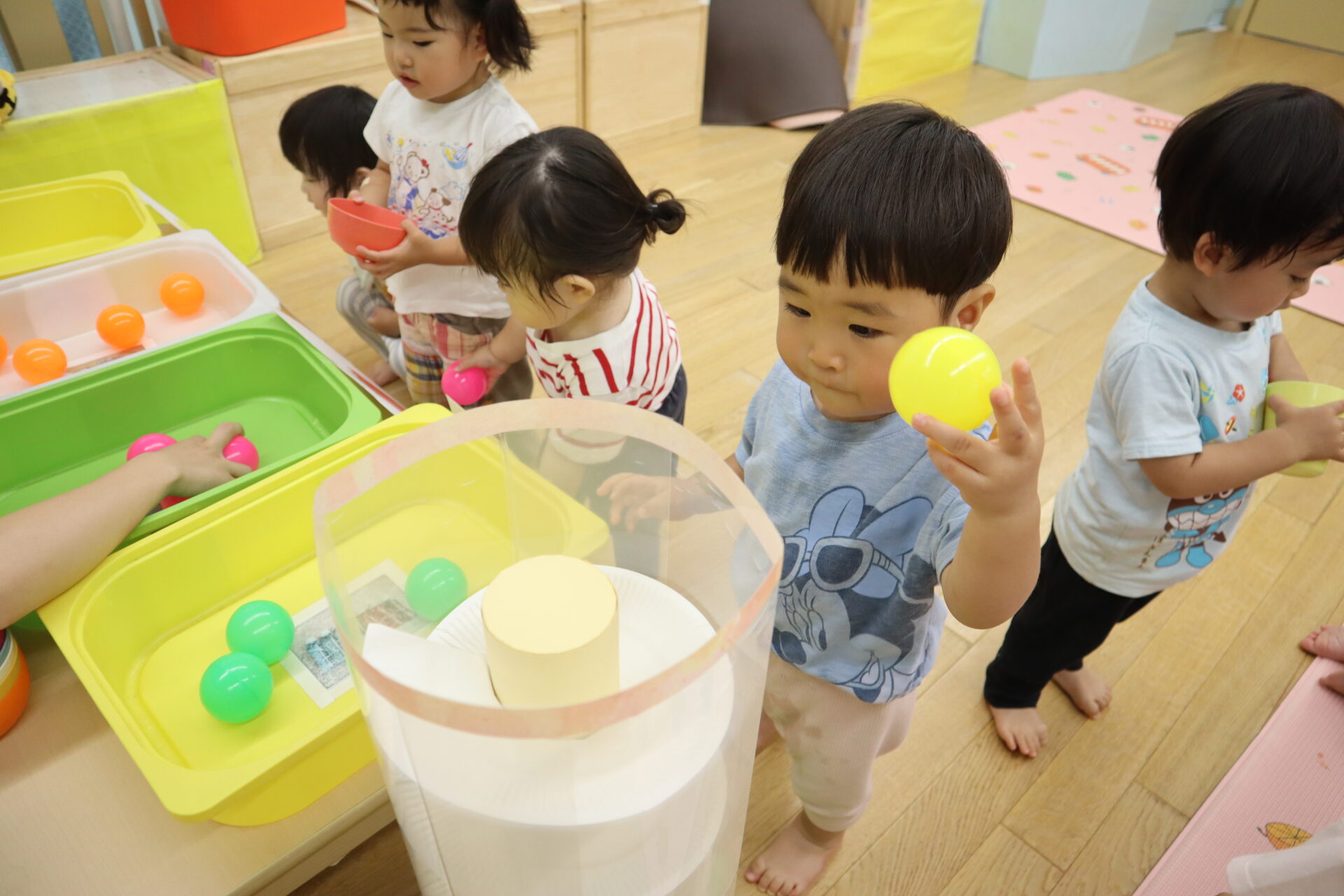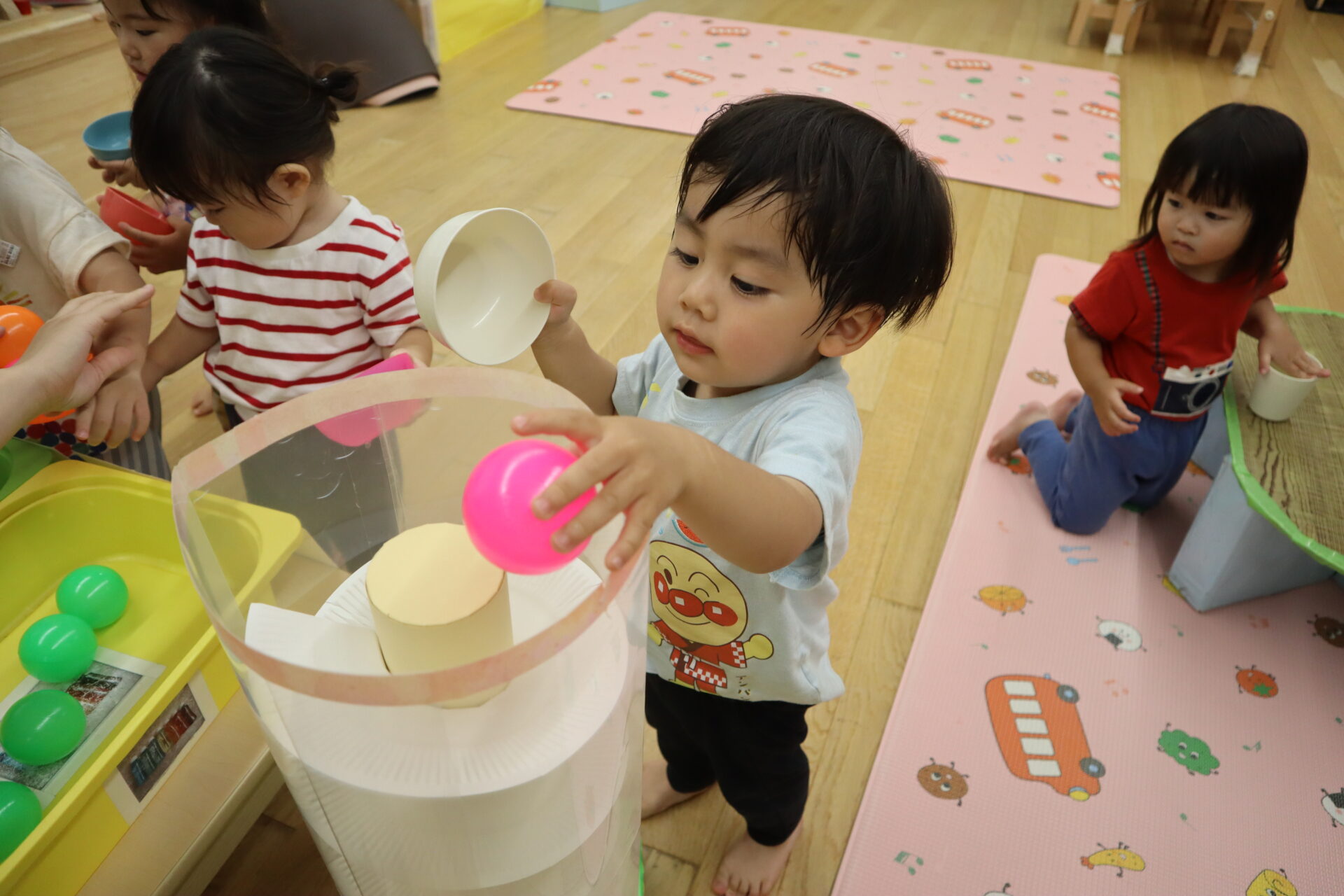 果物(カラーボール)が転がっていく事が面白く、一個ずつゆっくりと入れています。