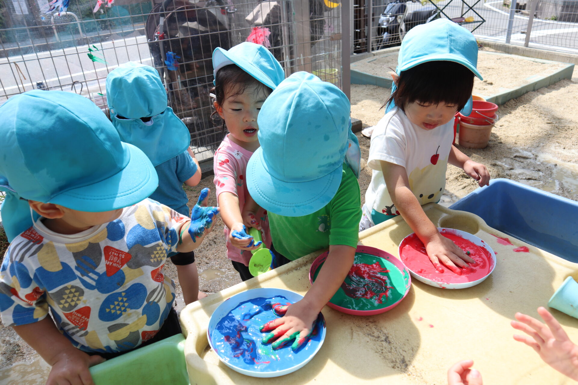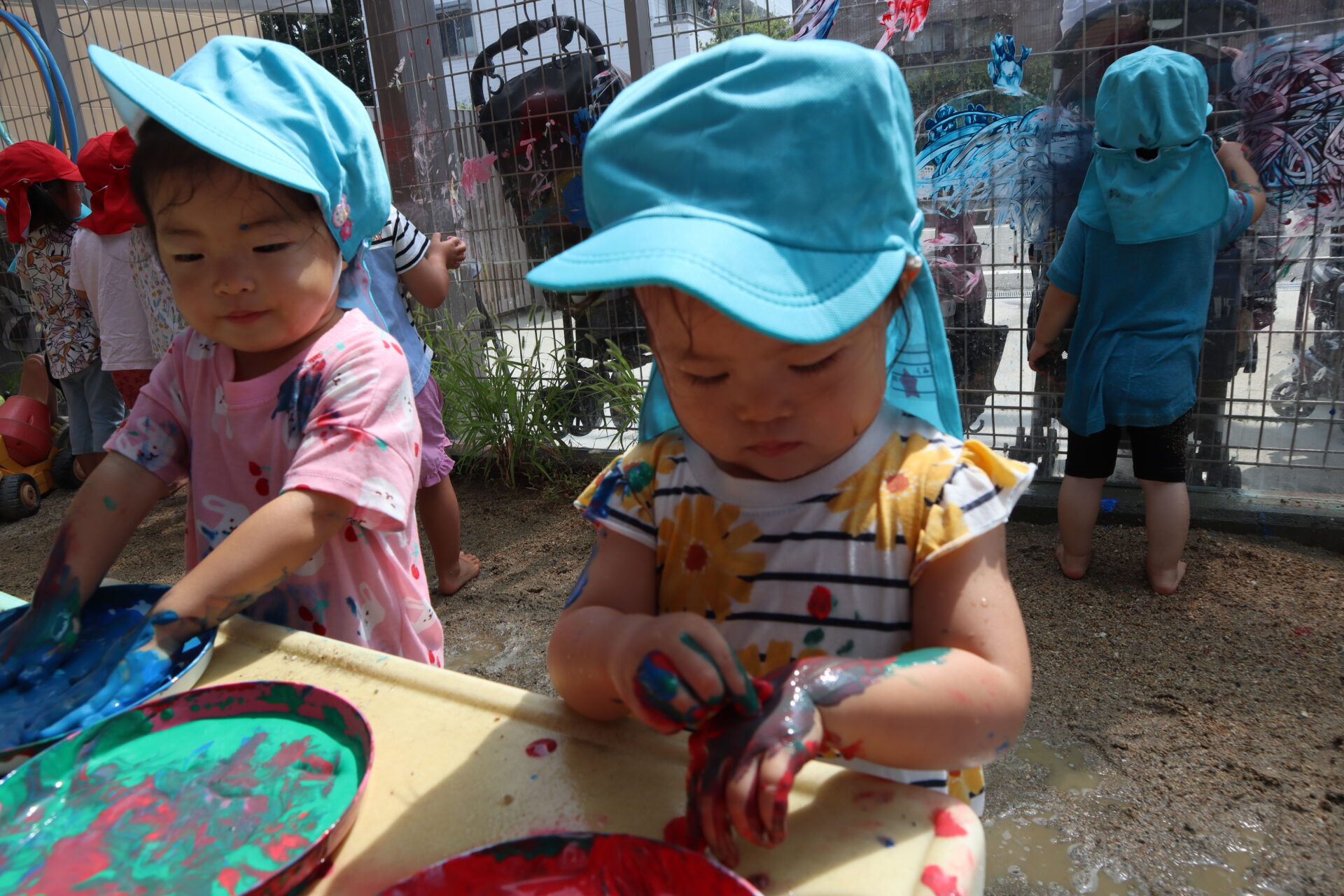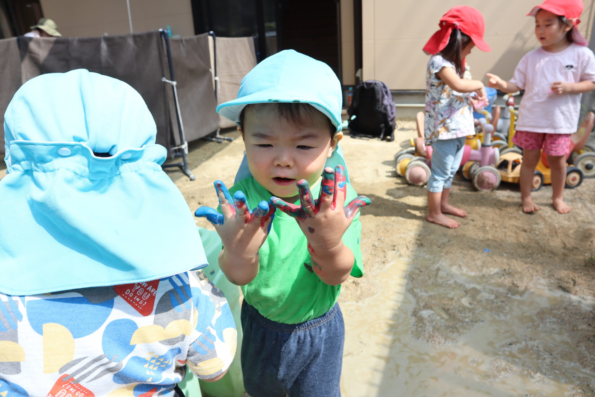 慣れてくると腕や足にも絵の具を塗ったり、友だちの真似をして塗る子もいました。