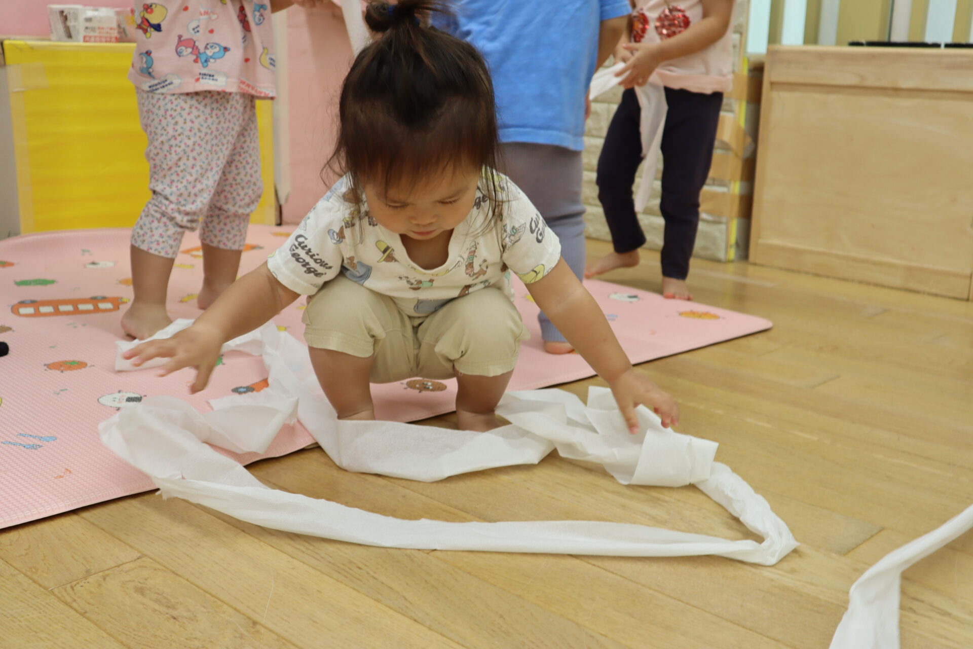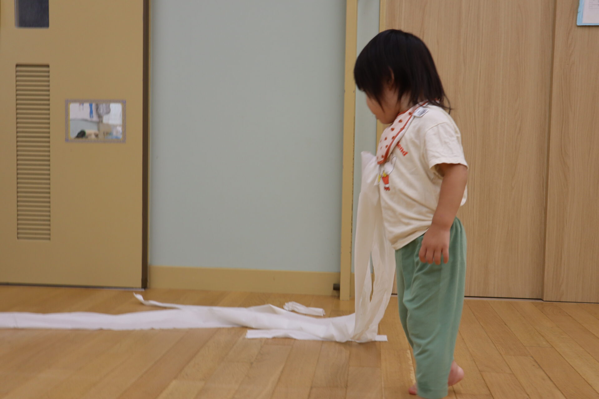 また長いトイレットペーパーを持ちながら保育室を散歩する姿も!