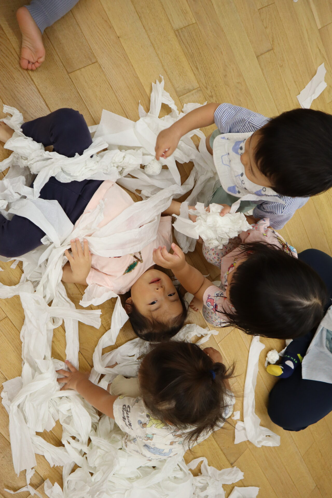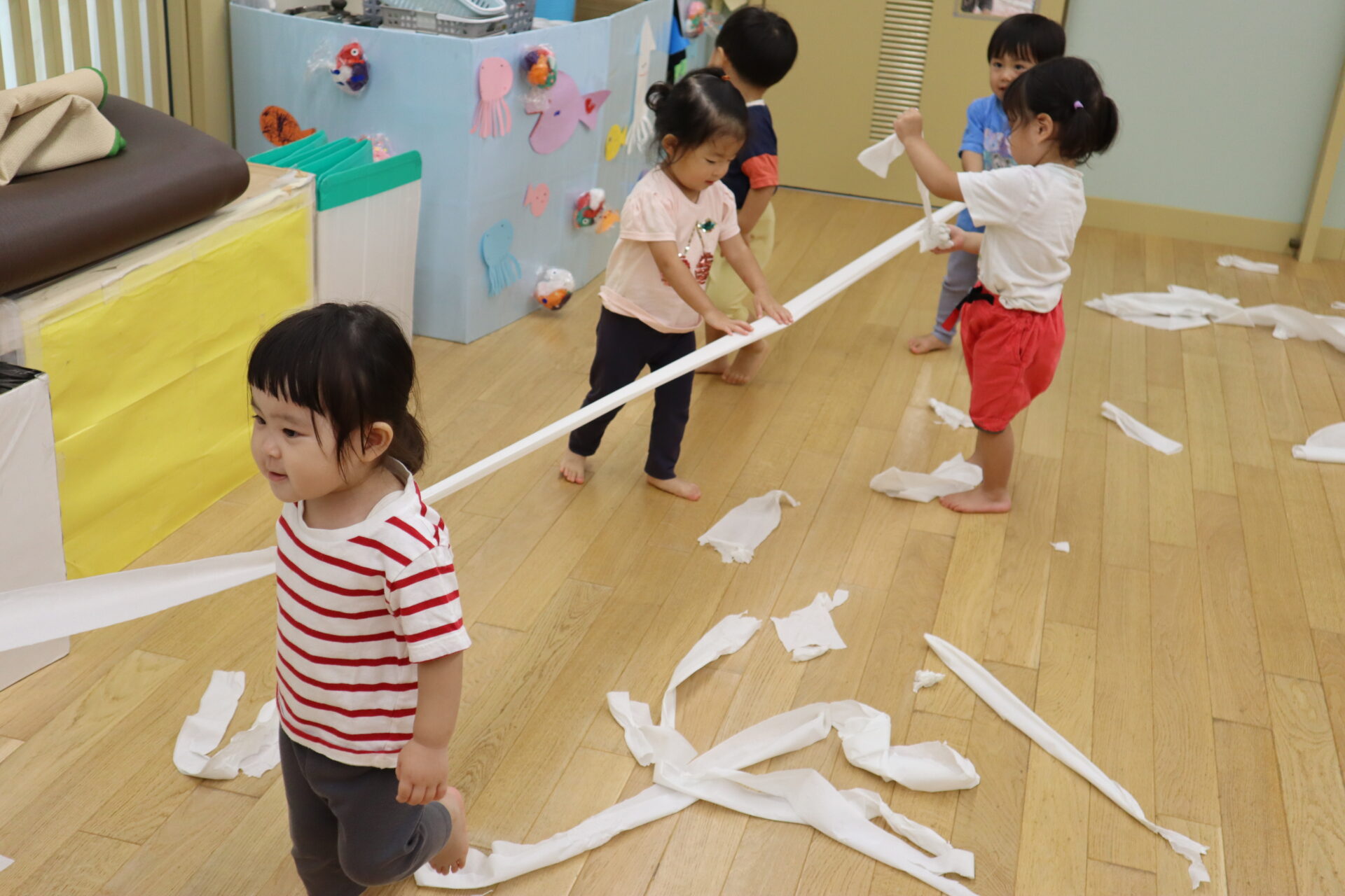 保育者がトイレットペーパーを「びよーん」と伸ばしていく様子に大喜びな子ども達!