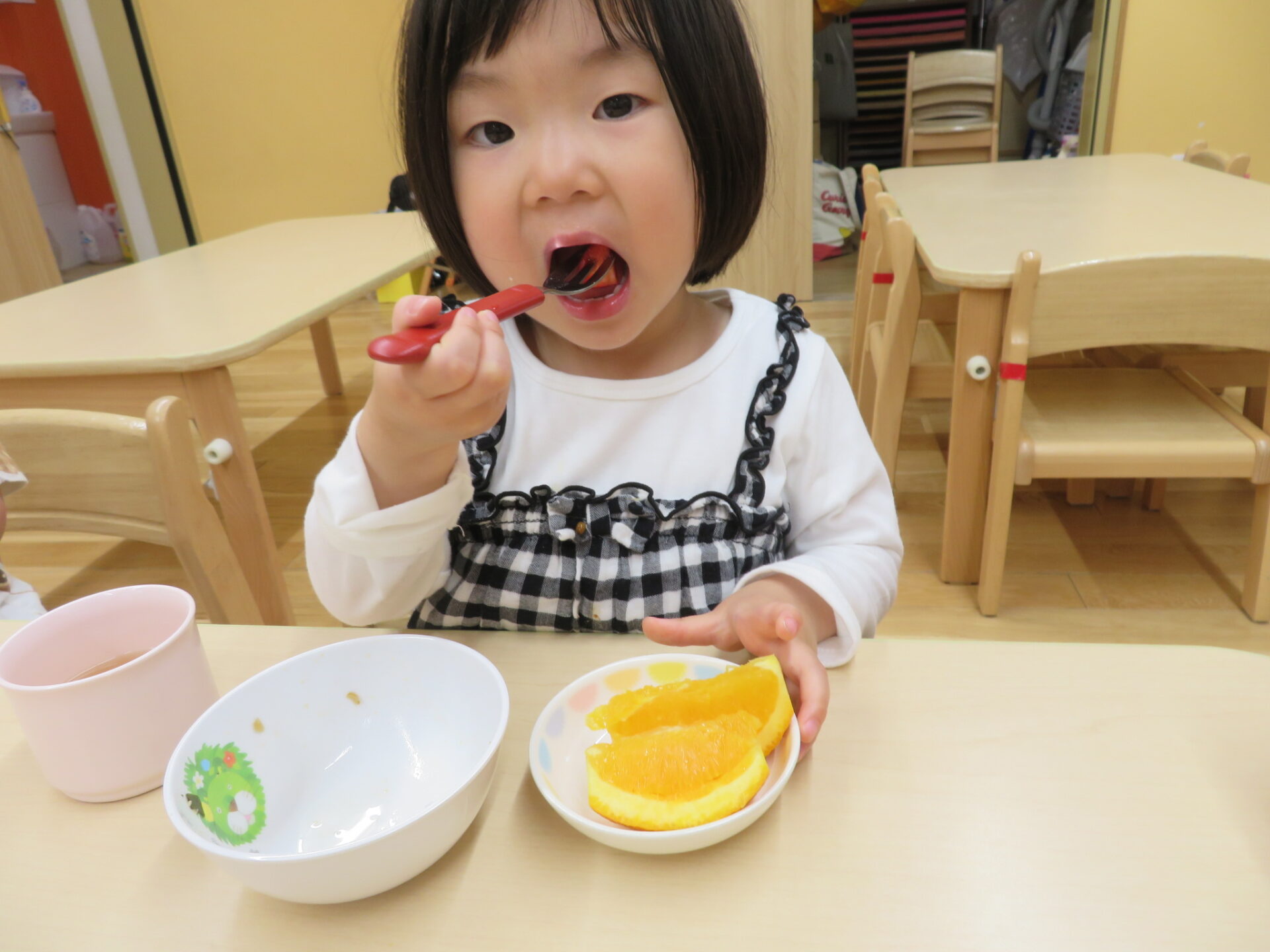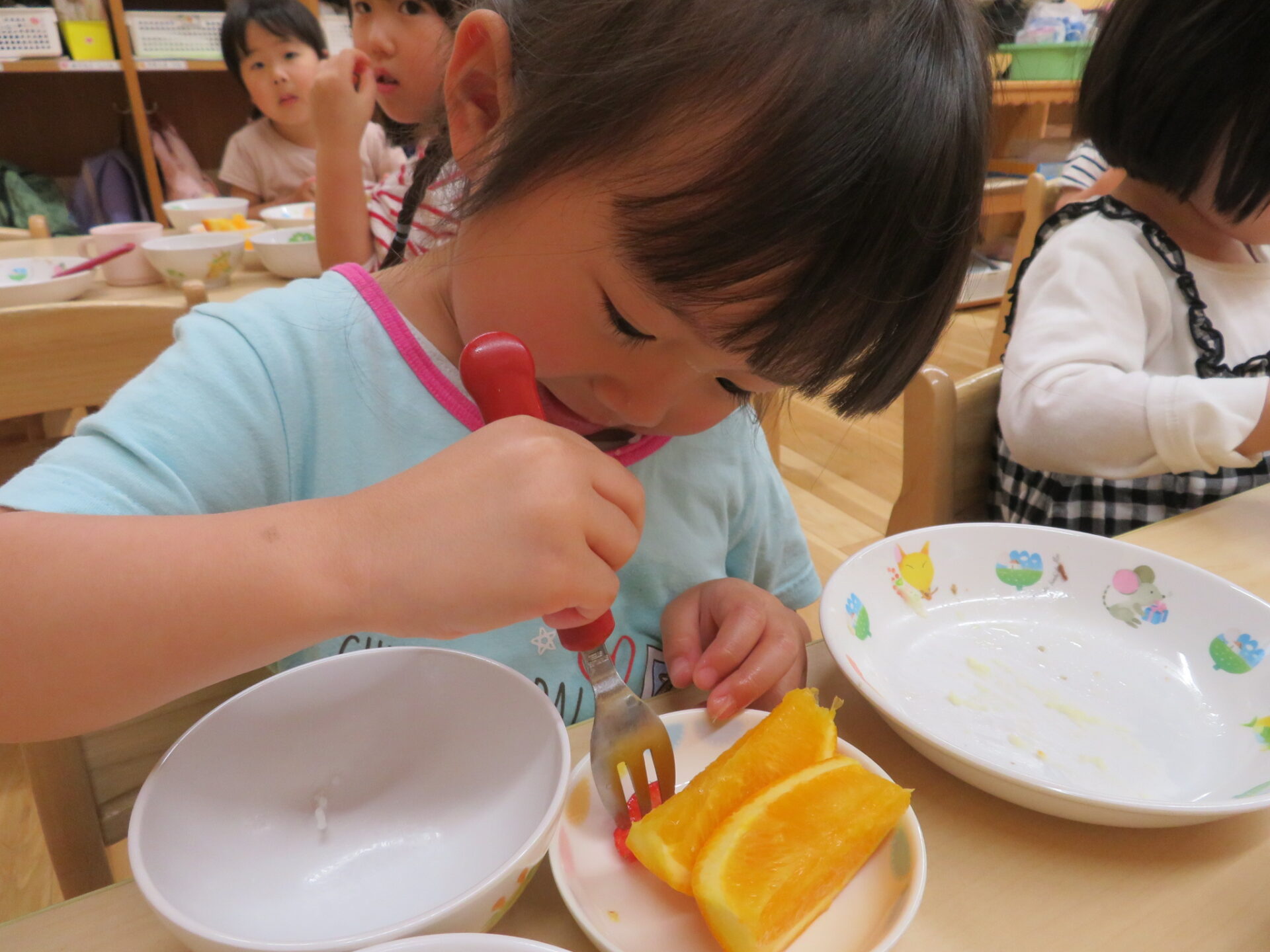 イチゴ2つを7等分にした小さな一口分でしたが、子ども達は満足のようで、「おいしい!」「甘いね」「次は、〇〇ちゃんだね」と顔を綻ばせていました。