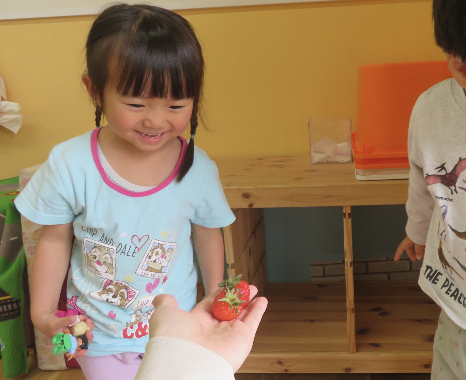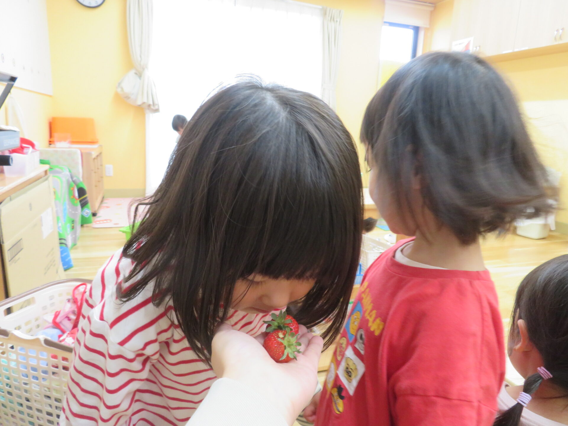 その香りにつられ、「何してるの〜?あ、イチゴだ!」と遊んでいる手を止めてお友だちが集まってきました。