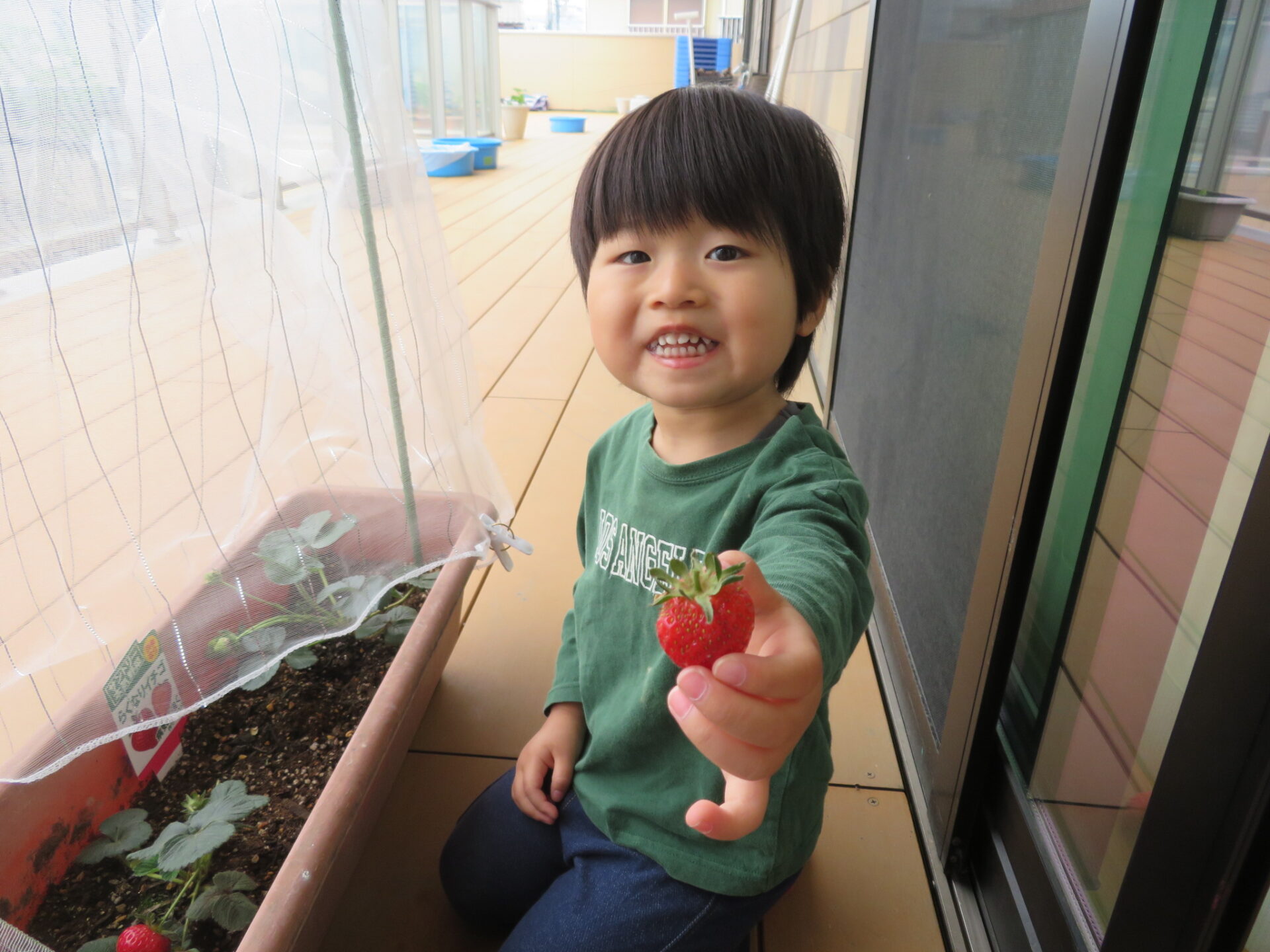 日々の水やりの中で、「早く食べたいな〜」「赤くなってきてるよ!」と発見した事を教えてくれていた子ども達の思いもあり、本日ようやくイチゴ収穫の日を迎えました!