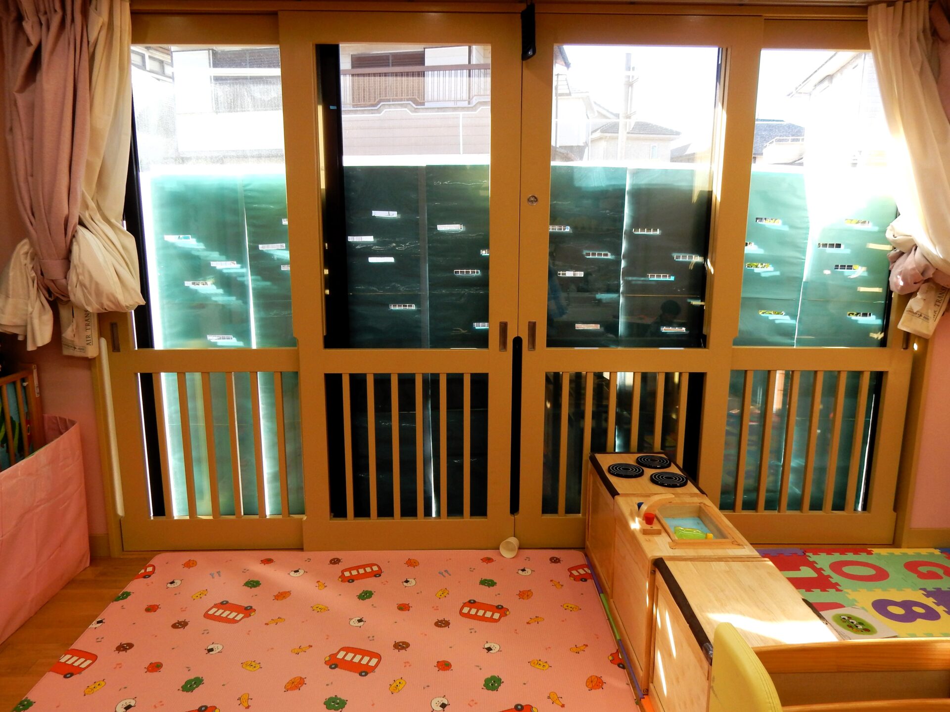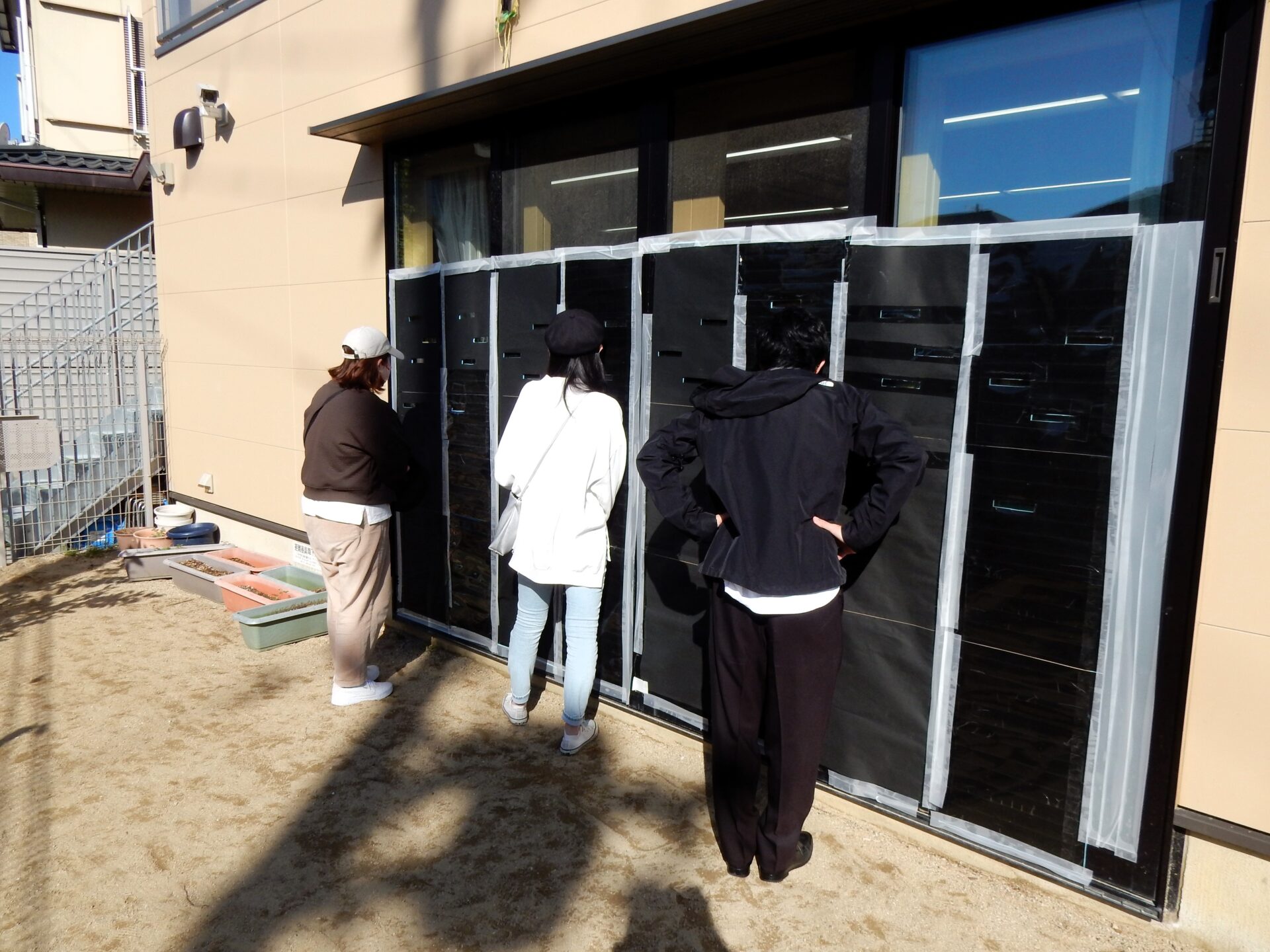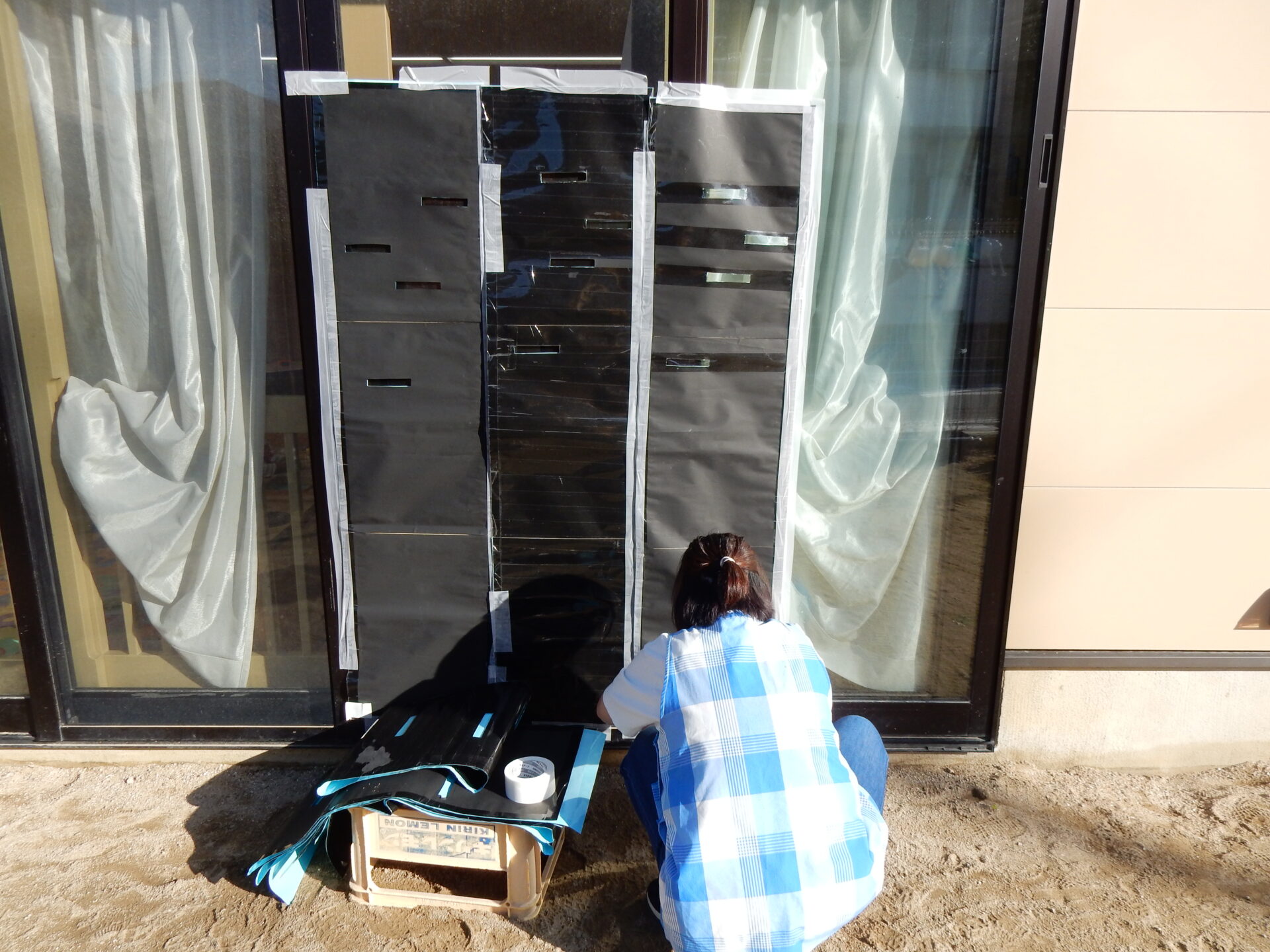 窓に穴の開いた大きな紙を、張り付けていました。