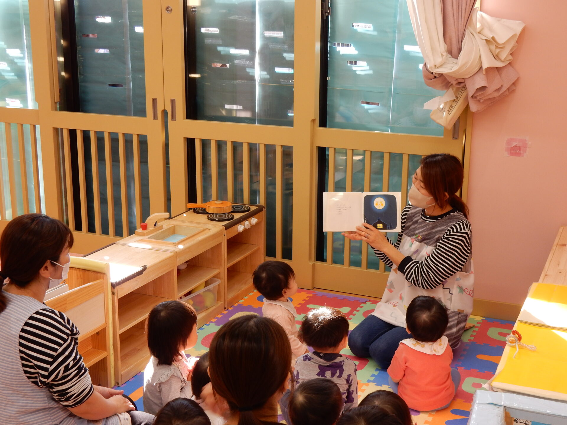 中では、朝のお集まりで絵本の読み聞かせ中でした。