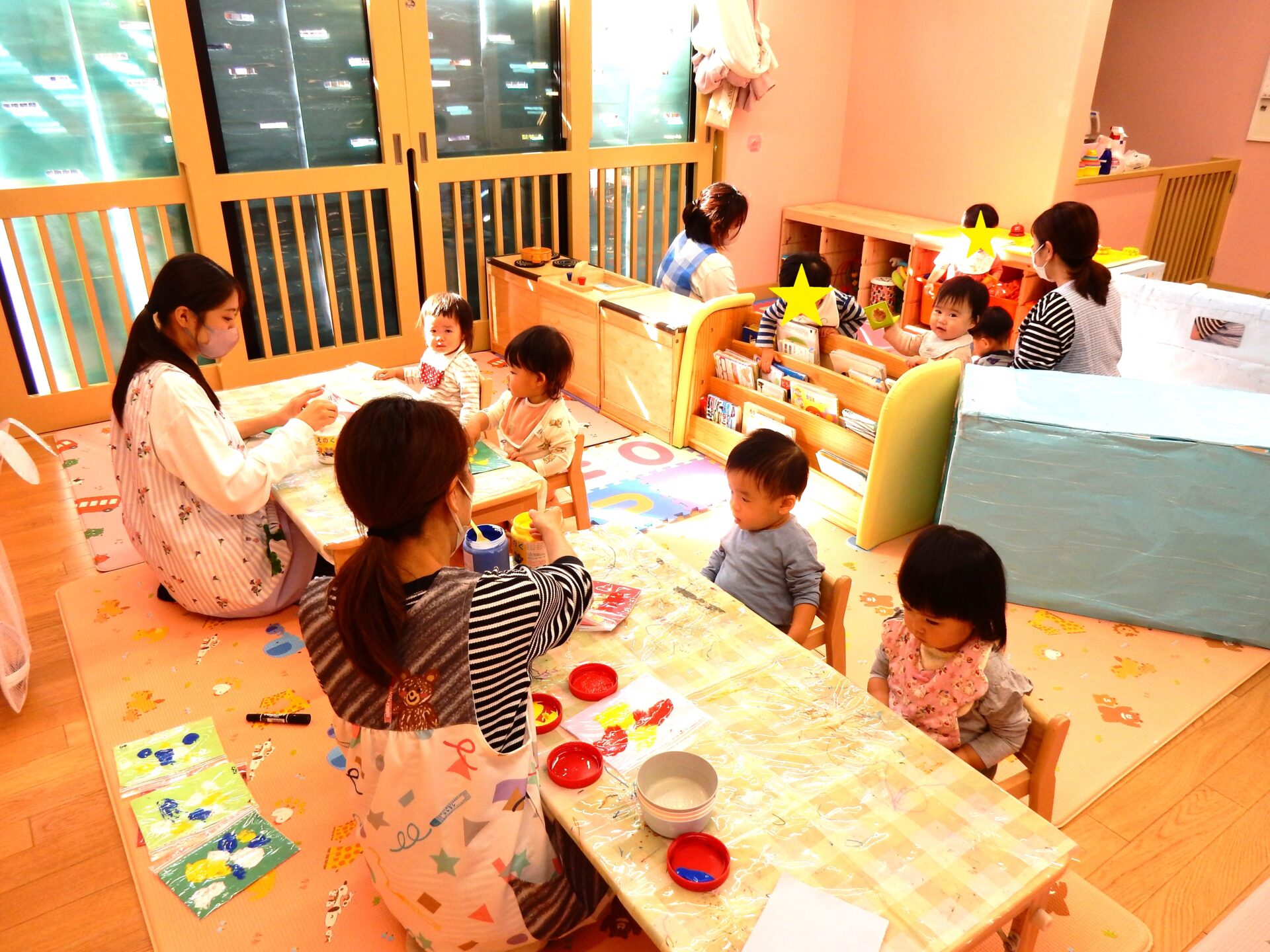 暫くして、保育室を見に行くと、フィンガーペイント(手や指に絵具を付けて色を塗っていく表現技法)を楽しんでいるところでした。