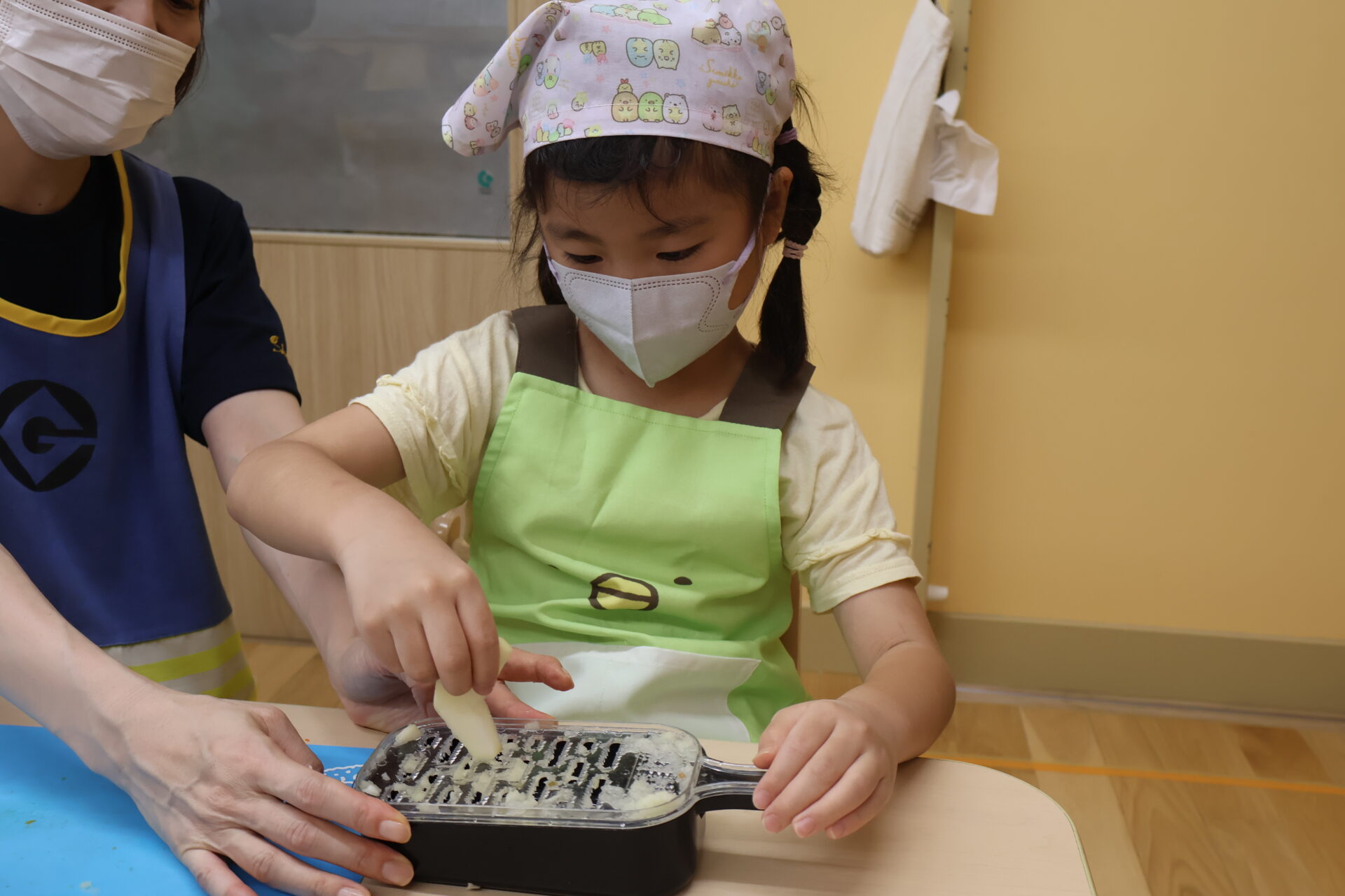 おやつを食べ終わり、手を洗ってクッキングの準備をしていきます。