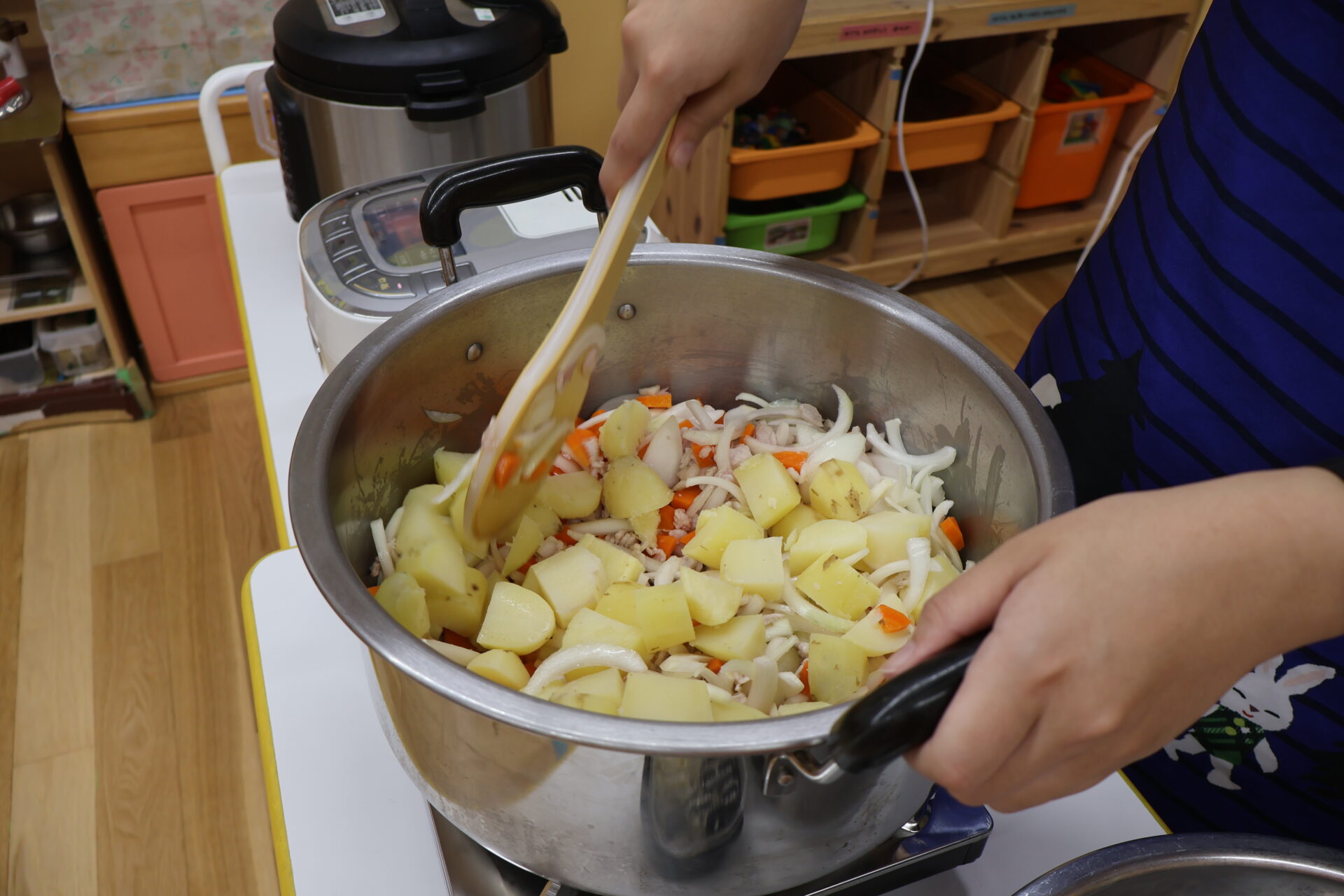 全て切り終えて、保育者が1つずつ食材をお鍋に入れていくと「おぉぉ~!!」「すご~い!!いい匂いしてきた!!!」等と歓声があがっていき、自分達で切った物がお鍋に入っていくことが嬉しい子ども達でした♡