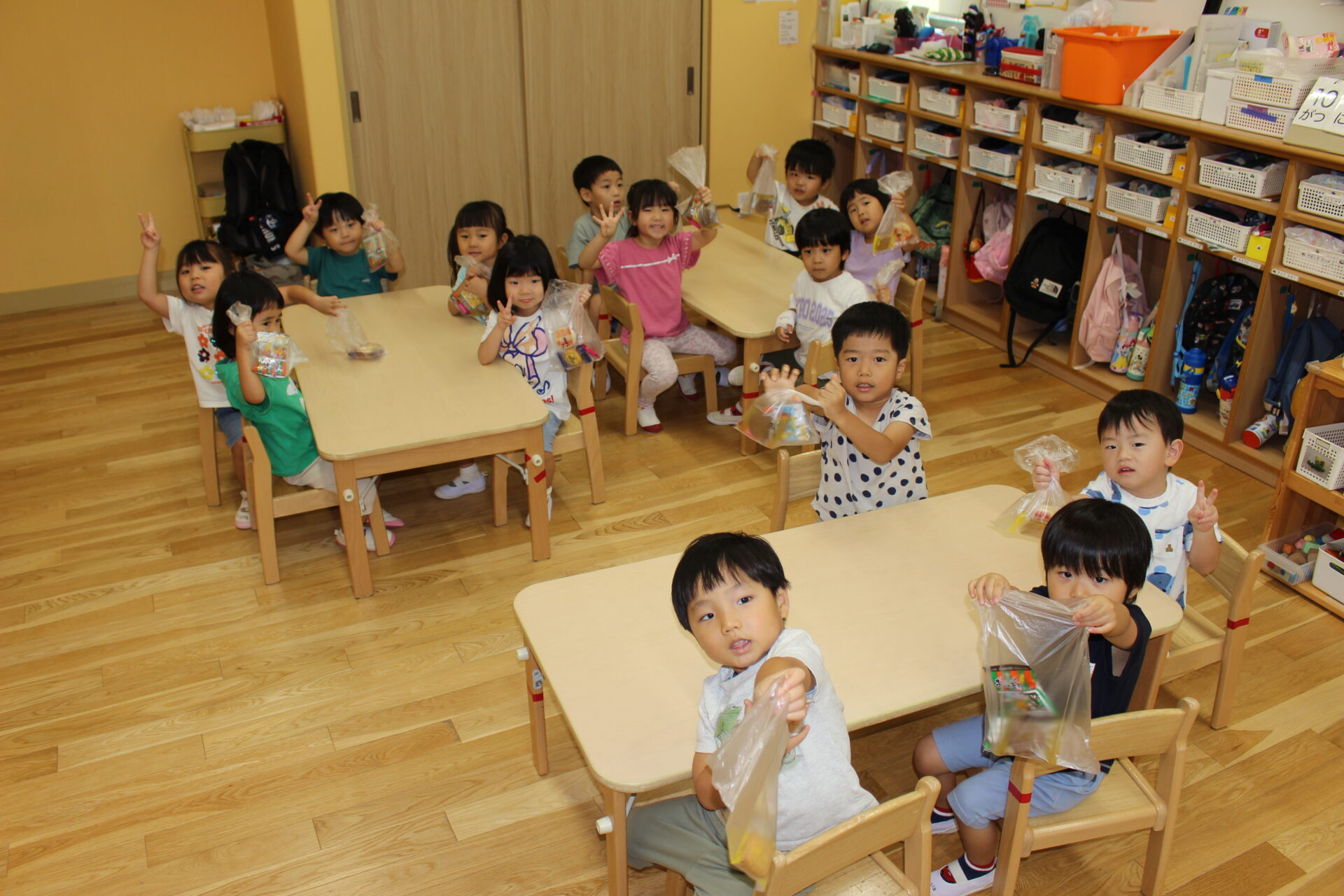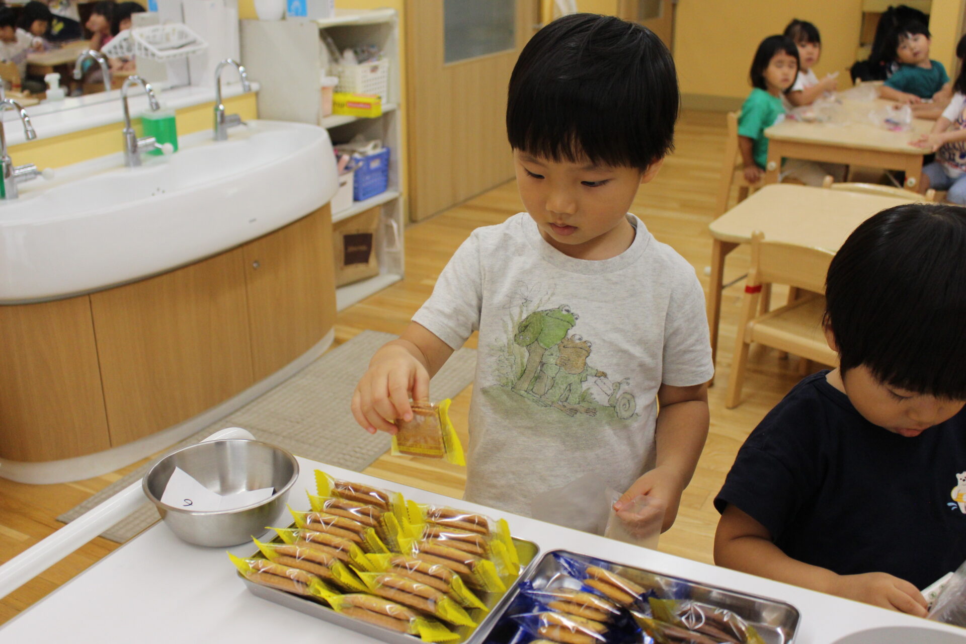 自分だけのおやつ袋が完成すると、机に戻り「何にしたの?」「これ、一緒だね」と見せ合っていました。