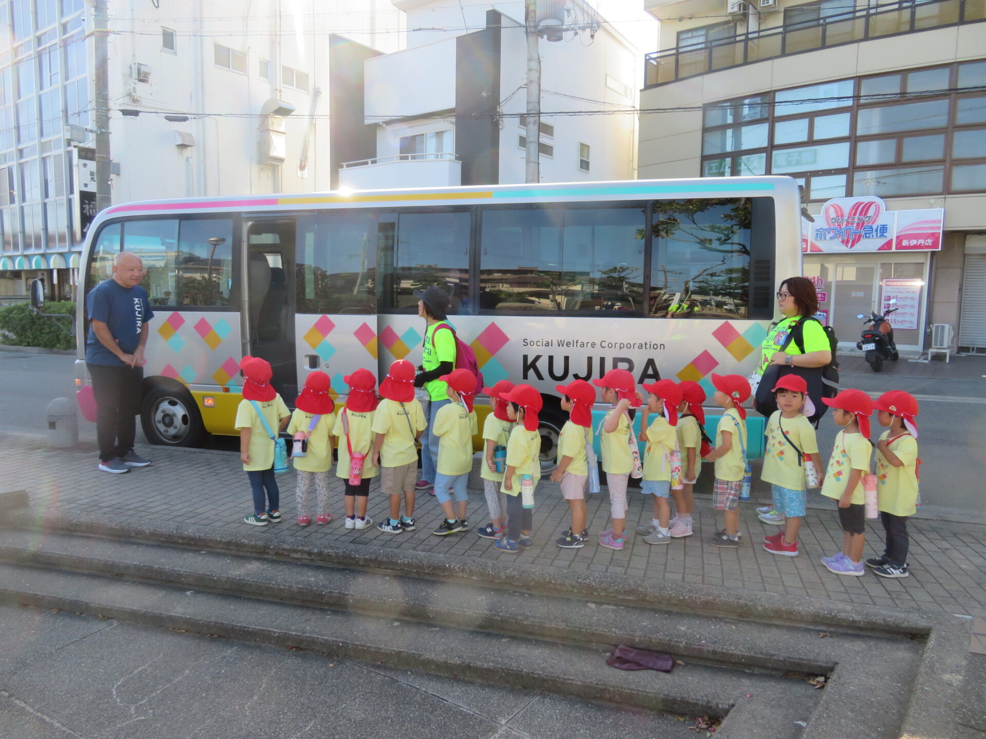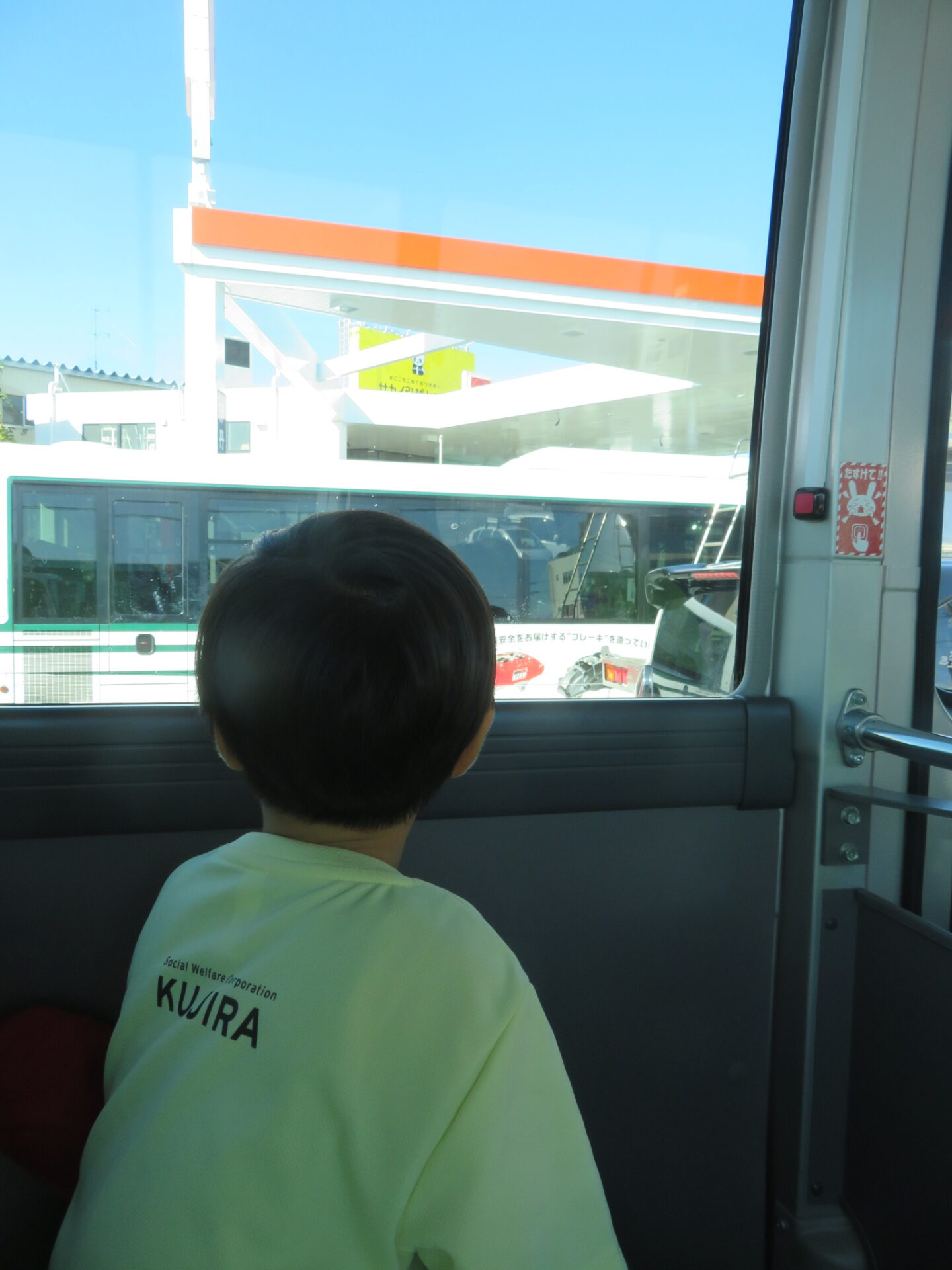 出発準備をして保育園を出て駅に向かうと、そこには園バス(くじら号)が留まっていました。