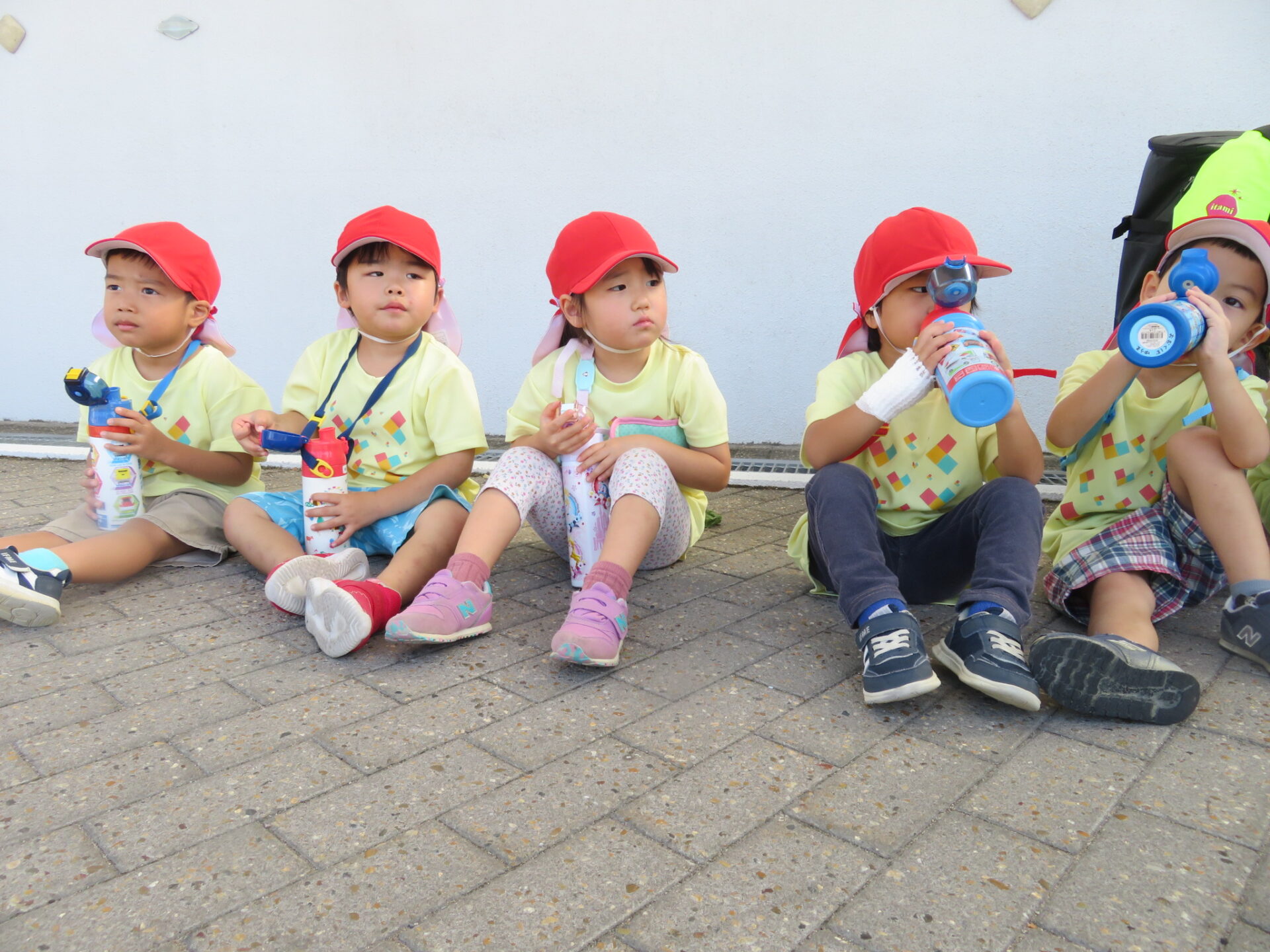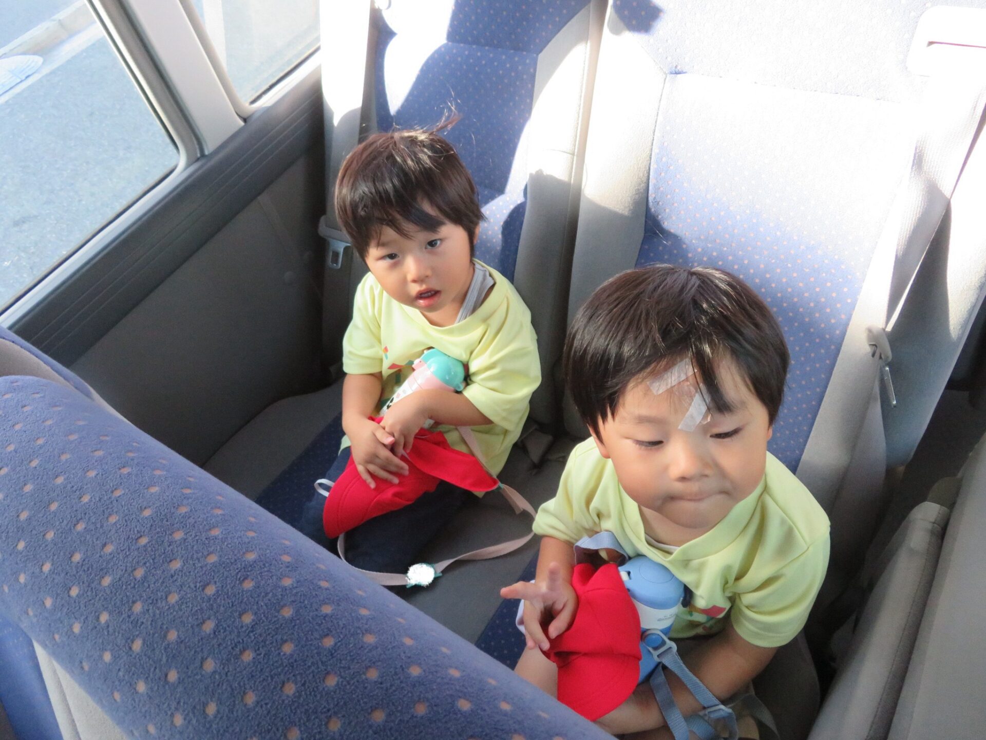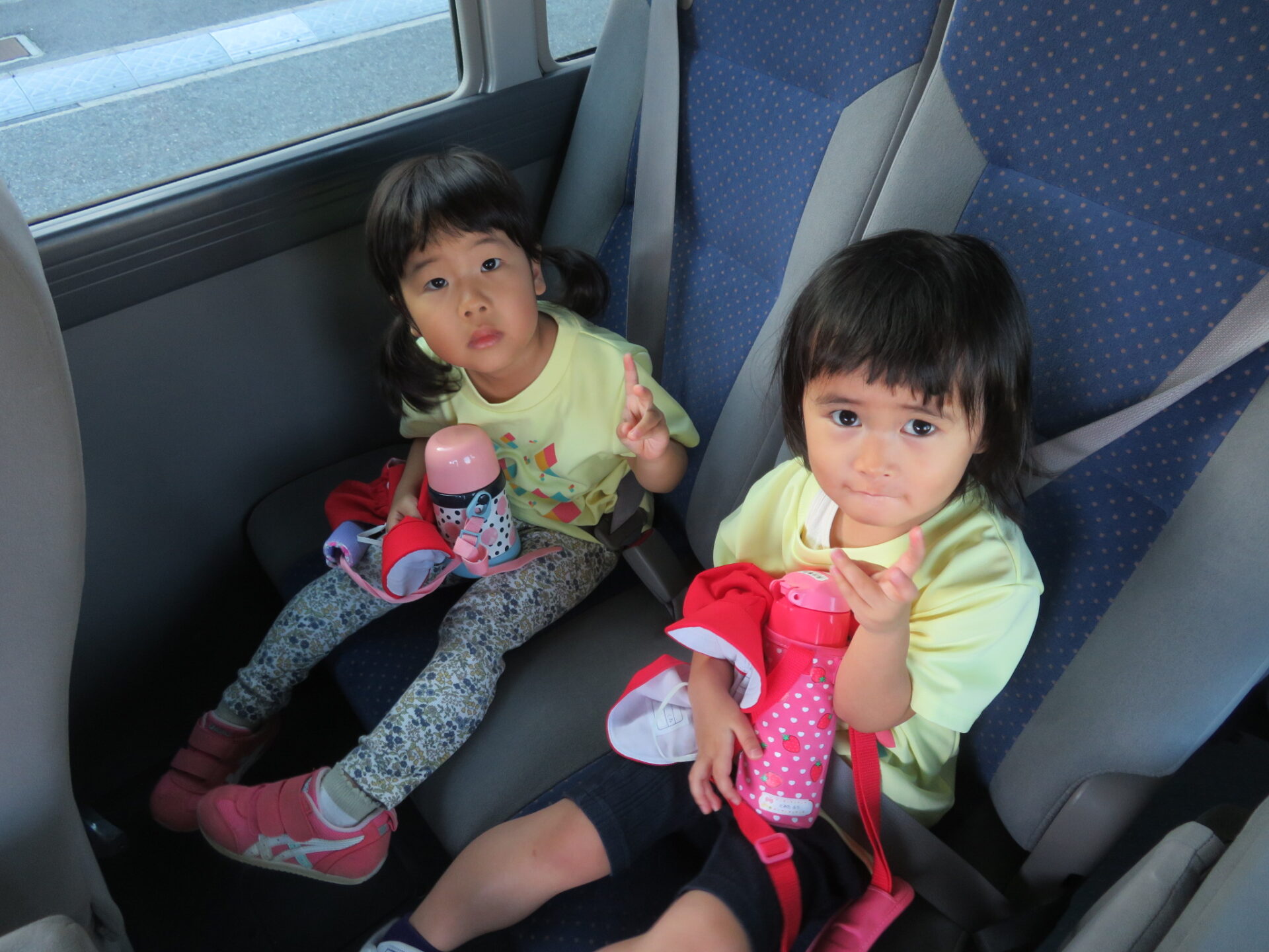 「水筒は足の下に置くんだよ」と隣のお友だち同士で声を掛け合います。