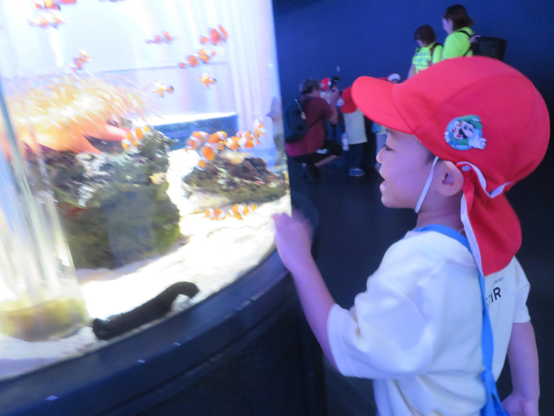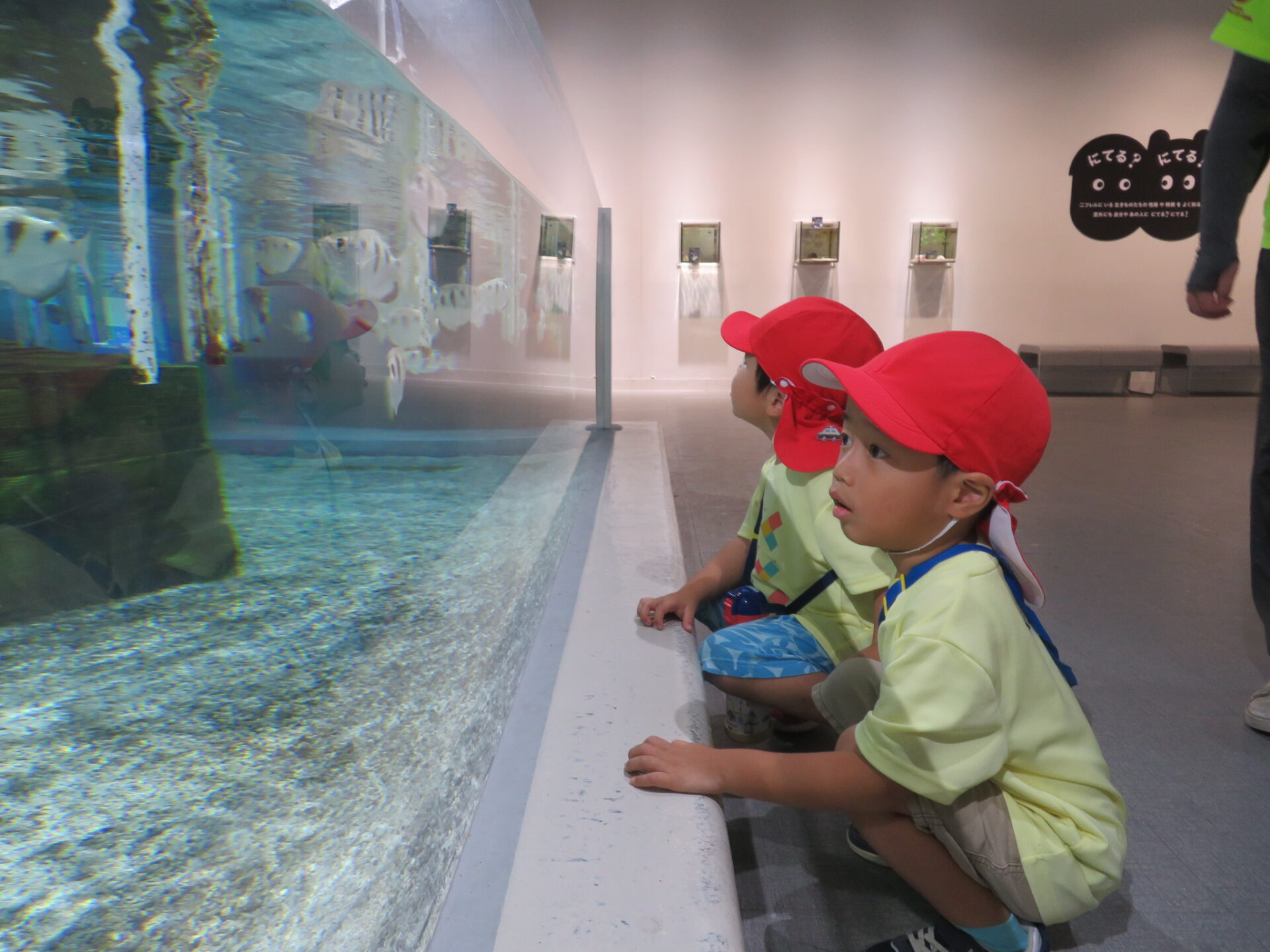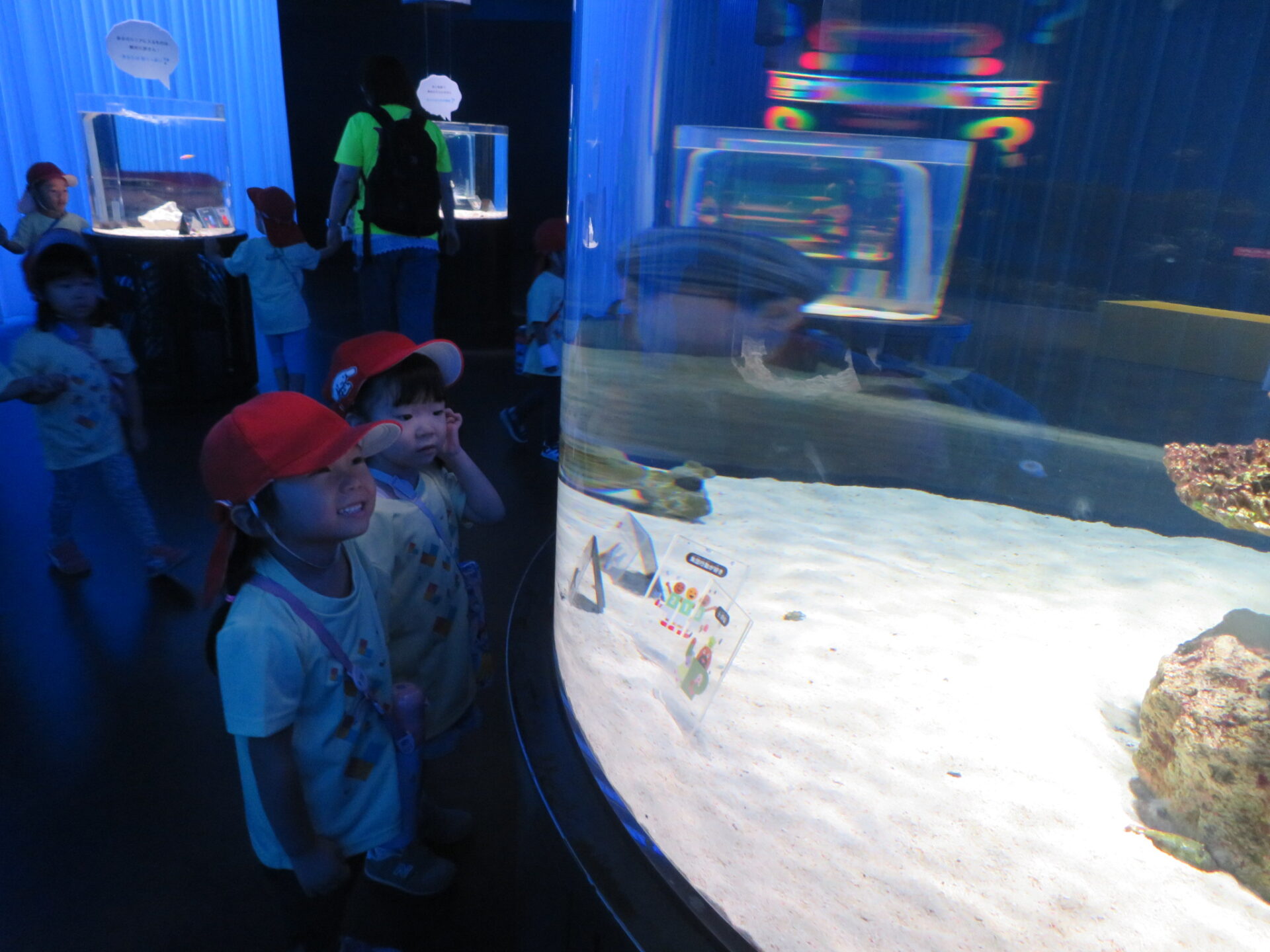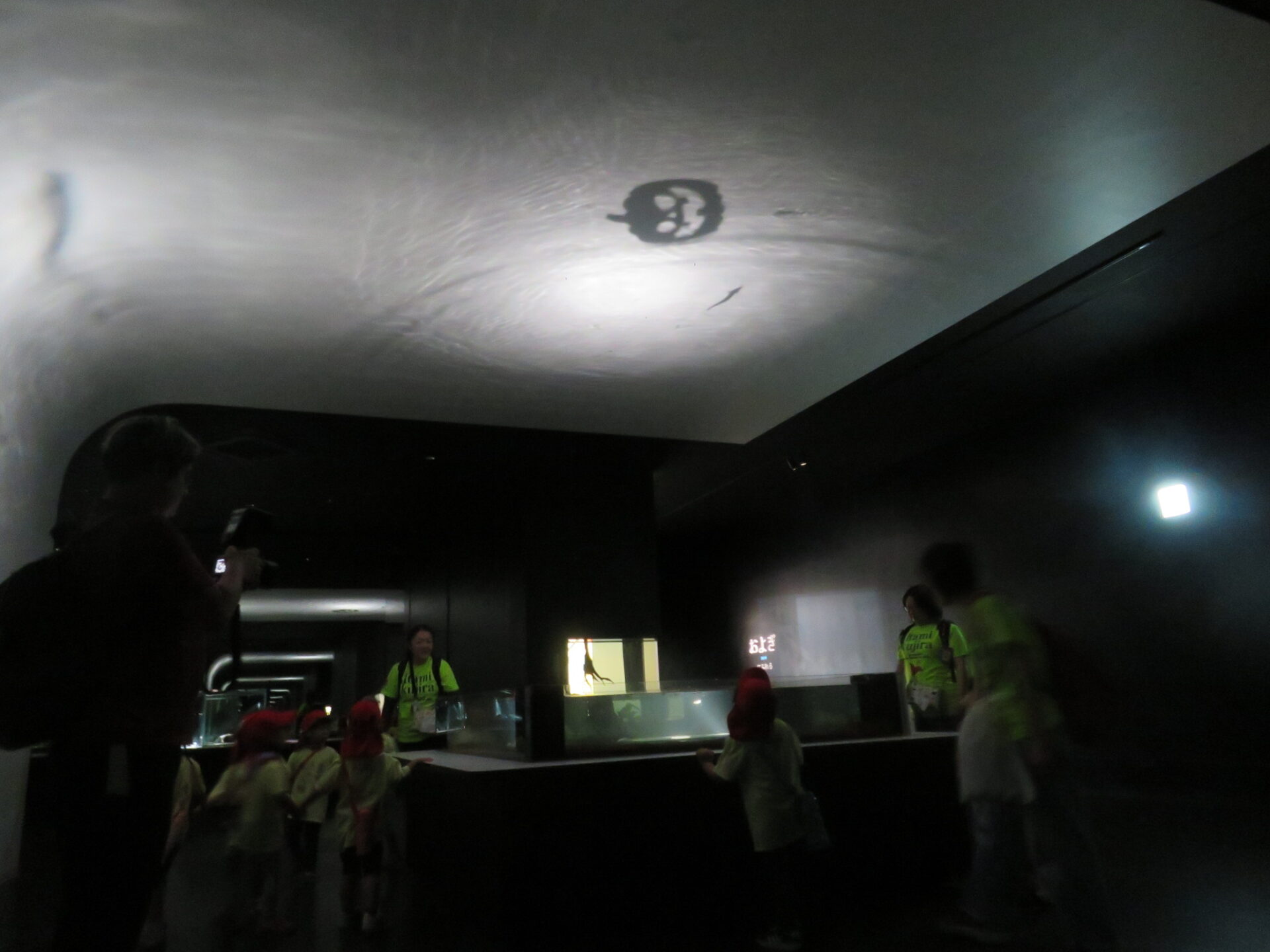 明るいブースから、いきなり暗くなる為、「大丈夫かな?」と不安そうにしていましたが、光の魅力に気がつくと、保育士の側を離れてお友だちと水槽を見て回っていました。