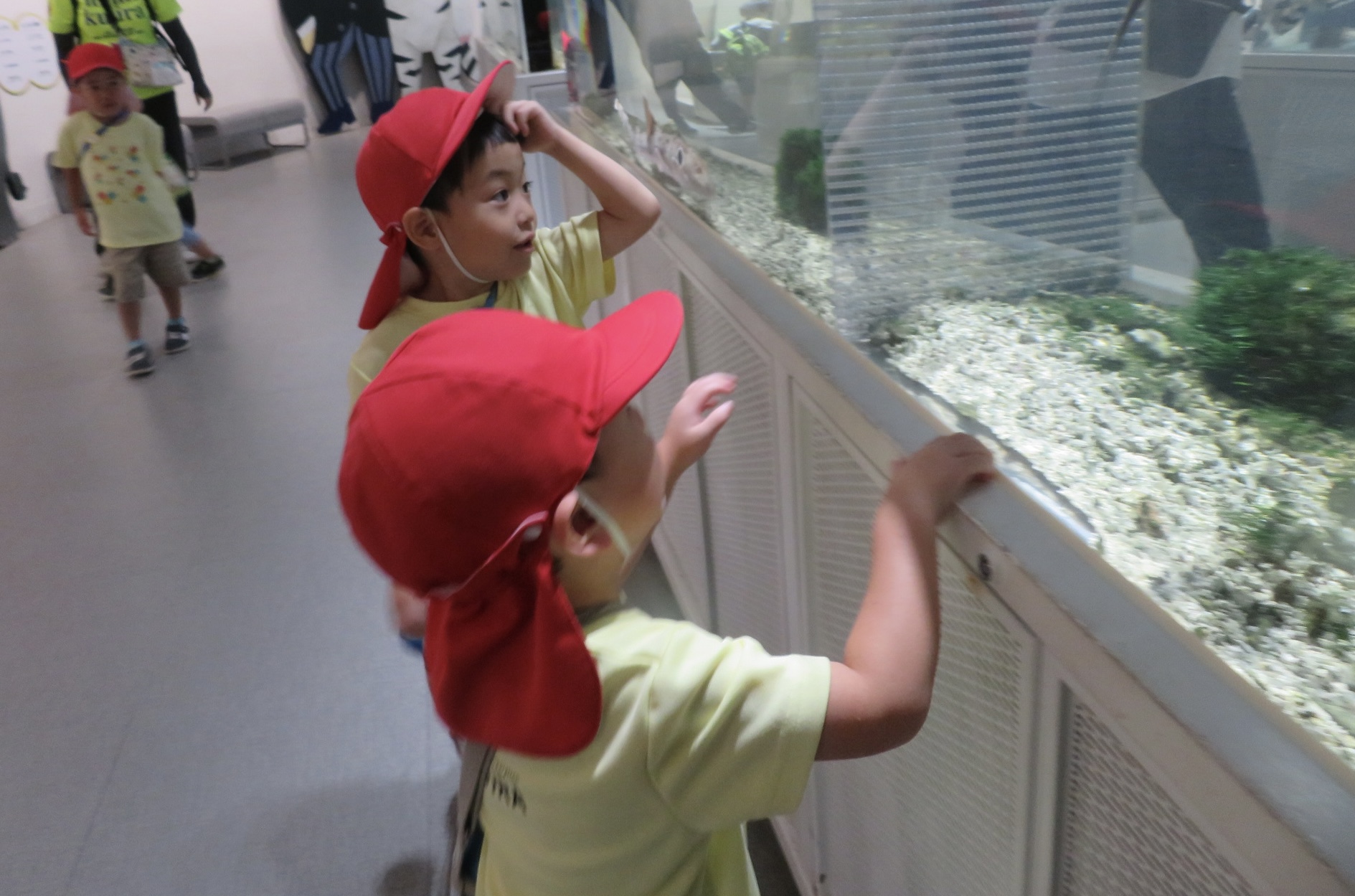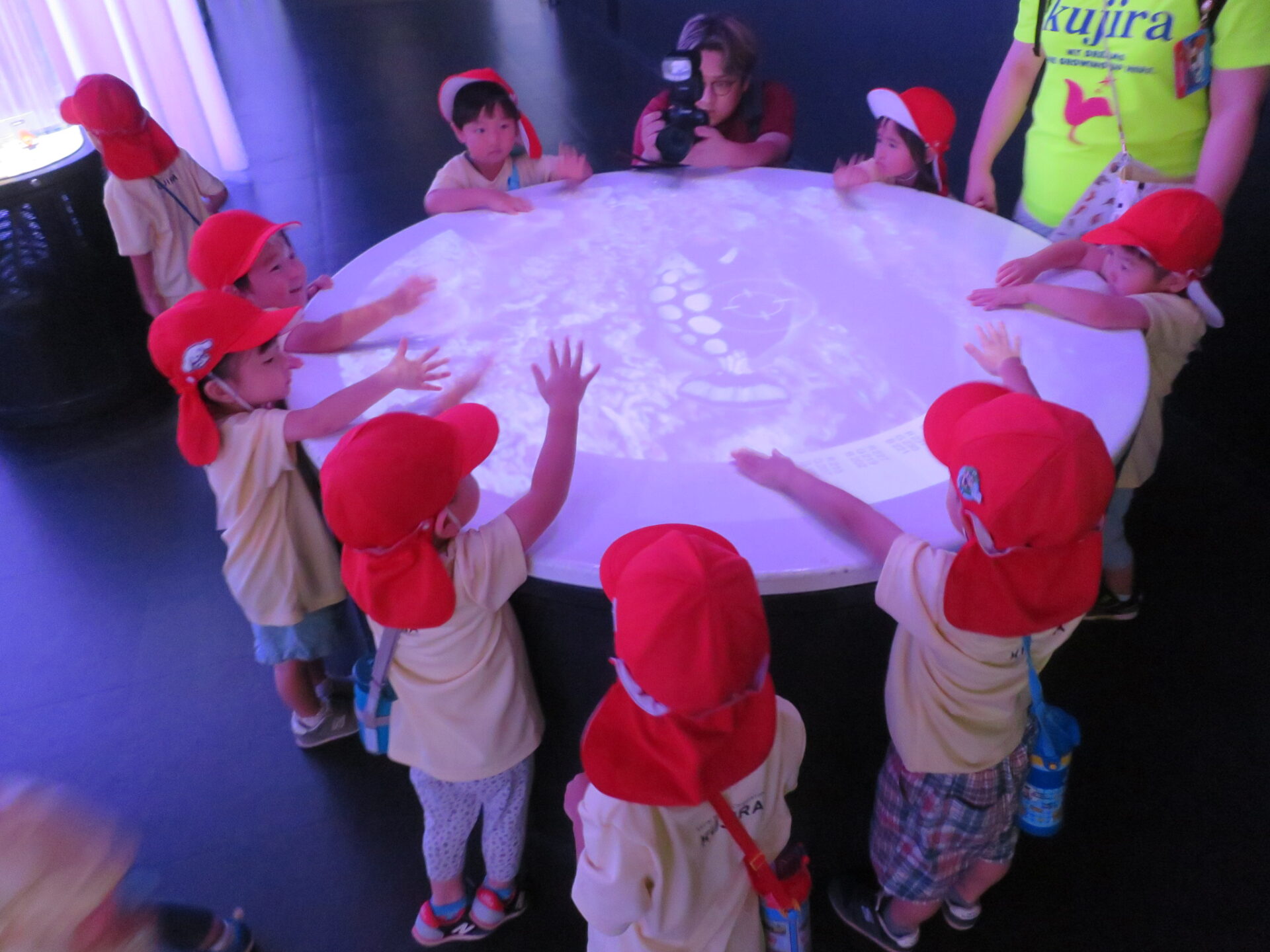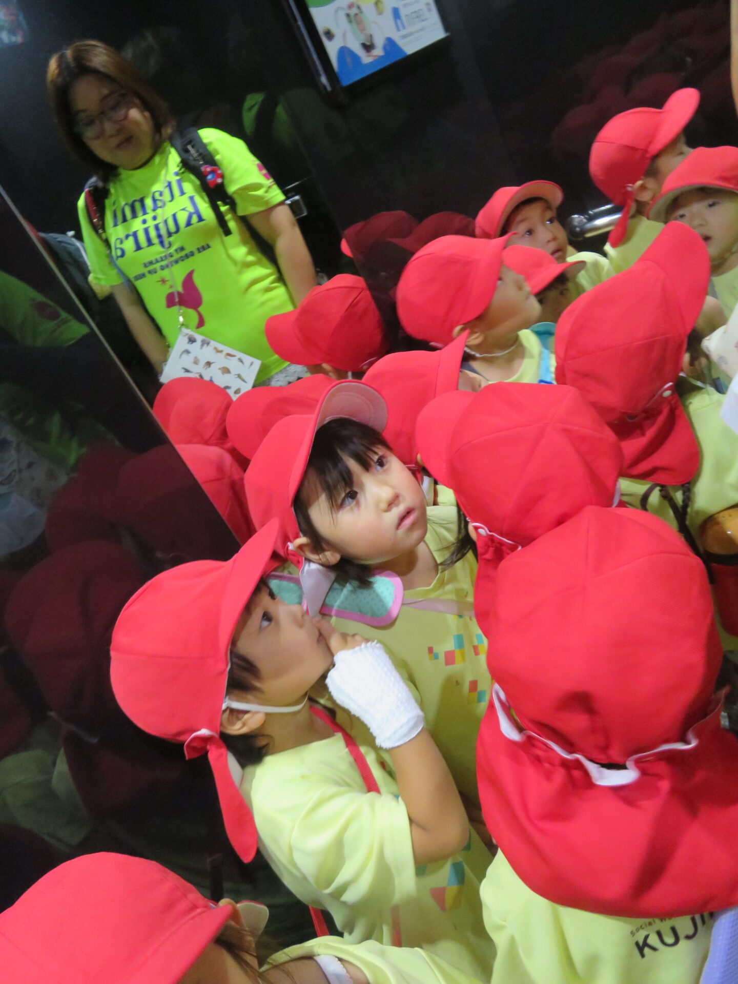 明るいブースから、いきなり暗くなる為、「大丈夫かな?」と不安そうにしていましたが、光の魅力に気がつくと、保育士の側を離れてお友だちと水槽を見て回っていました。