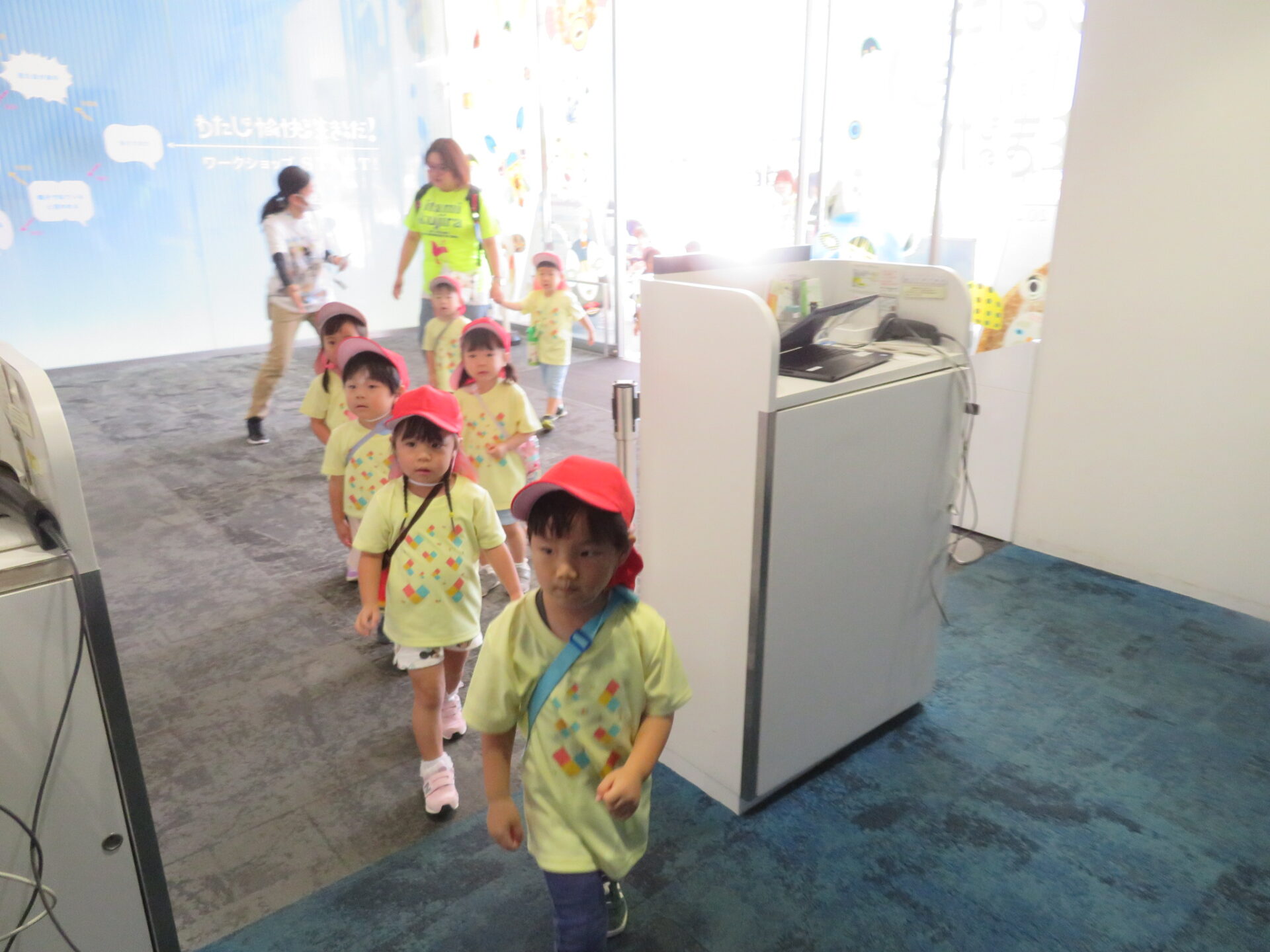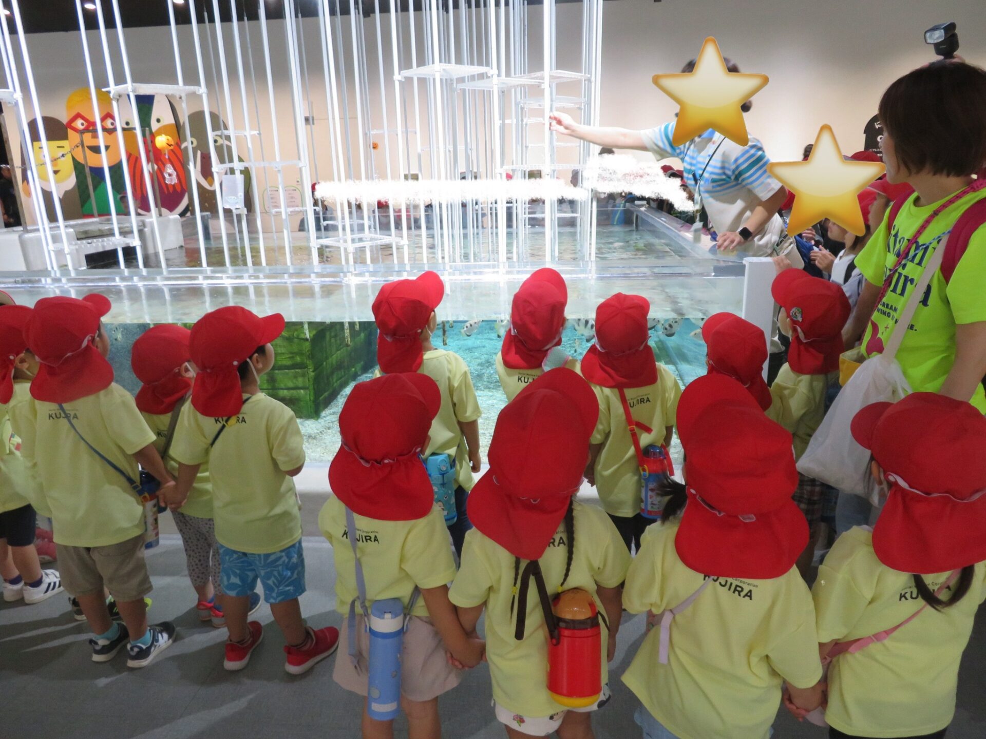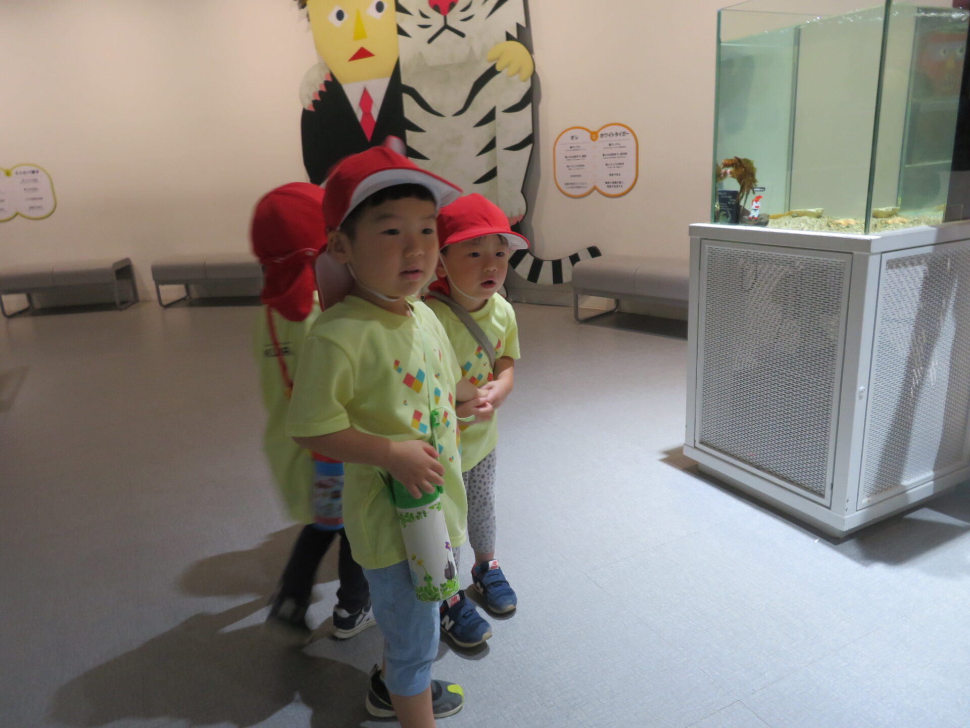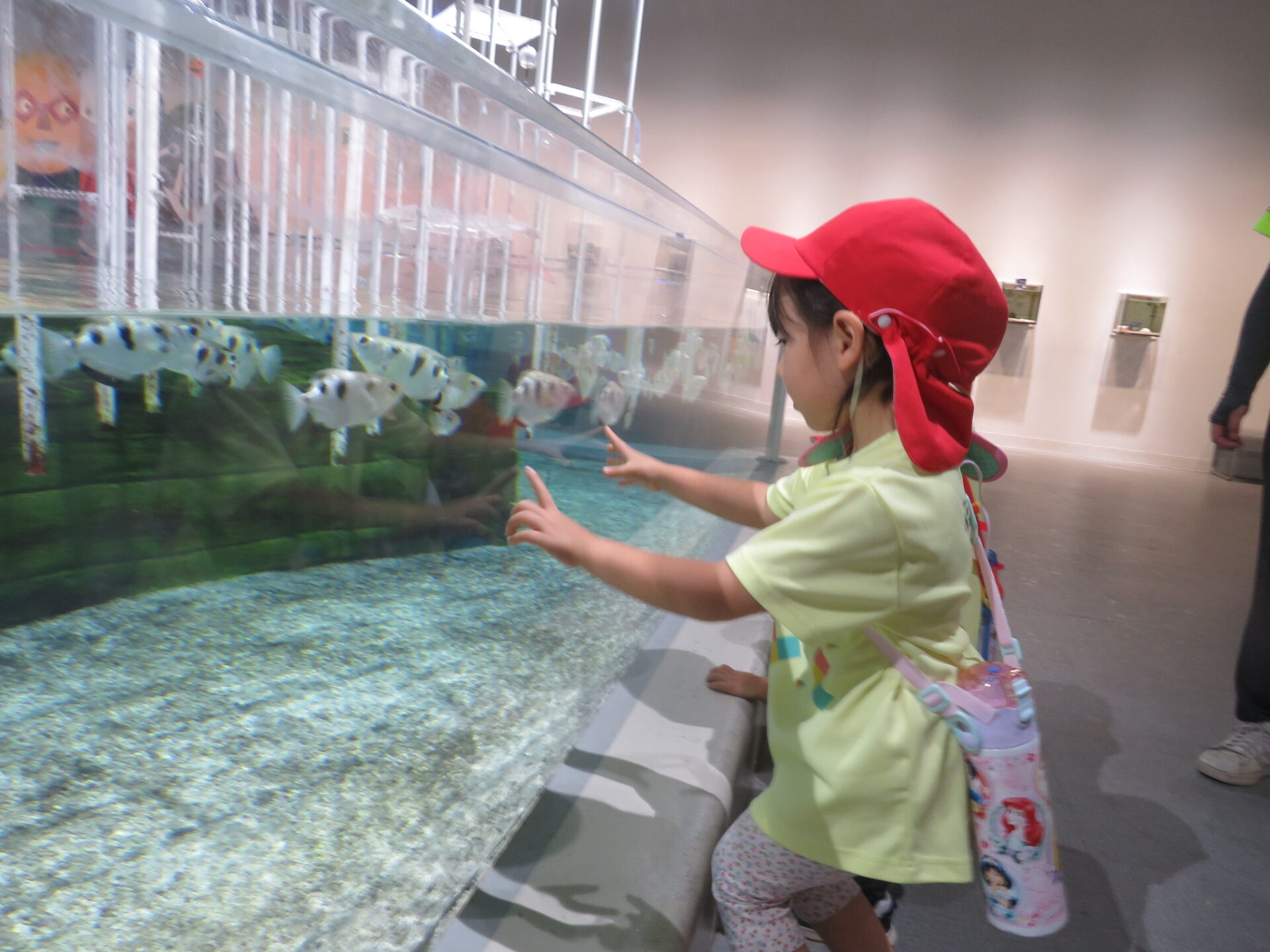 明るいブースから、いきなり暗くなる為、「大丈夫かな?」と不安そうにしていましたが、光の魅力に気がつくと、保育士の側を離れてお友だちと水槽を見て回っていました。