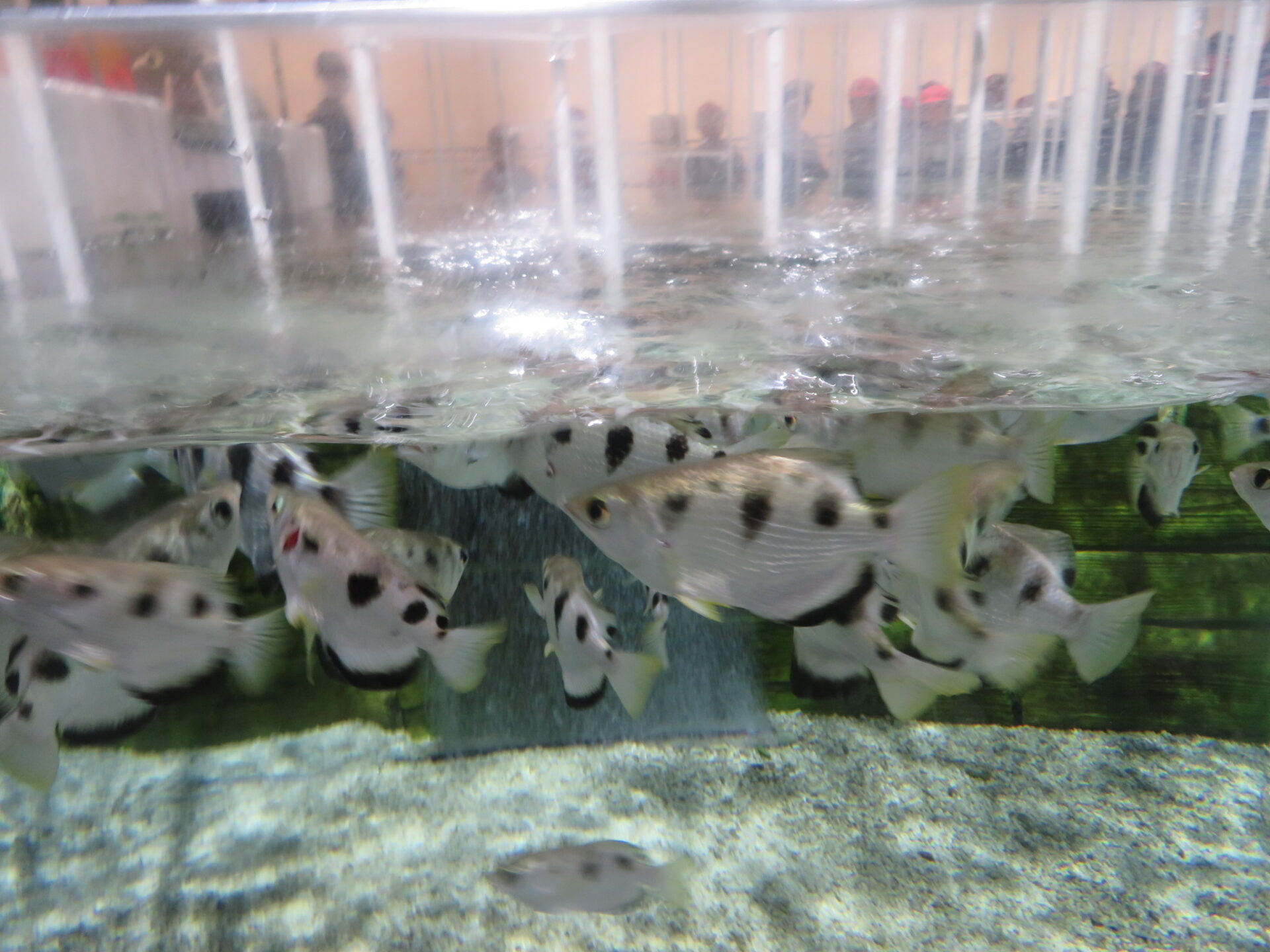 すると、テッポウウオが水を吹き出し餌を下に落としていました。