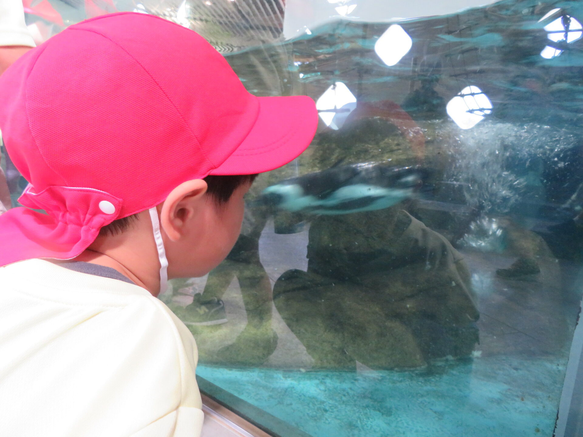 凄い速さで水中を泳ぐペンギンを発見し、「泳いでる!」と嬉しそうに観察していました。