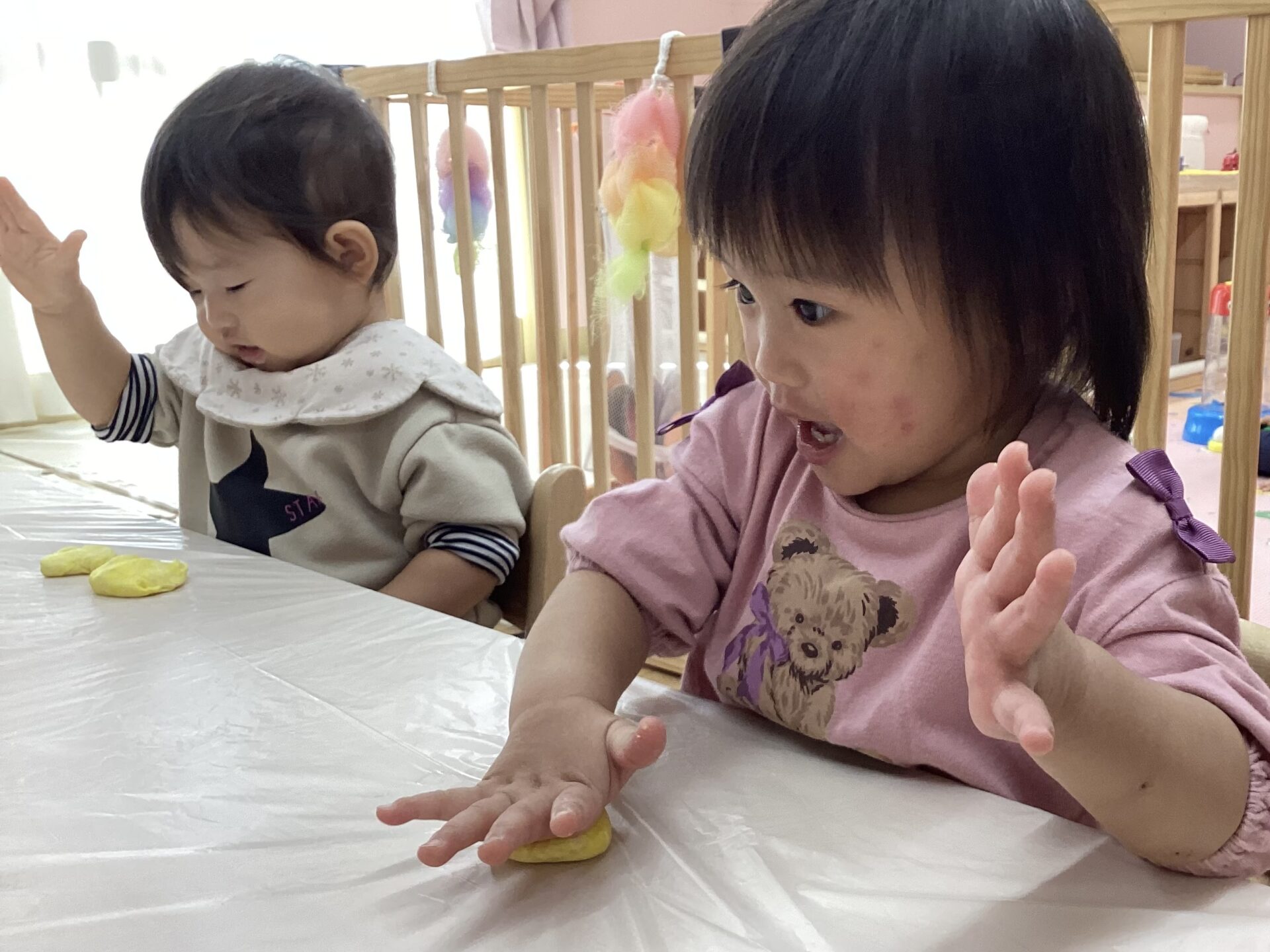 最後は袋から出して手で感触を味わいました。スイートポテトをイメージして丸めたり、平たくして形を作ってみました。