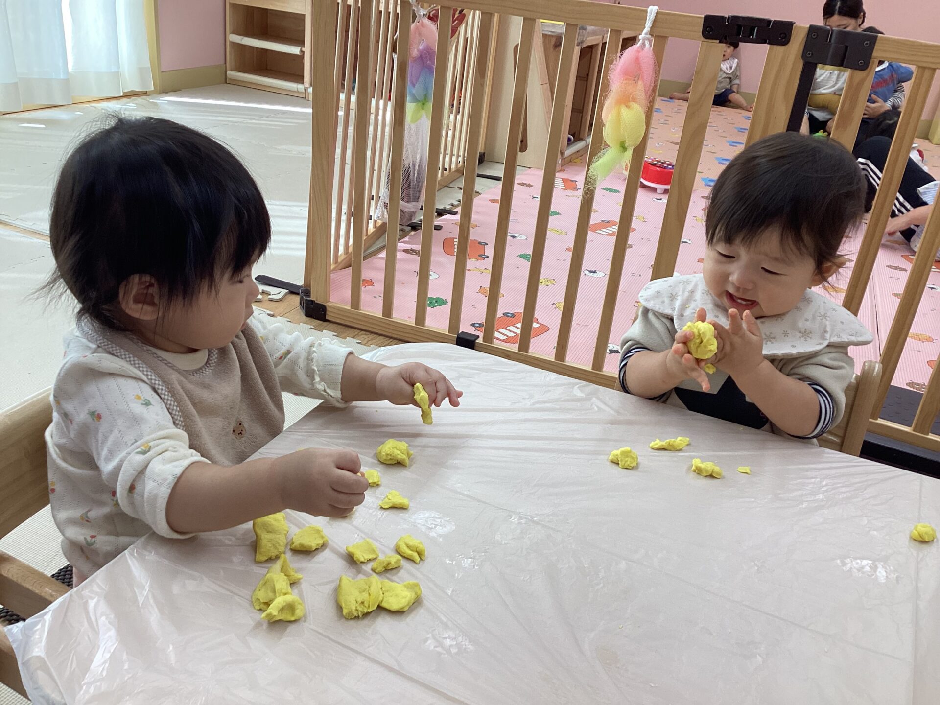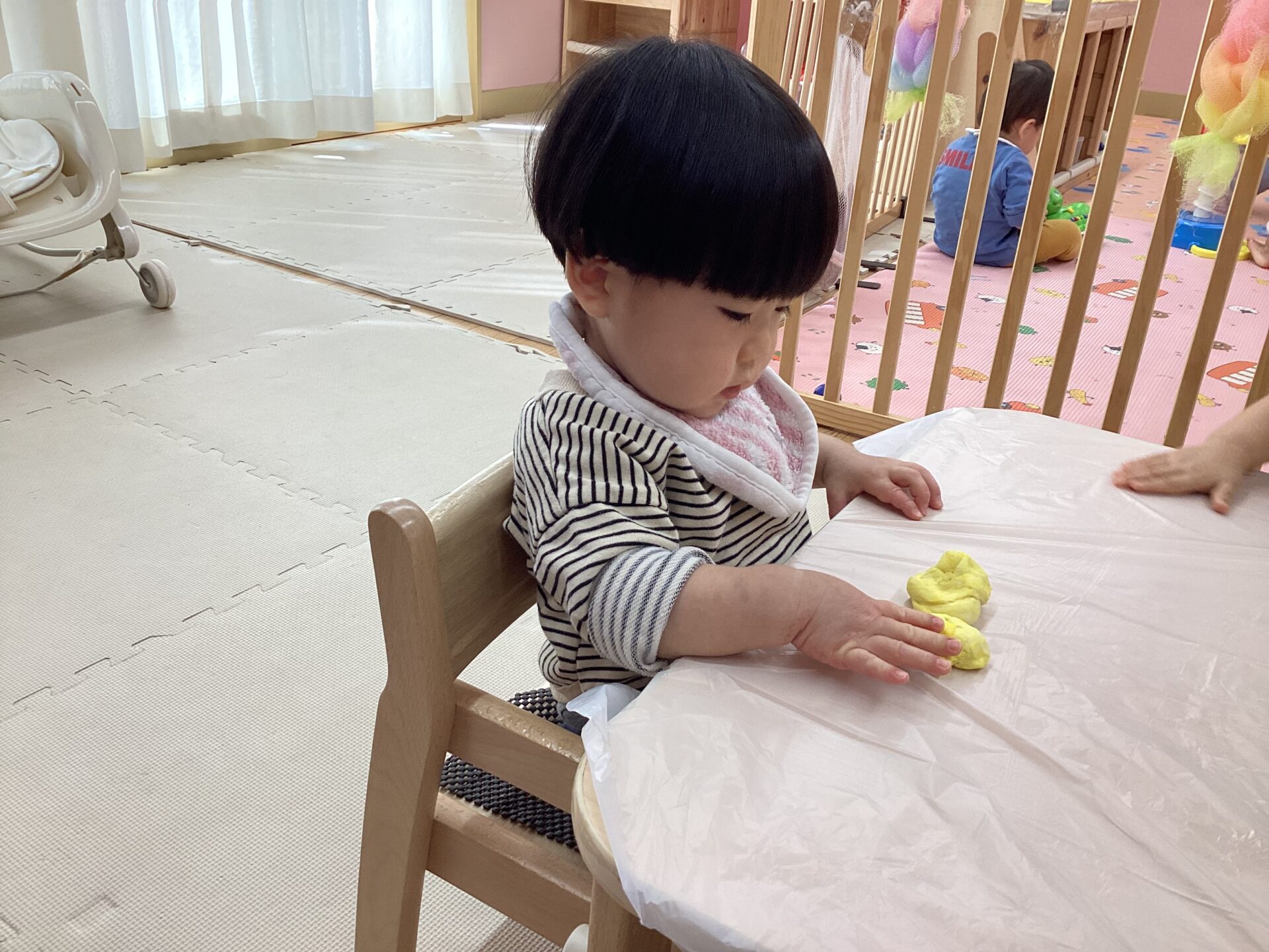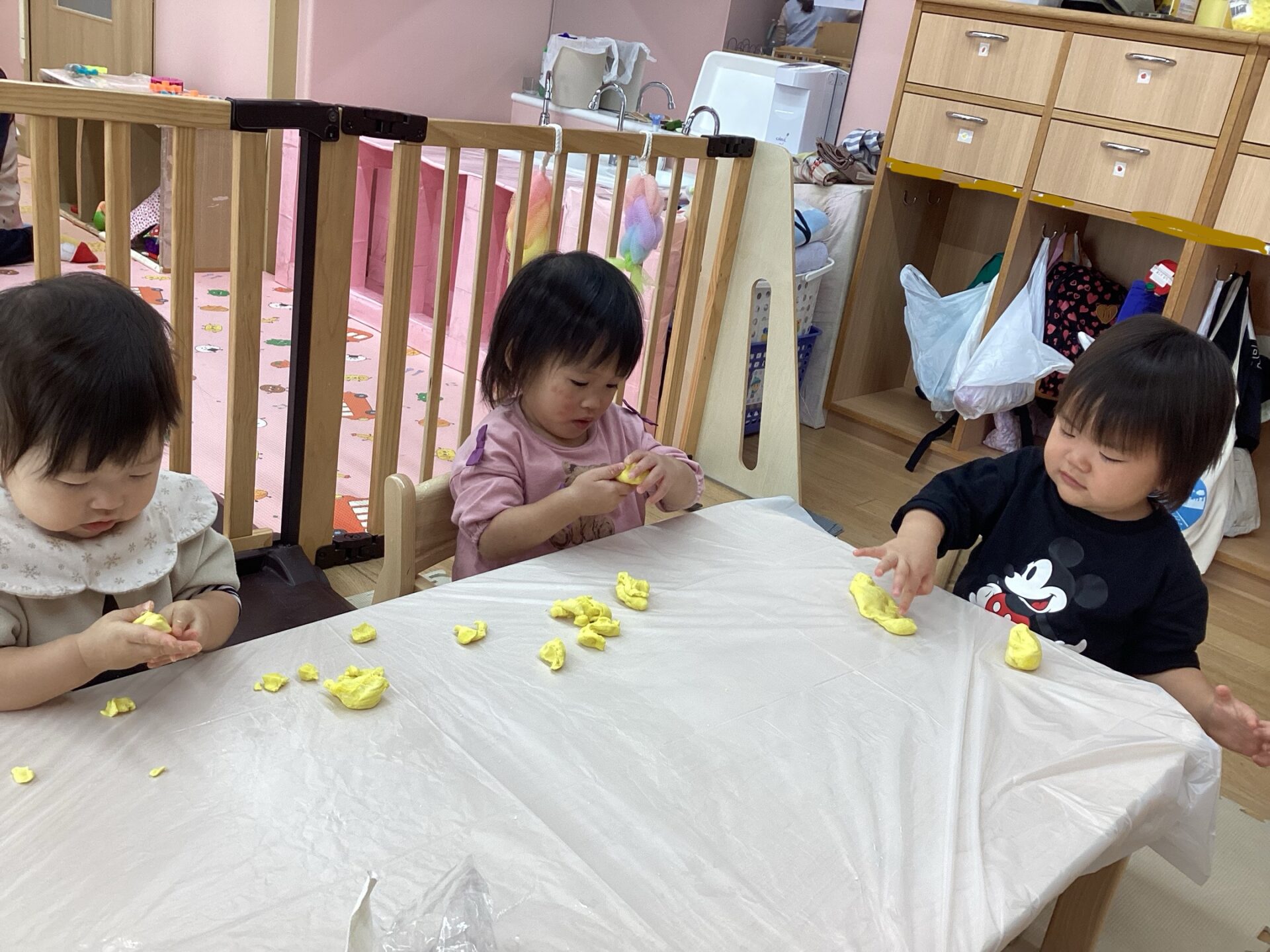 いつもは白い小麦粉粘土なので初めてみる黄色の小麦粉粘土に興味深々。初めはクッキングの工程にもあるジプロックの上から揉んだり、潰すをイメージしてジプロックの上から感触を味わいました。