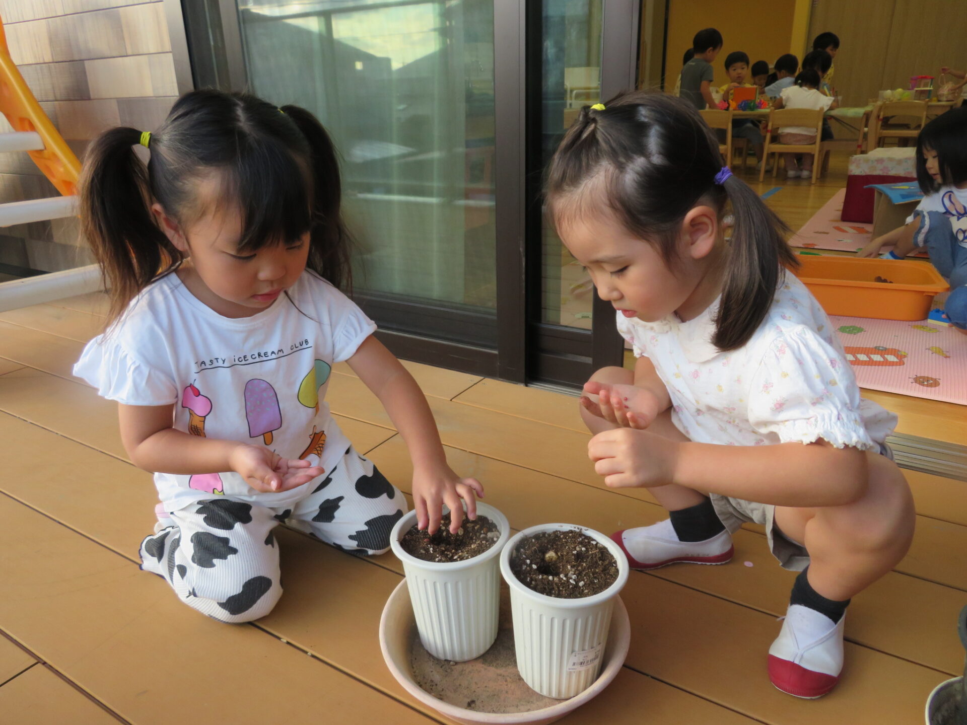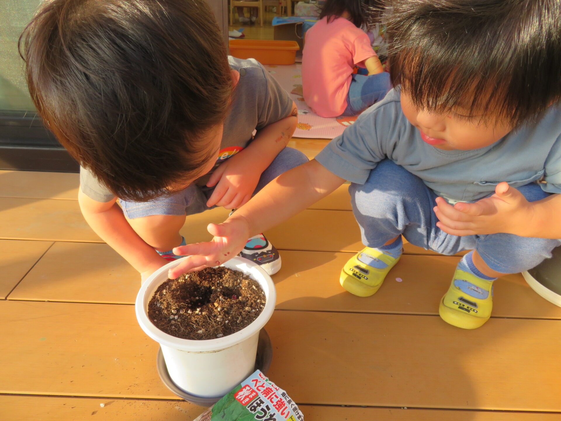 「やってみようか!」「出来る、出来る!」と友だちと励まし合い、諦めずに種植えを成功させていました。