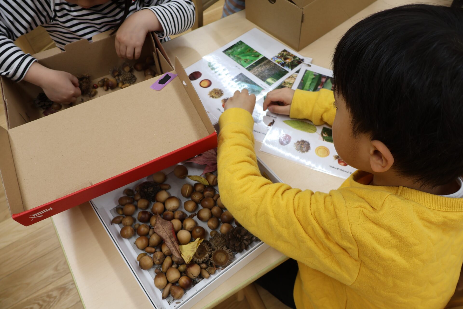 くじら組の子どもたちは、どんぐり図鑑を使って“どんぐり調べ”にも挑戦しました。