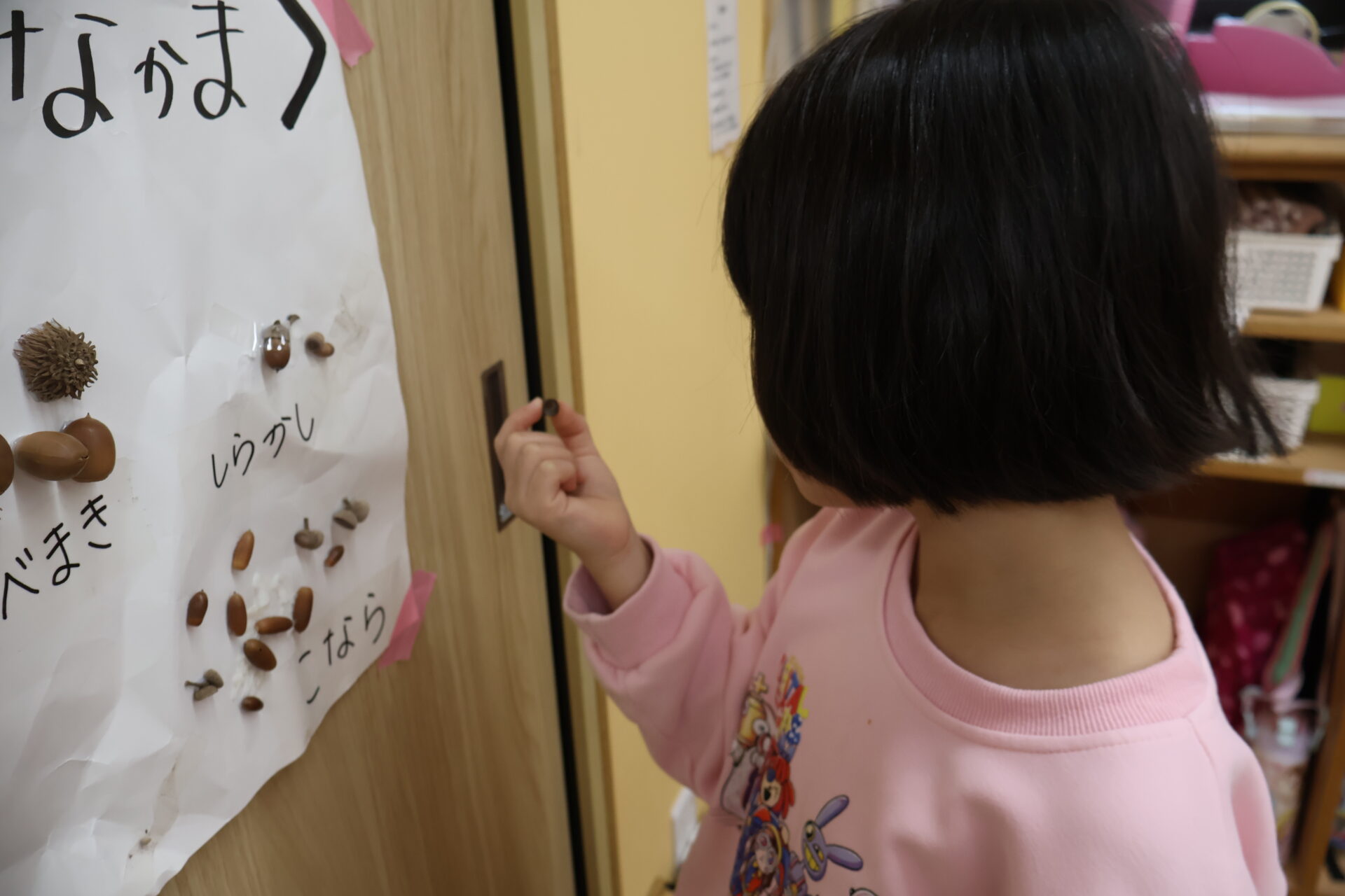 「この帽子の形は、コナラだ!」とどんぐりの形だけでなく、帽子の形もよく見ている子どもたちでした📝