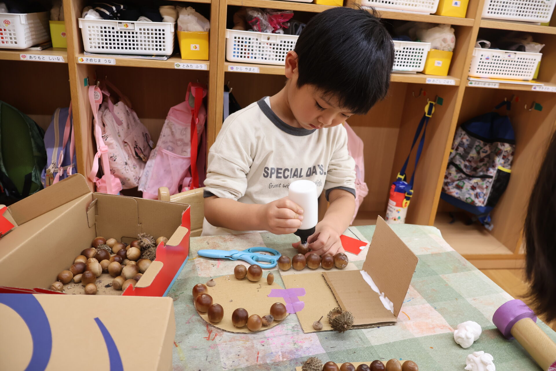 同じ落ち葉やどんぐりでも遊び方や作りたいものが違い、子ども達の発想の豊かさに驚くことの多い活動となりました。